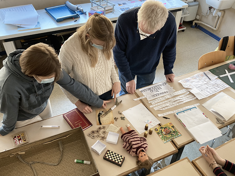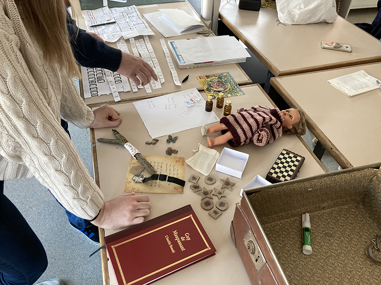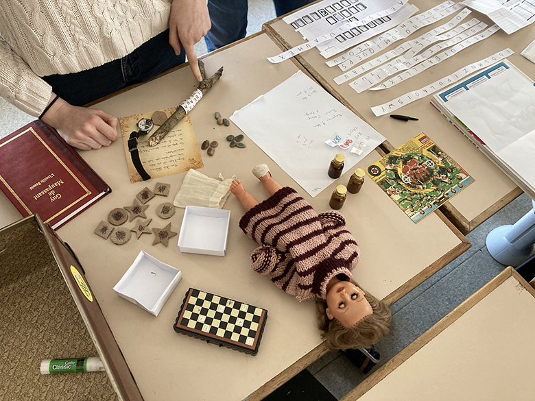 C’est parti pour continuer sur cette voie. Nous nous lançons alors dans l’écriture du pitch puis dans la réalisation du squelette des énigmes. Chacune réalise un squelette que nous tentons par la suite de réunir pour en faire un plus complet. Tâche fastidieuse qui ne nous conviendra finalement pas. Nous adoptons alors une autre stratégie qui consiste à ce que chacune réalise une ou deux énigmes selon ses sensibilités et à partir des objets que nous avons récupéré un peu partout pendant les vacances.