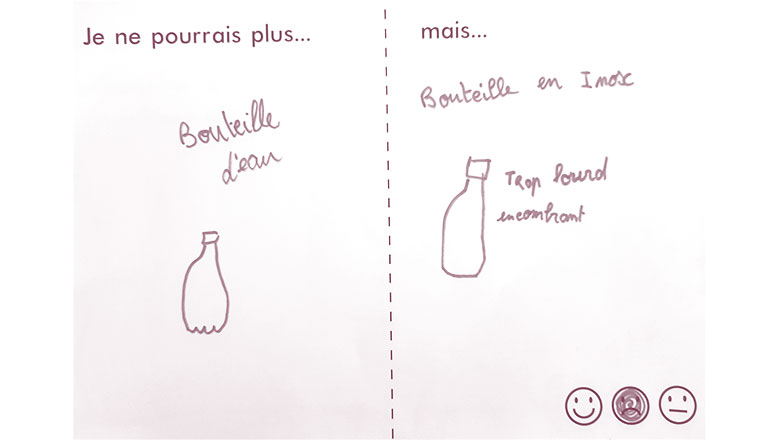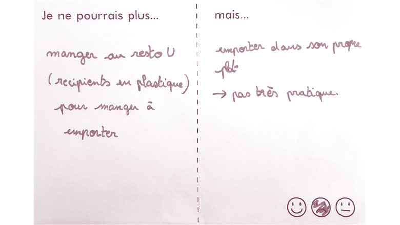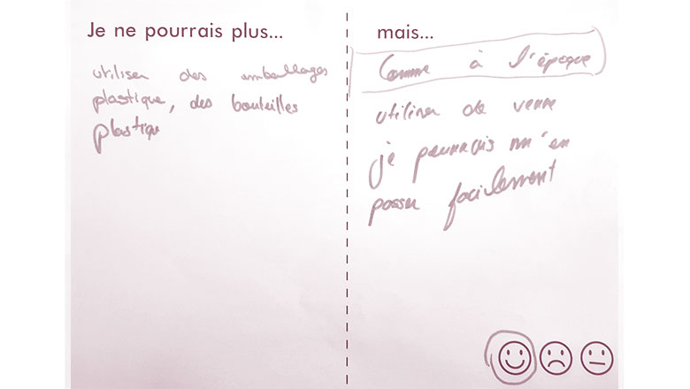 Pour que les passants y répondent de manière guidée, nous avons imaginé des fiches-réponses avec à la gauche une colonne permettant à l’usager de identifier un objet en plastique (donc polluant) et à la droite les alternatives à ces objets. Nous avons ajouté des vignettes à colorer permettant de signifier si l’objet de remplacement conviendrait au passant.
