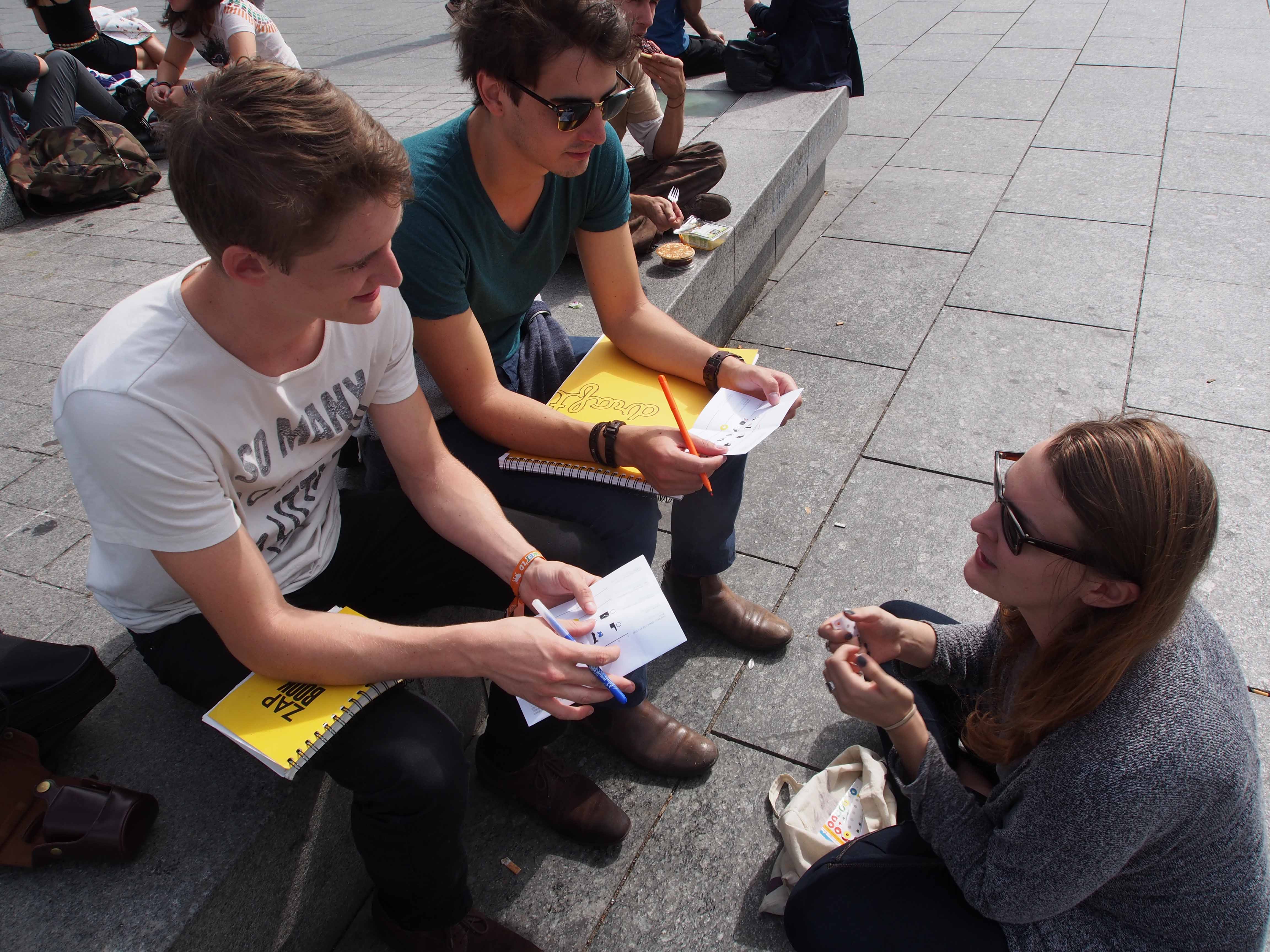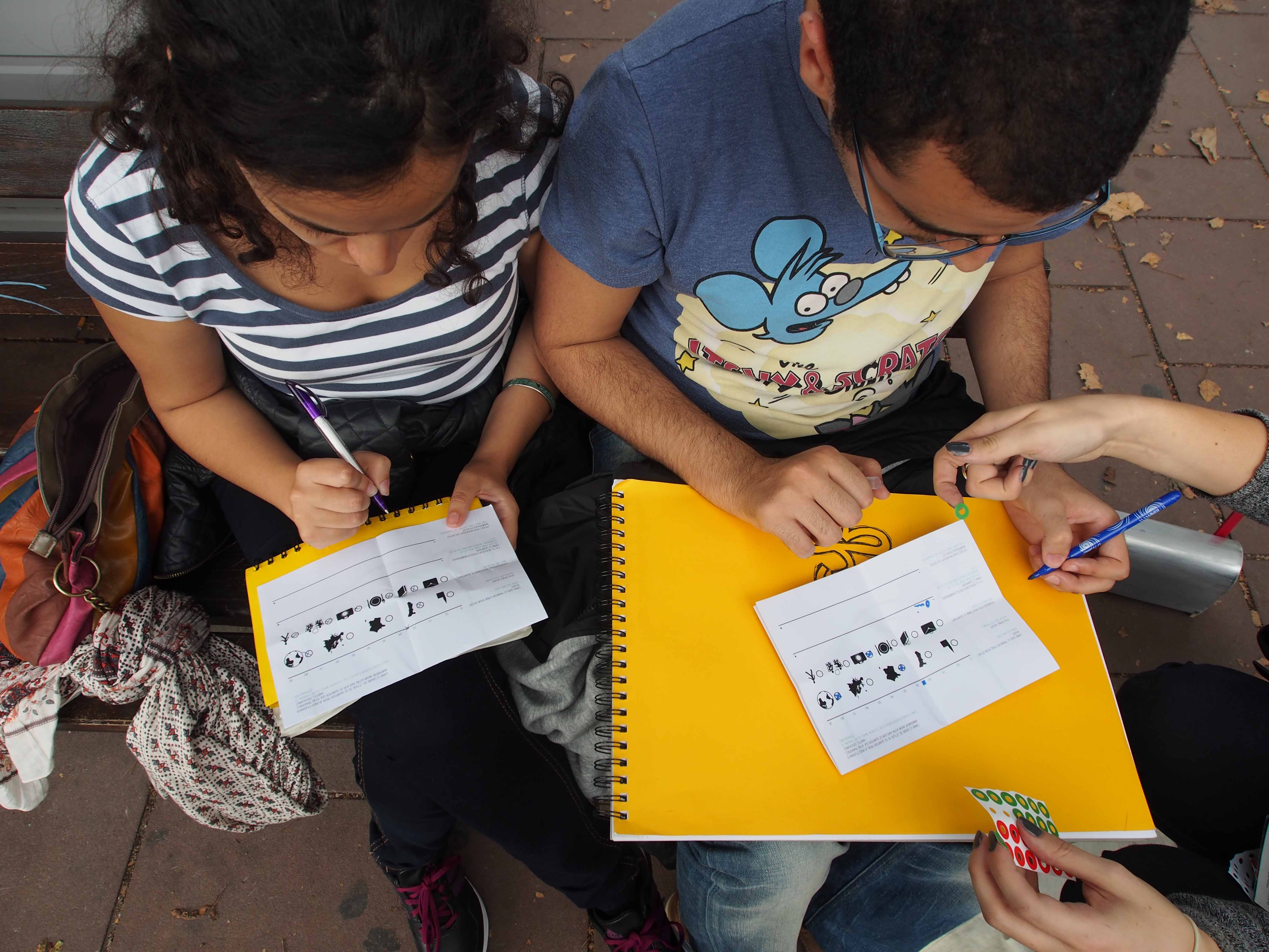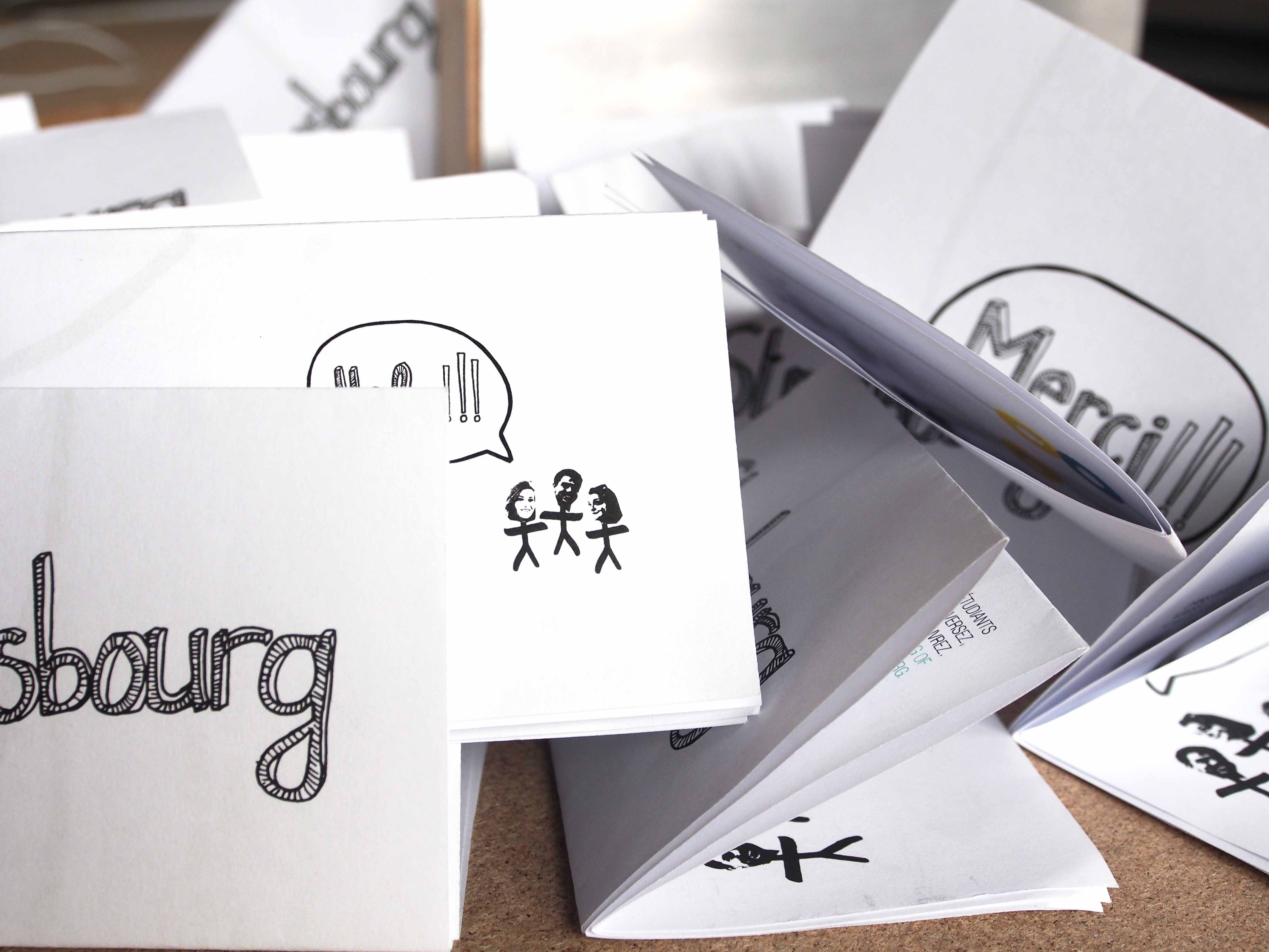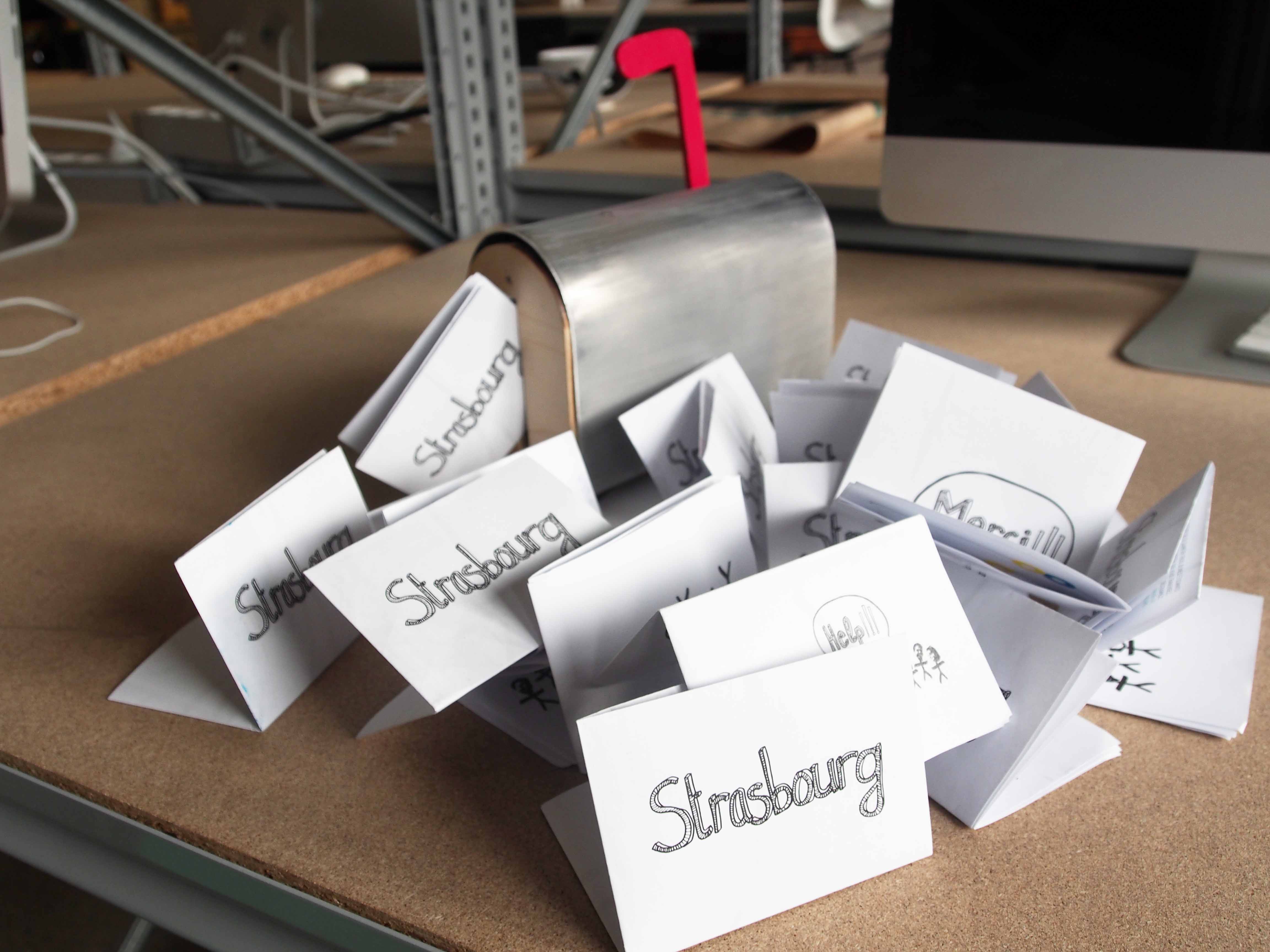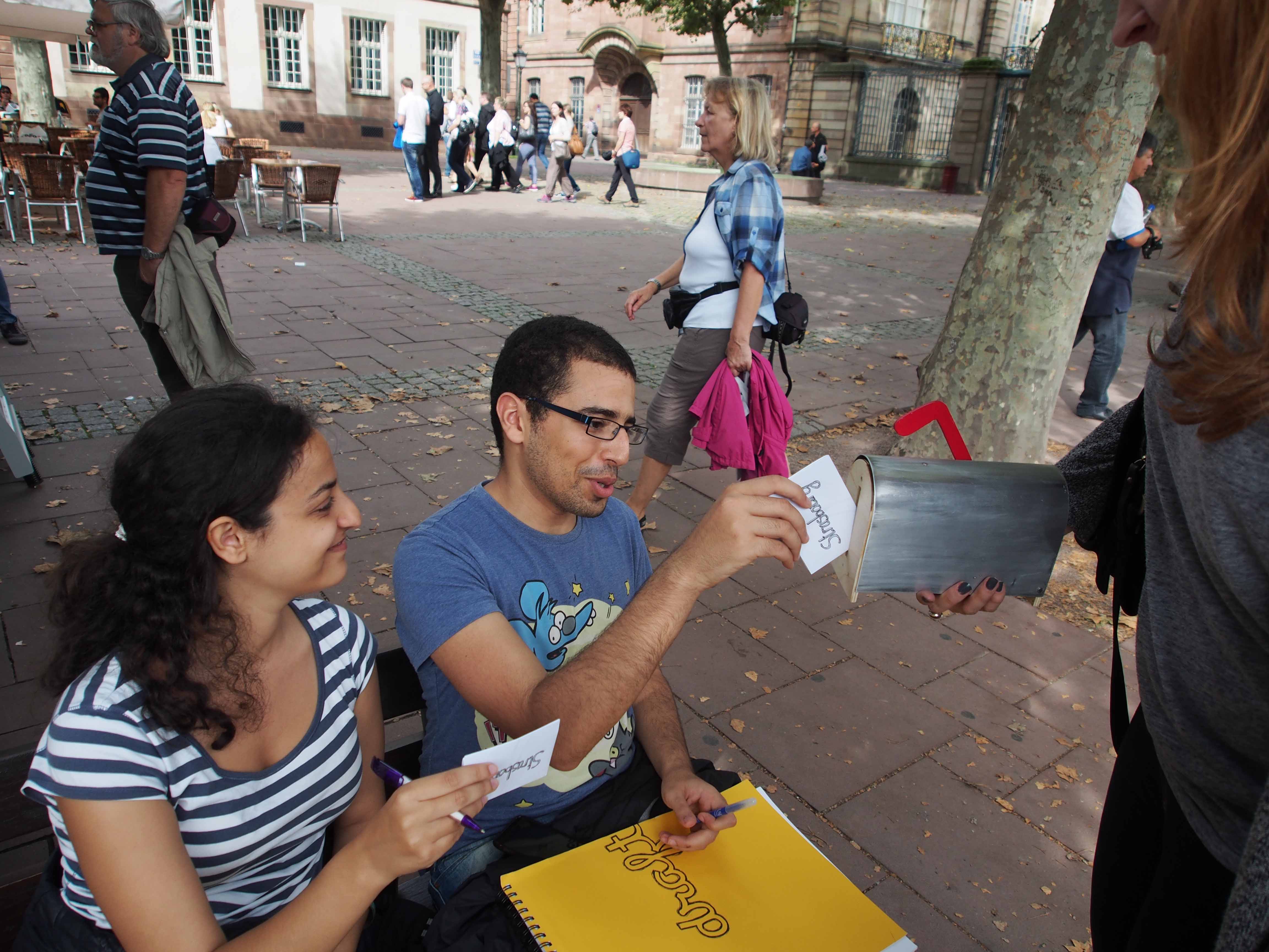 Vos trois jeunes étudiants aventureux sont partis, ce vendredi 19 septembre, à la rencontre de l’autochtone Strasbourgeois et des touristes avec qui ils cohabitent dans la Grande île. Equipé de notre boîte aux lettres, de nos gommettes et de nos petits questionnaires nous nous sommes tout d’abord rendu dans la classe de 1ere Littéraire spécialité arts plastiques du lycée Fustel de Coulanges. Notre secteur comprenant 4 lycées, l’avis de ces jeunes nous a semblé important. Puis nous sommes allés à la rencontre des Strasbourgeois et des touristes dans les rues de l’hyper centre.
