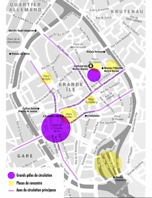 Constat et pistes de recherches Les investigations menées la semaine passée nous ont permis d’observer plusieurs choses: – Les Strasbourgeois aiment leur ville et aiment en parler, nous avons eu droit à toute sorte d’anecdote, de petites histoires et de dessins sur leurs lieux préférés. – Les visiteurs de quelques jours apprécient la ville et sa découverte mais aimeraient connaître d’avantage les endroits du quartier que préfèrent les locaux. Ces derniers ont également mis en évidence que la découverte de la ville nécessite bien souvent l’achat de guides et de visites guidés où une longue série de recherches au préalable sur internet. – L’hypercentre est un quartier ou la signalétique manque grandement. Bien que la cathédrale puisse sembler être un véritable phare pour la ville, nos touristes ont bien du mal a la repérer lorsqu’il se trouve à proximité, l’office de tourisme se trouvant à ses pieds nos amis visiteurs nous ont avoués s’être plus d’une fois égaré! – La carte papier et le portable sont les deux moyens les plus utilisés pour se repérer par les visiteurs – Nous avons également constaté que les trajets des touristes se concentrez sur la partie sud de l’île et que les strasbourgeois ne profitez pas pleinement du quartier et se contentait bien souvent que de le traverser. Ces constatations nous ont permis de dégager trois pistes Autour d’une même thématique, (Re)Découvrir la ville d’une autre manière.