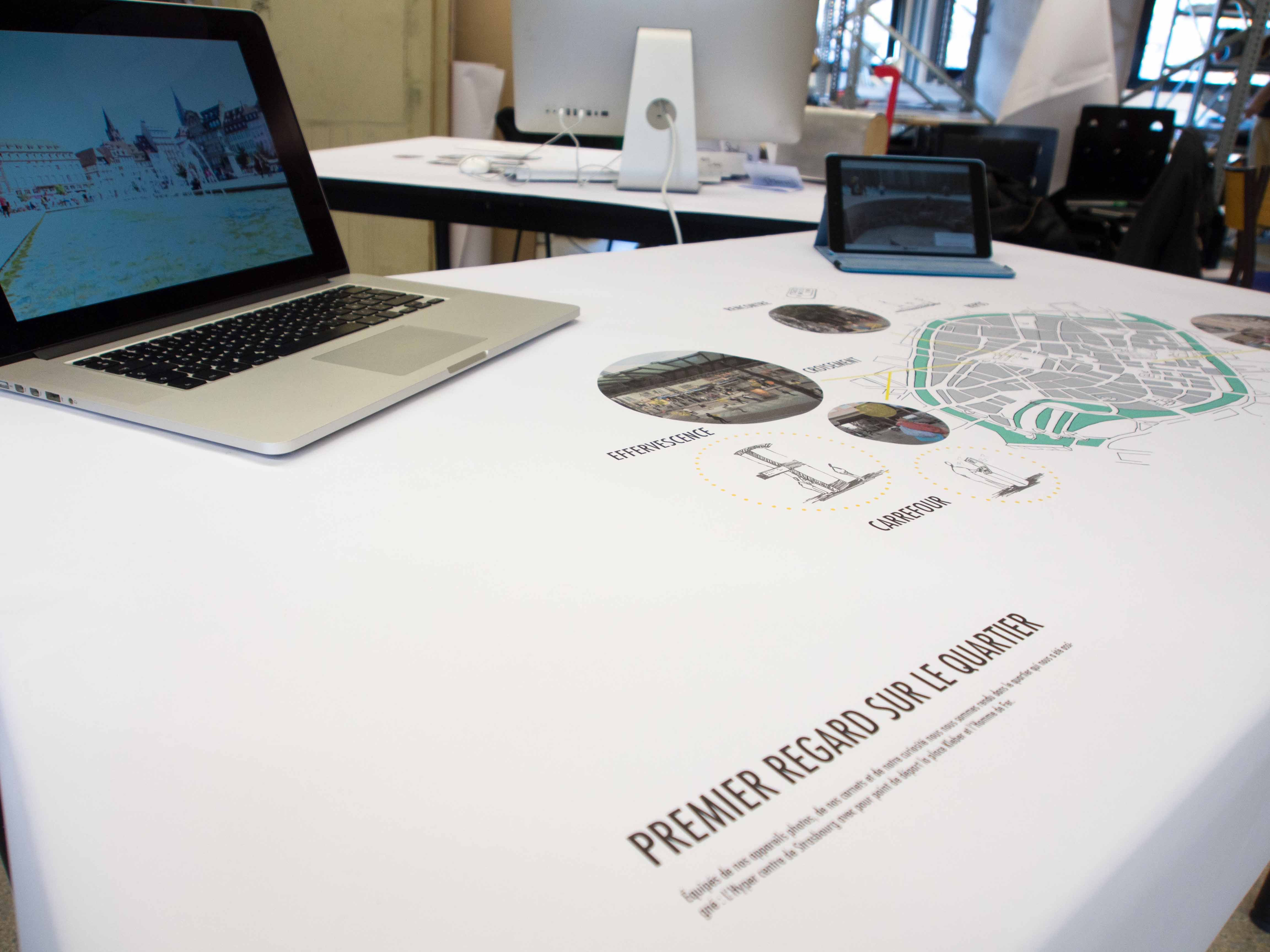 Pour créer un échange nous avons utilisé un premier outil brise glace, un petit questionnaire. Après avoir établi rapidement leur profil (âge, lieux d’origine, raison de leur présence dans le quartier), nous les avons questionné sur leur visions du numérique et l’usage de ces outils dans la ville. Bien que certains soit réfractaire ou ait quelques difficultés à définir ce qui pour eux est un « outil numérique », la plupart possèdent un Smartphone et apprécient les quelques installations mis en place par la ville, tel que le panneau d’information place de l’homme de fer, outils qu’ils aimeraient voir se développer d’avantage. Nous les avons également invité à partager avec nous a travers quelques mots ou un petit dessin ce qu’ils aiment dans le quartier, ce qui les a marqué. Nous avons été surpris par l’entrain de chacun à partager avec nous toutes ces petites histoires.