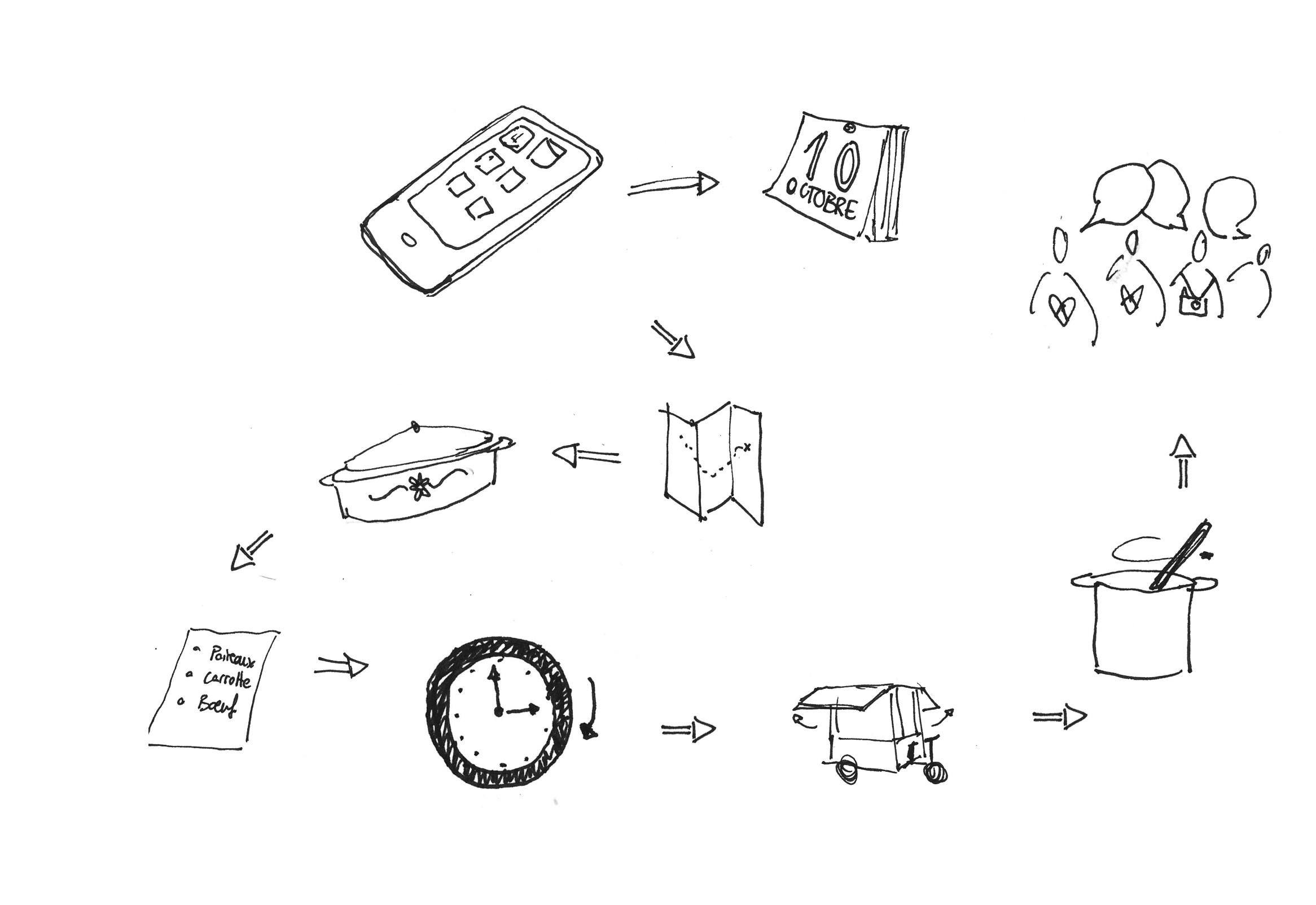 Cette semaine nous nous sommes penchées sur différentes idées de projets à partir des axes énoncés: – Se réapproprier l’audio guide. Les audio guides actuels sont souvent peu sensible, se contentant des faits historiques, notre idée est de le rendre plus humain. La ville serait alors racontée par ses habitants, chaque lieux étant propice à une histoire personnelle mais aussi à l’Histoire avec un grand « H » tel qu’ils l’ont vécu ou perçu. – Faire de la découverte de la ville un jeu, autour d’une application qui propose une chasse aux trésors dans le quartier. Des petits jeux et une carte qui pousse les touristes à sortir des chemins habituellement empruntés pour aller à la rencontre des petits trésors culturels strasbourgeois. Des activités proposées via l’application sur chaque lieu visité pousse le touriste à aller questionner le strasbourgeois, ouvrir un dialogue, créer un échange. – Pousser les locaux et les touristes à se retrouver autour d’un élément fédérateur : Un bon repas. Une application sur laquelle les Strasbourgeois peuvent proposer des cours de cuisines autour d’un plat régional, cette application est associée à une cuisine mobile. Le Chef du jour est donc invité à choisir le lieu dans le quartier où se déroulera l’atelier cuisine. Ici le numérique devient un support, un premier pas pour une rencontre physique, un partage culinaire. C’est cette dernière piste que nous avons décidé de développer. À bientôt pour plus de détails sur notre cuisine ambulante.