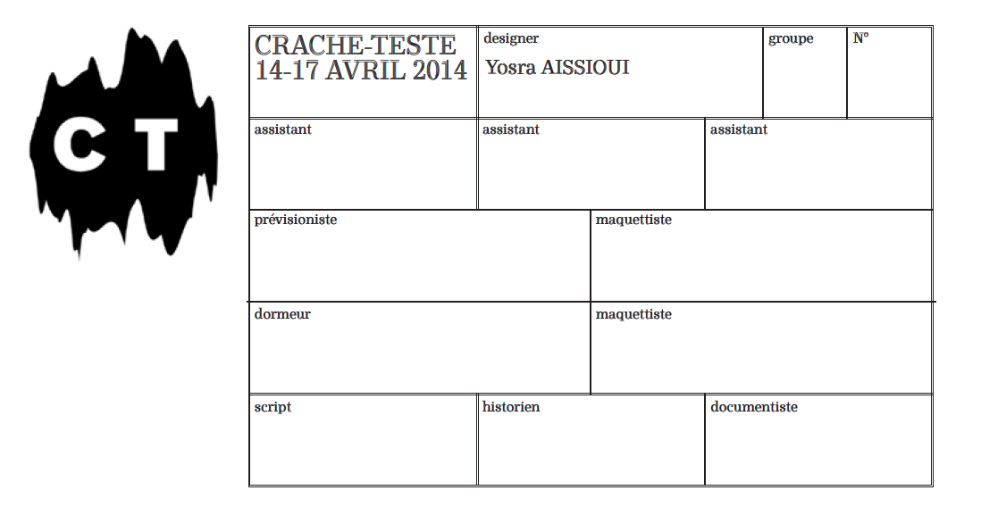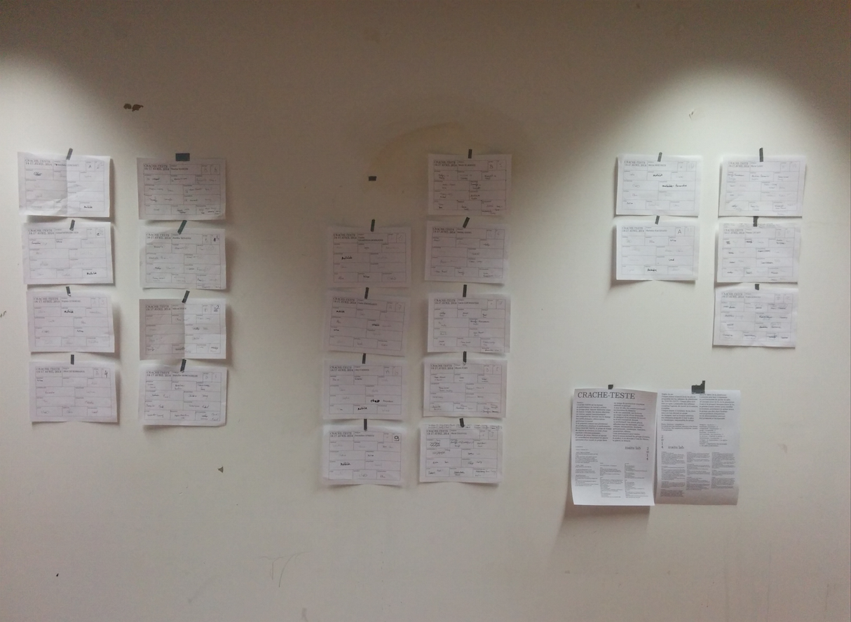 CRACHE-TESTE est un format de performance du travail à activer en groupe pour investir différents corps de métier, remplir des tâches effectives ou oisives, gagner instantanément des compétences, inventer sur le champ des méthodologies collaboratives, performer le travail.