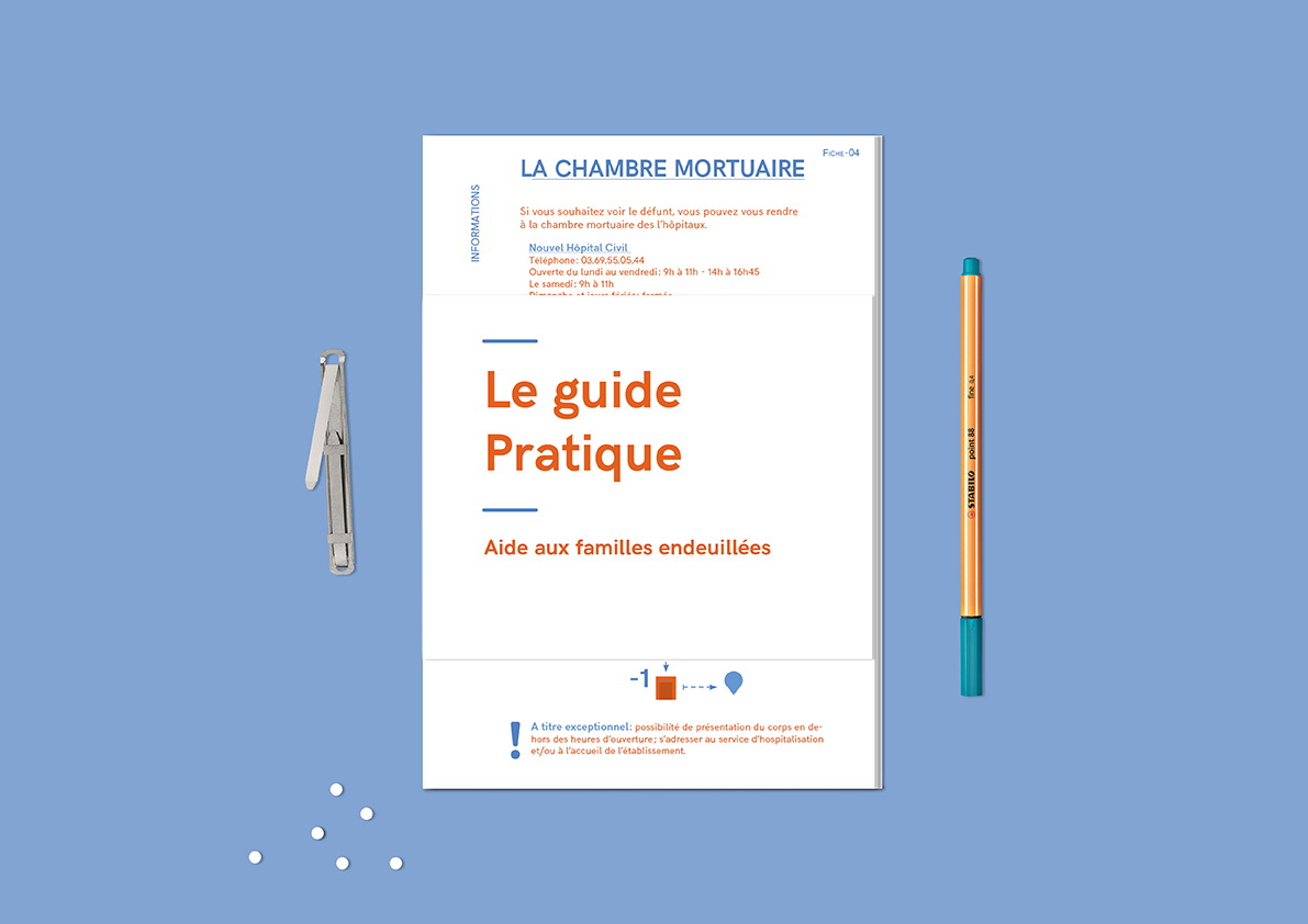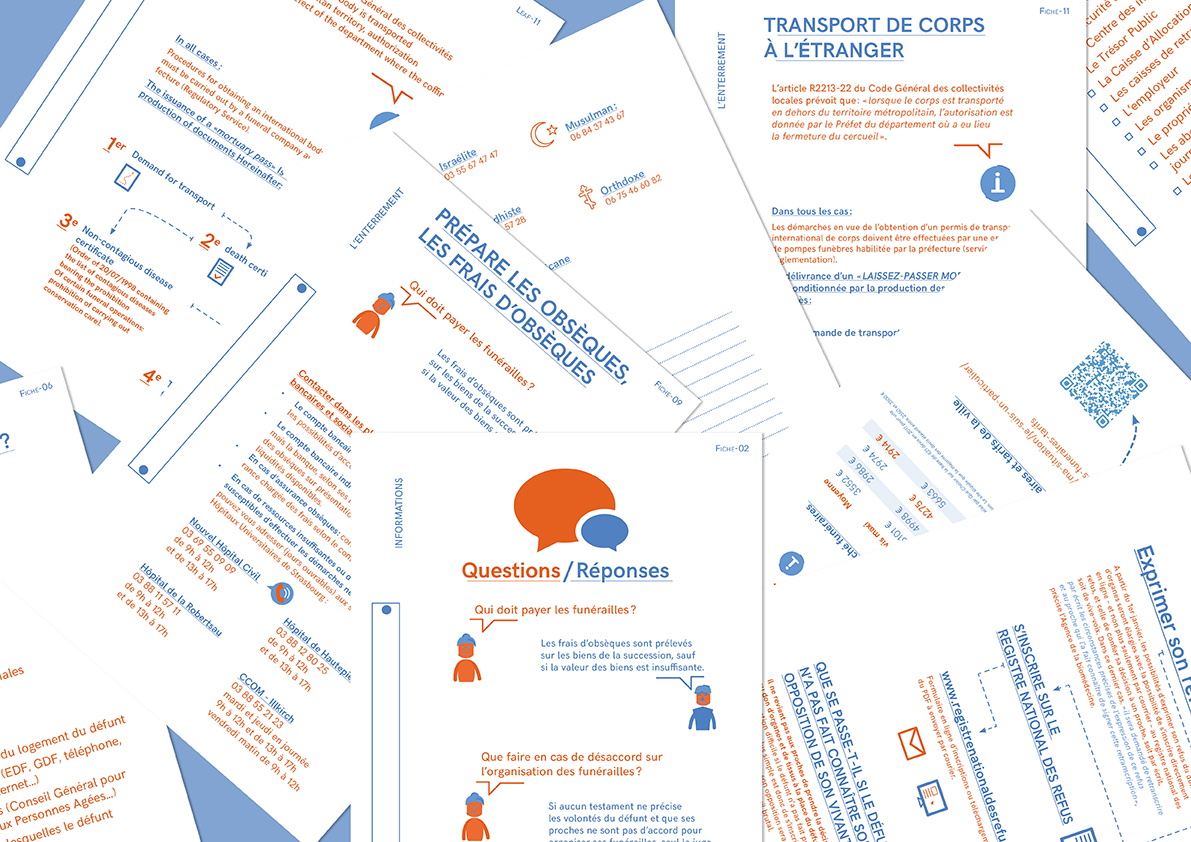 Par ailleurs, pour pouvoir appréhender la mort administrative sereinement, un petit guide personnalisable est à assembler au fur et à mesure des parcours dans l’hôpital. Différentes fiches informatives sont disponibles pour constituer une aide et un suivi précieux pour gérer les transitions entre les étapes du parcours.