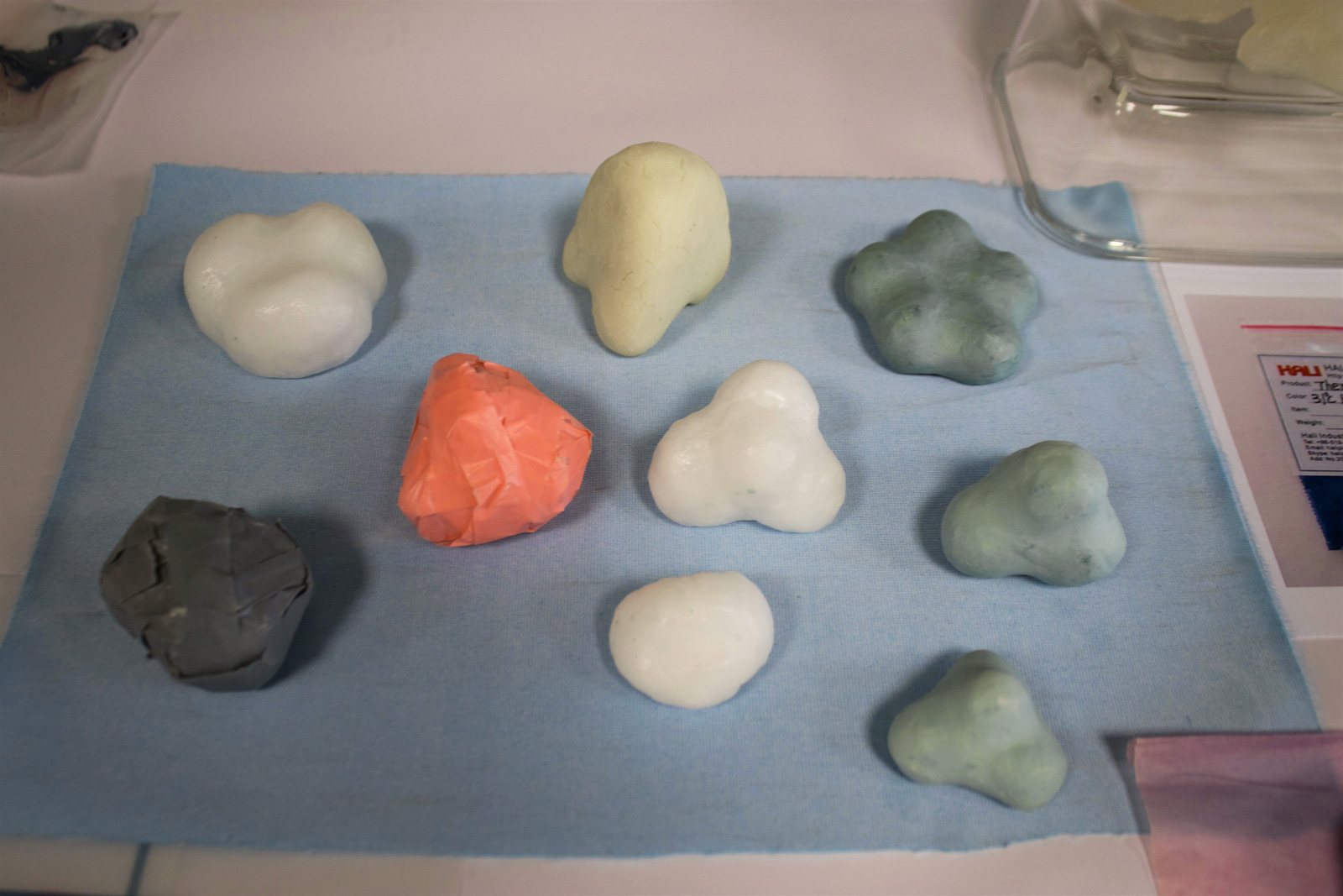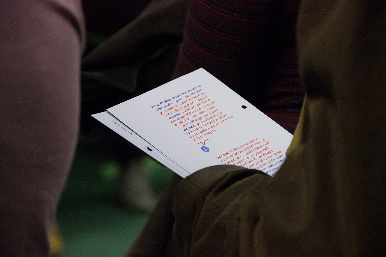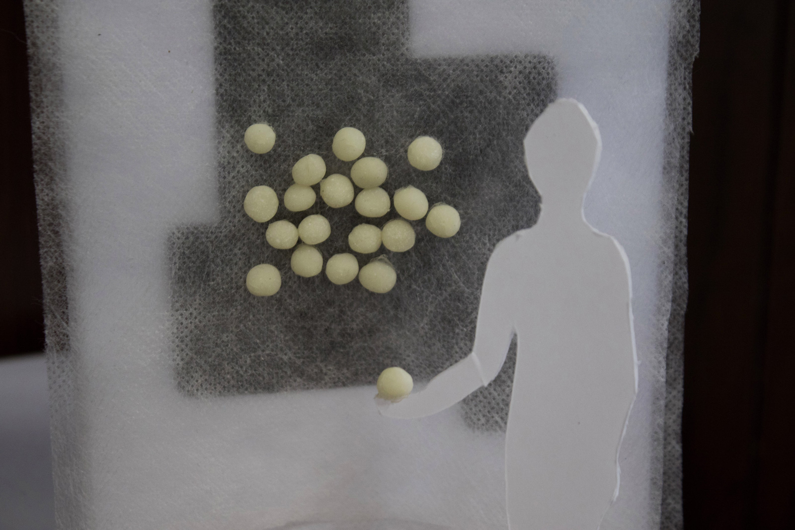 21 grammes – L’objet “21 grammes” est à récupérer dans la salle d’attente. Cet objet de réconfort change de couleur, s’éclaircit, avec la chaleur (d’une main par exemple). Les visiteurs peuvent garder les 21 grammes avec eux ou les déposer sur le mur de l’espace de transition à la sortie, en vue de créer une accumulation réconfortante et chaleureuse. Le geste est symbolique, déposer sa peine, dépasser le chagrin.