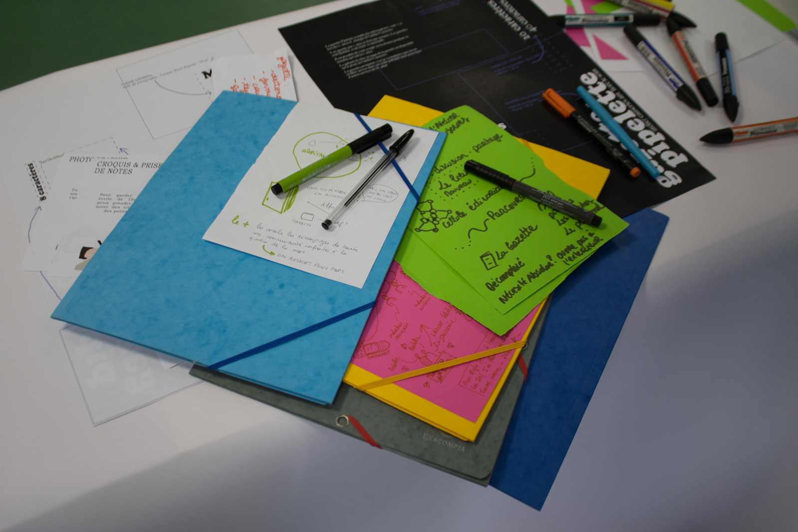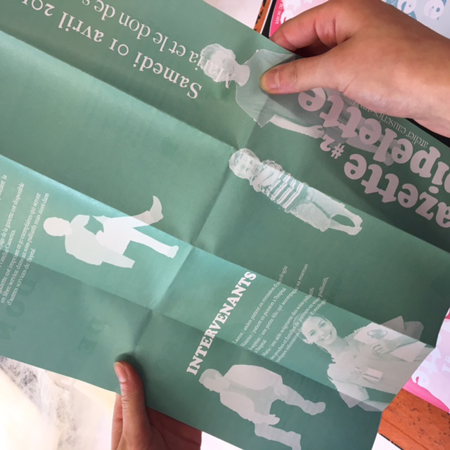Cet espace est organisé en plusieurs îlots distincts auxquels sont attribués des étapes de création de traces et d’éléments afin de créer une gazette qui compile toutes les informations collectées. C’est la gazette Pipelette. Cette gazette est éditée après chaque atelier, soit un par semaine. Son principe de création est pensé pour être en entière autonomie, avec les éléments créés par les acteurs de l’espace.