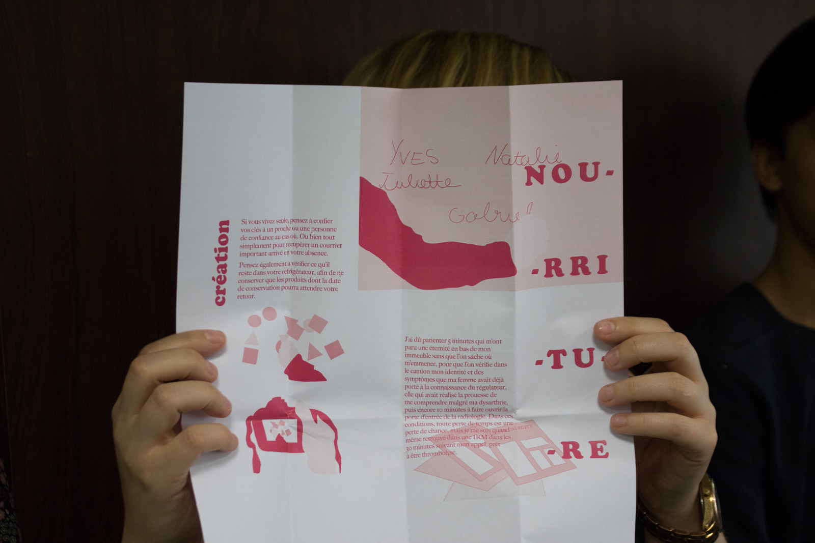 “Vivre avant de mourir” est un projet qui traite des rapports entre patients, personnel hospitalier et accompagnants. Suite à nos observations, nous avons constaté que le patient, par sa prise en charge médicale se déconnecte de son mode de vie : il ne dispose plus d’espace privé défini, la majorité de ses discussions sont ponctuées de termes médicaux, et l’omniprésence des horloges le met en position d’attente de sa mort. “Vivre avant de mourir” propose ainsi 3 projets distincts qui prennent place et cohabitent dans des soins palliatifs. Nous avons donc orienté nos recherches sur la qualité de vie du patient notamment lors de la visite.