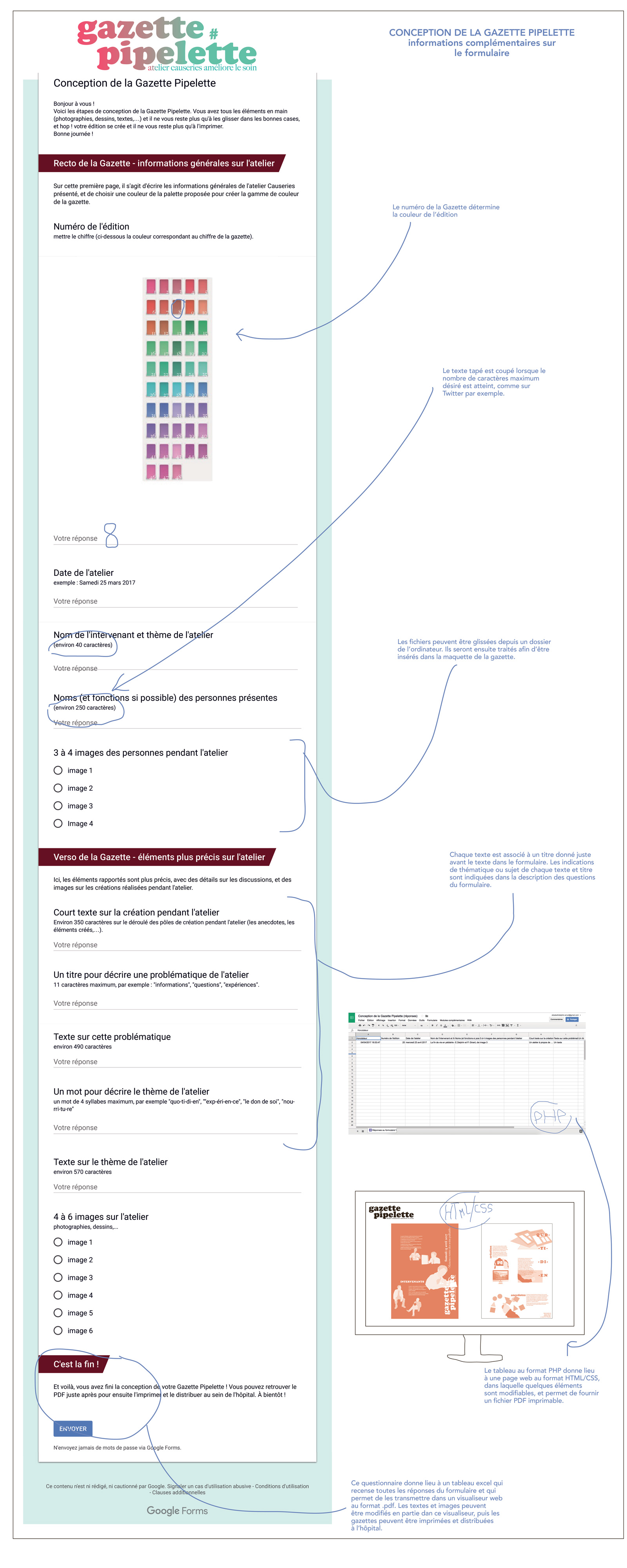 Plusieurs étapes de création sont pensées. Tout d’abord dans l’espace causeries, des outils sont mis à disposition afin que chacun puisse retranscrire à sa façon ce qu’il pense être utile. Ensuite vient le tri et la sélection des productions avec possibilité de scanner, photocopier, faire des collages. Puis, tout est placé dans un dossier sur l’ordinateur, et, selon un formulaire en ligne, les textes et images vont être inscrit dans les cases correspondantes pour former la mise en page de la gazette. Enfin, il ne reste plus que l’impression au format A3, en recto/verso et un pliage simple à réaliser. Les gazettes seront distribuées dans les soins palliatifs afin que les personnes qui sont incapacité de se rendre aux ateliers causeries pendant les séances de partage puissent bénéficier des conseils échangés.