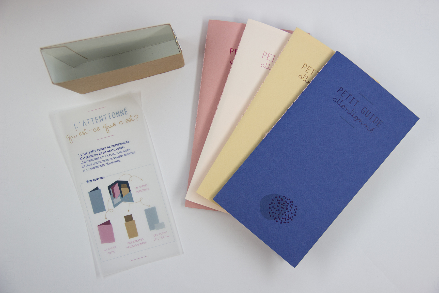 - L’Attentionné est une boîte comportant plusieurs carnets qui permettent de guider l’adulte endeuillé. Adapté aux besoins de la personne concernée, il s’enclenche à l’aide du personnel médical qui, par un dialogue, détermine une utilisation adaptée du carnet.