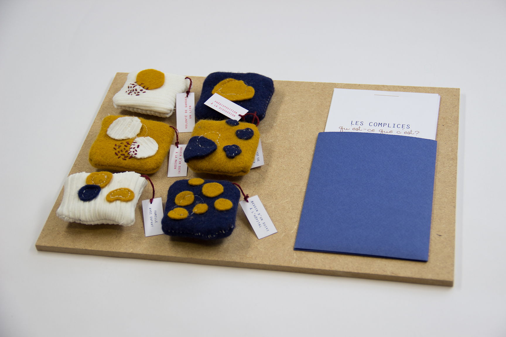 À la façon d’un doudou qui accompagne la naissance, ceux-ci accompagnent le décès et composent l’ensemble nommé “les complices”. Les “complices” se rejoignent autour d’un même univers coloré, matériel et graphique qui comprend : l’attentionné, le confident, l’inséparable, le bienveillant et le conseiller.