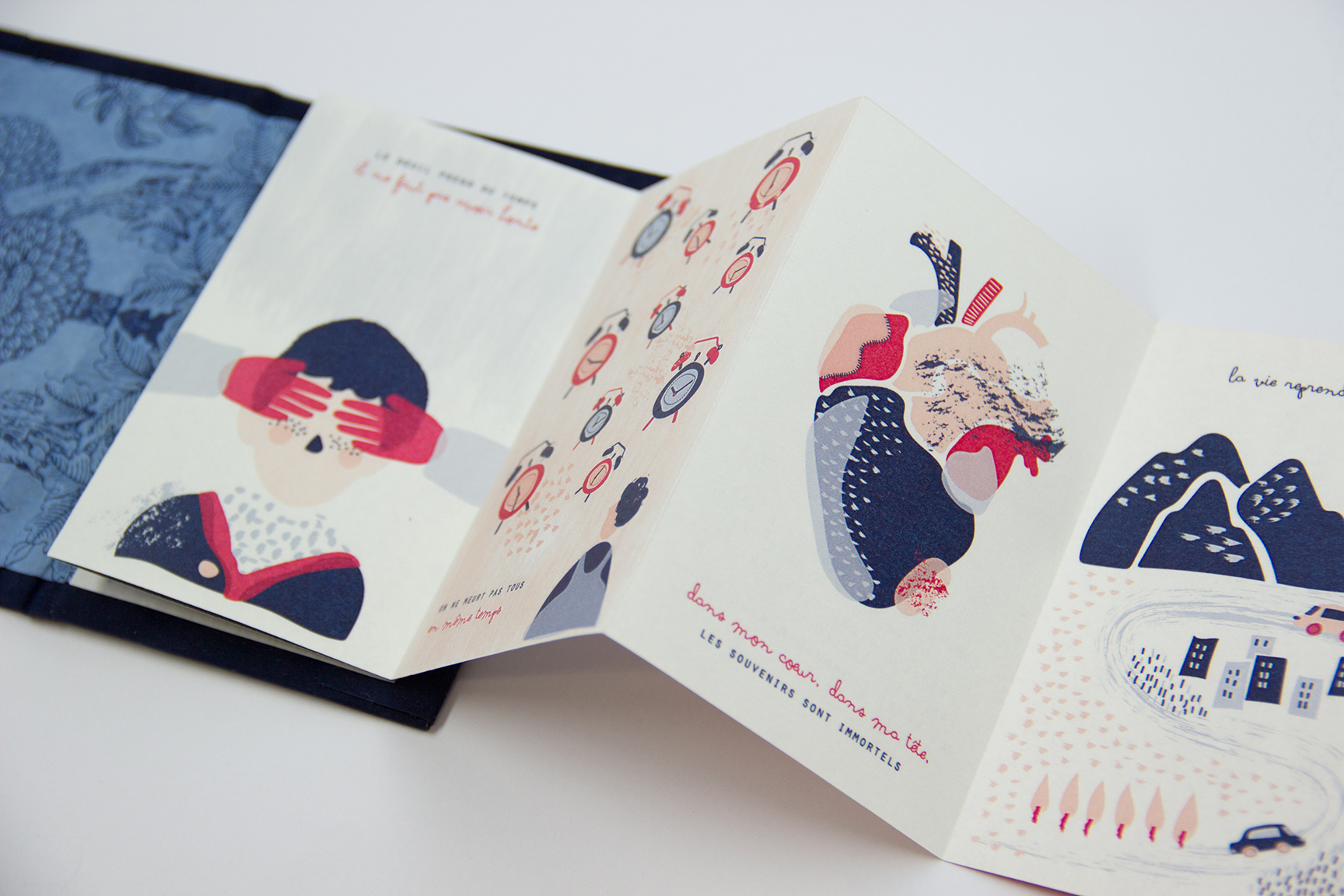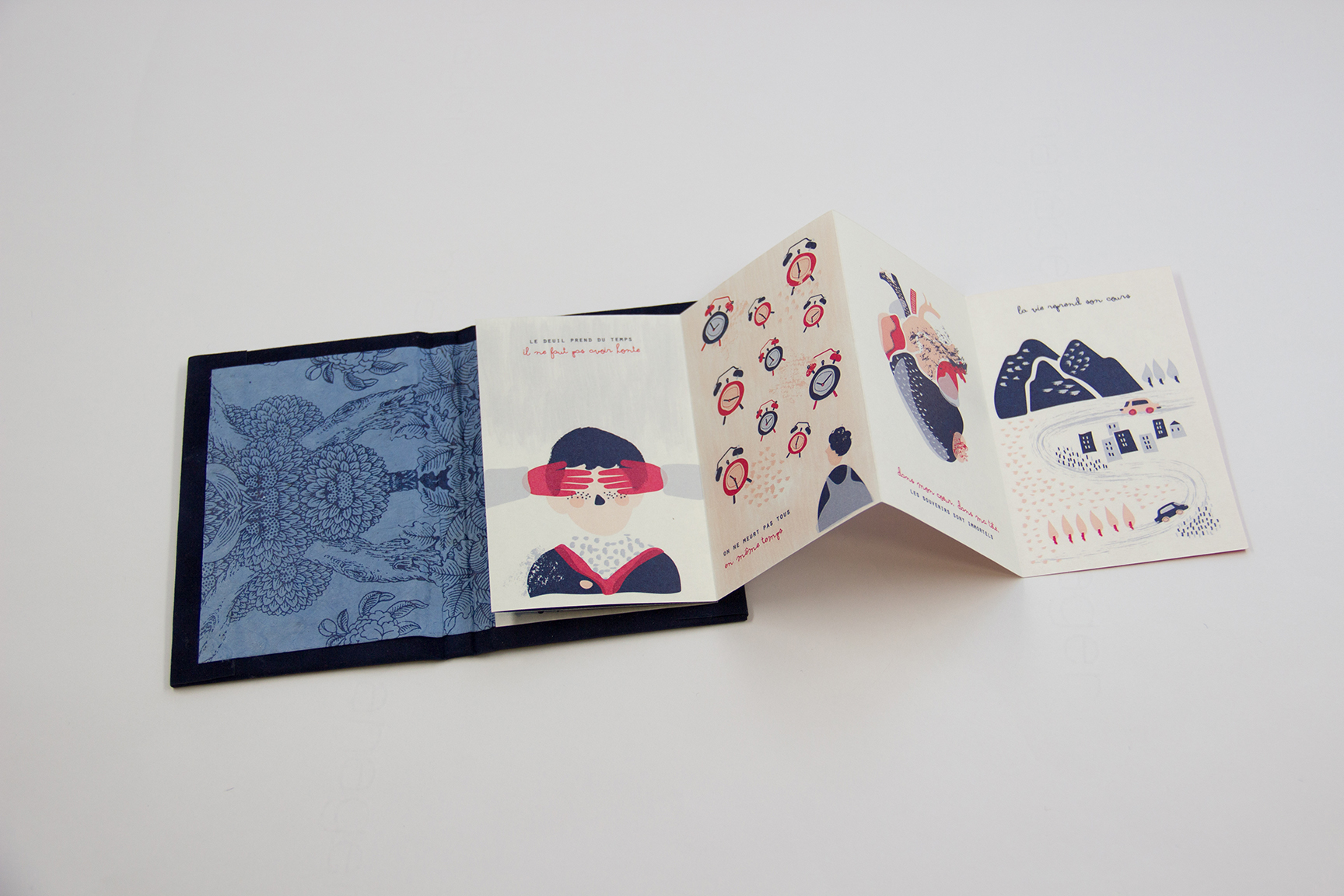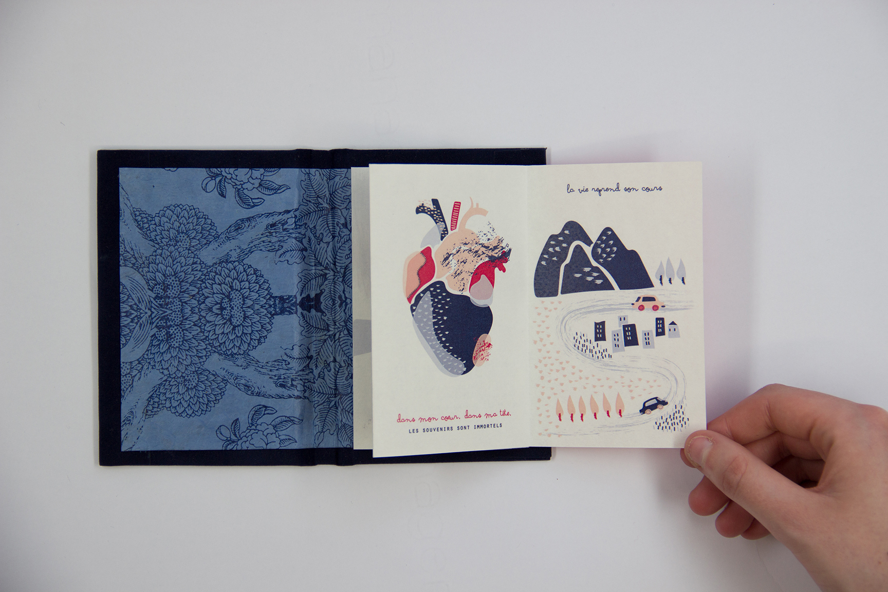 Peur d’oublier et d’être oublié… Les objets aident à se souvenir, ils communiquent par leur simple présence. Ils sont l’extension de la vie du défunt dans celle du vivant. Pourquoi ne pas en faire un service proposé par l’hôpital ? L’idée est de proposer un livre-objet de la taille d’un porte feuille, que l’on puisse glisser dans sa poche et conserver au près de soi à tout moment.