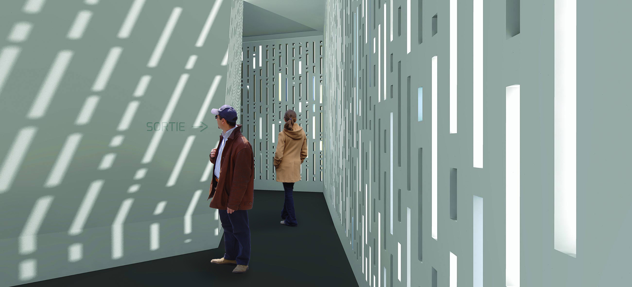 Pour y entrer, ils doivent en premier lieu pénétrer l’Enveloppe (qui est constituée de deux pans de murs percés de traits verticaux irréguliers), ensuite ils accèdent aux «Perles» où ils peuvent se recueillir.