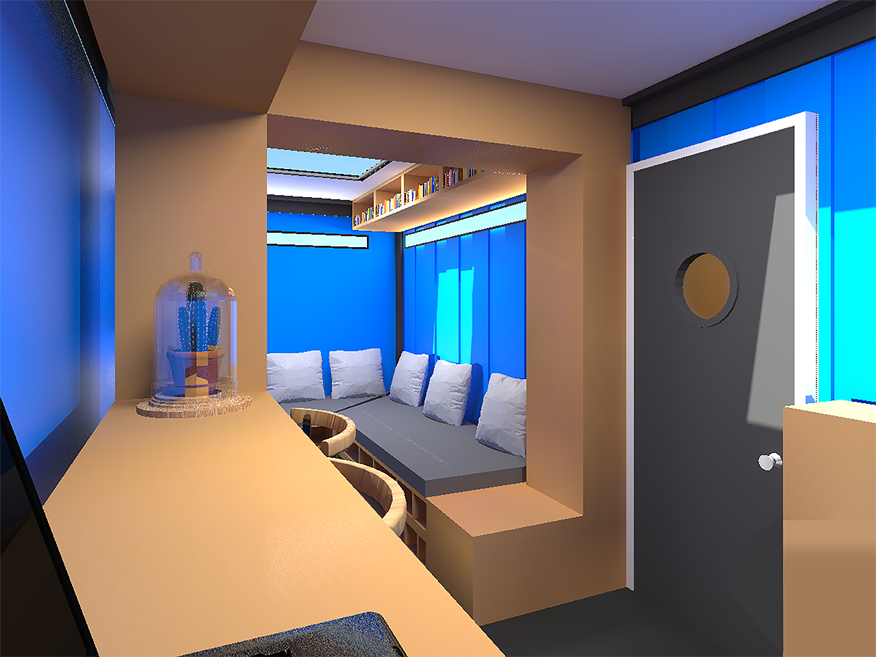 Il s’agit d’un espace individuel mis à la disposition de tous les patients des soins palliatifs. Le patient dispose d’un espace fermé qui lui est destiné dans la cour de l’hôpital afin de recevoir ses proches et passer un moment déconnecté de l’univers hospitalier. Cet espace est un conteneur en métal constitué de matériaux bruts (métal, bois et béton) qui tranche avec le côté aseptisé des soins palliatifs. Après avoir réservé sa place pour une durée déterminée, le patient peut accueillir ses proches dans cet espace confortable de 12m.. A l’intérieur, est mis à disposition, un coin salon pour discuter, regarder un film ou encore pour travailler. il y a aussi un coin cuisine afin de faire réchauffer un plat à partager en compagnie de ses proches. Une fois la visite terminée, un autre patient peut accueillir a son tour ses proches dans cet espace convivial.