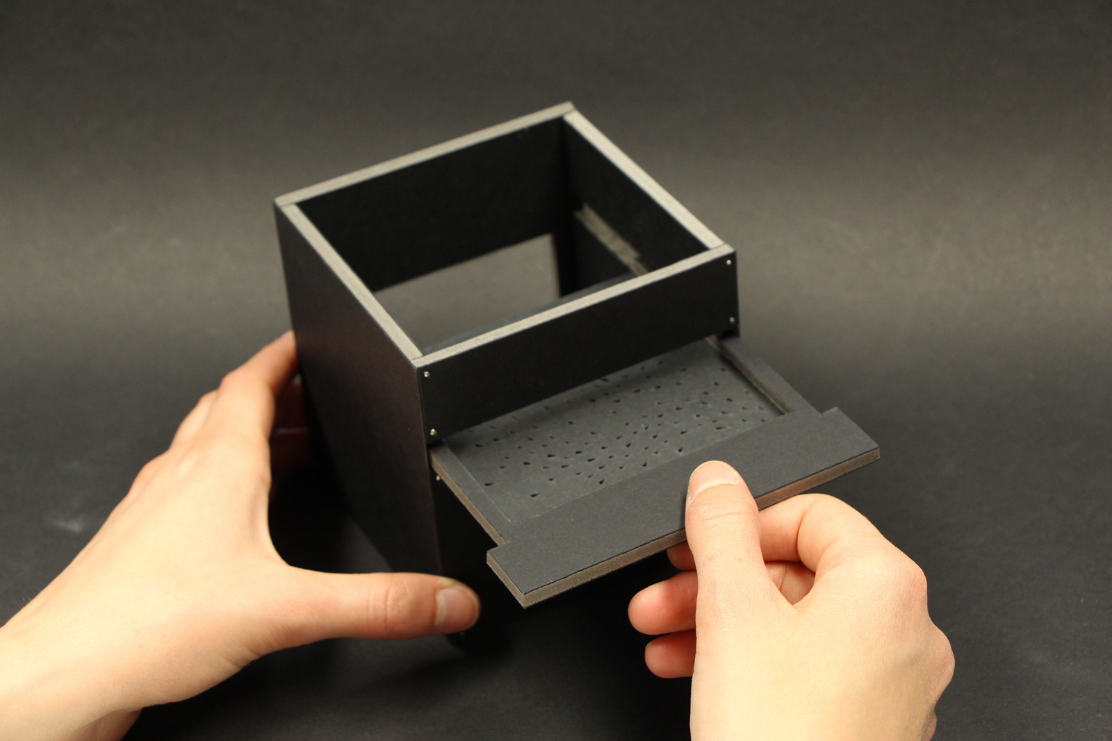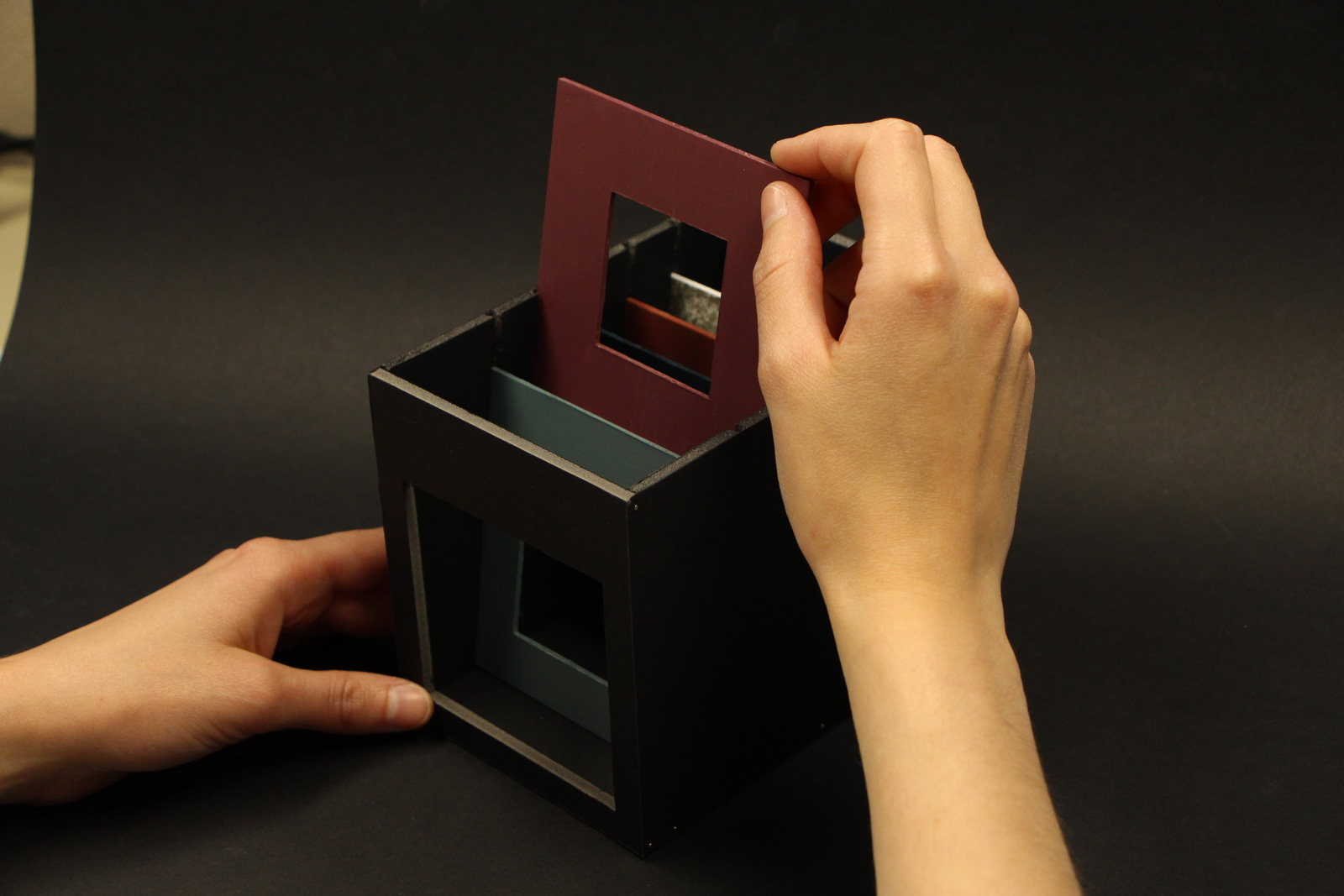 Des filtres en polycarbonate sont insérés dans cet espace qu’est l’Écrin, permettant de bien filtrer la lumière tout en donnant une teinte aux rayons filtrés.