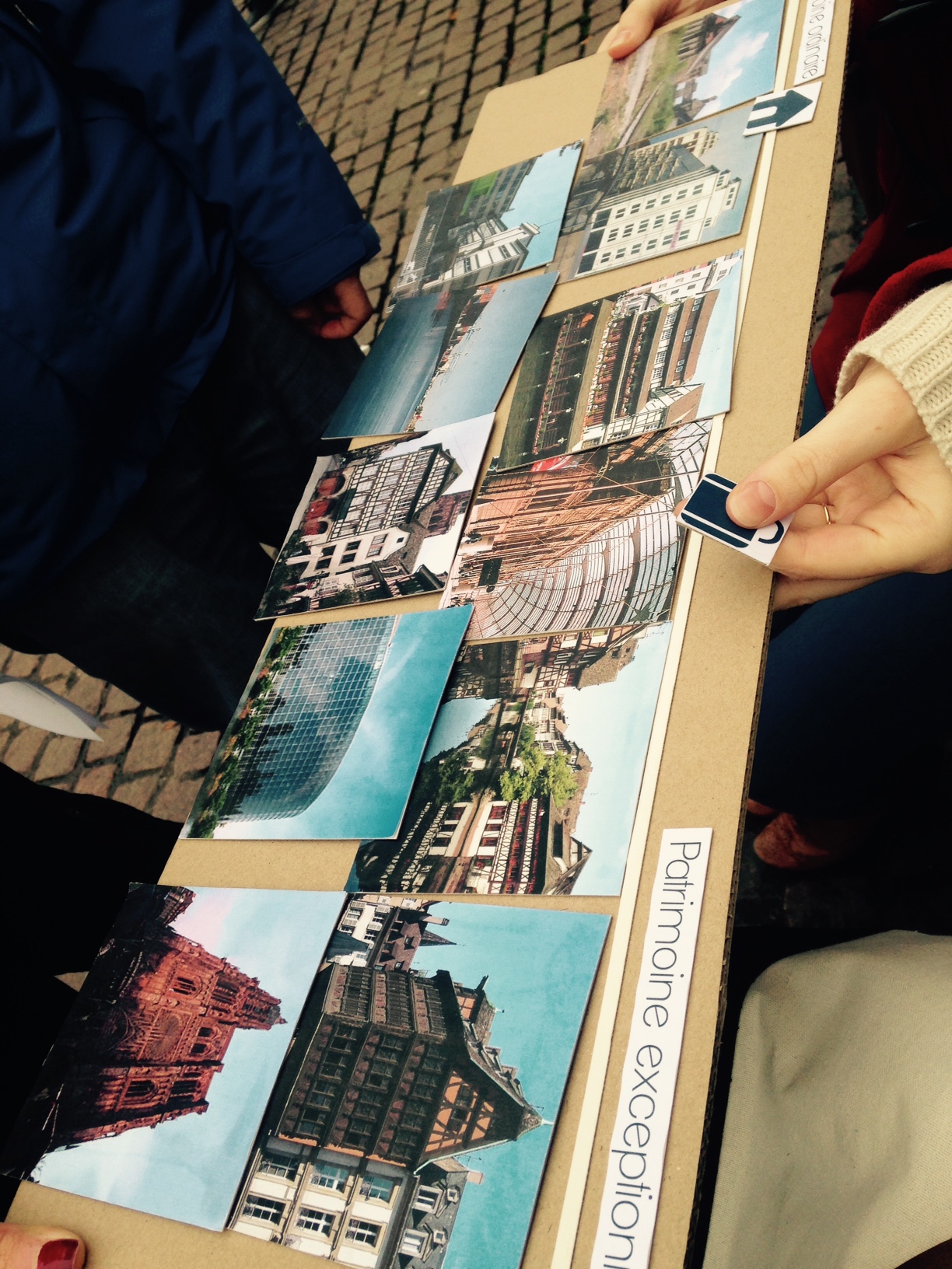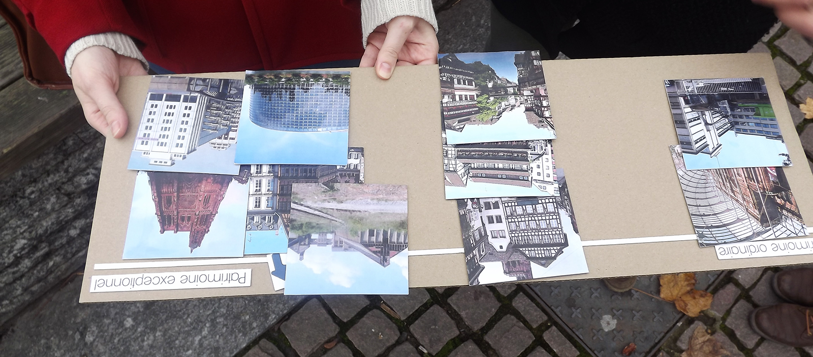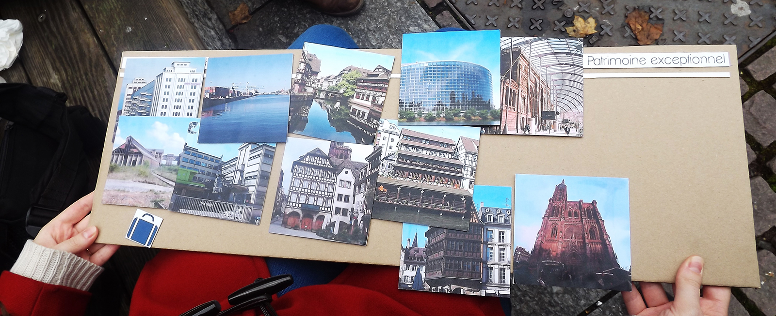 Lucile Geaiffrai-Derroisné et Alice de Bonnafos (Designers d’espace) se proposent de questionner les usagers de Strasbourg autour de leur définition du patrimoine. De la Place Kléber au Quai des Bateliers, munies de leur outil de médiation commun, elles ont interrogé touristes et habitants. Cet outil, sous forme de jeu de cartes, illustre onze lieux de la Capitale Européenne, à classer du plus commun au plus spectaculaire, en fonction de leur point de vue. Les deux étudiantes du DSAA souhaitent en tirer une réflexion sur la distinction du patrimoine ordinaire et du patrimoine exceptionnel.
