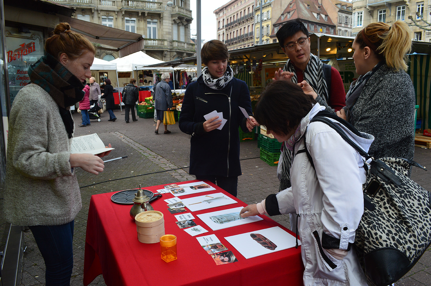Se questionnant toutes les trois sur l’alimentation, nous avons choisi de nous confronter aux usagers sur un lieu emblématique strasbourgeois lié à notre propos : le marché de la place Broglie.