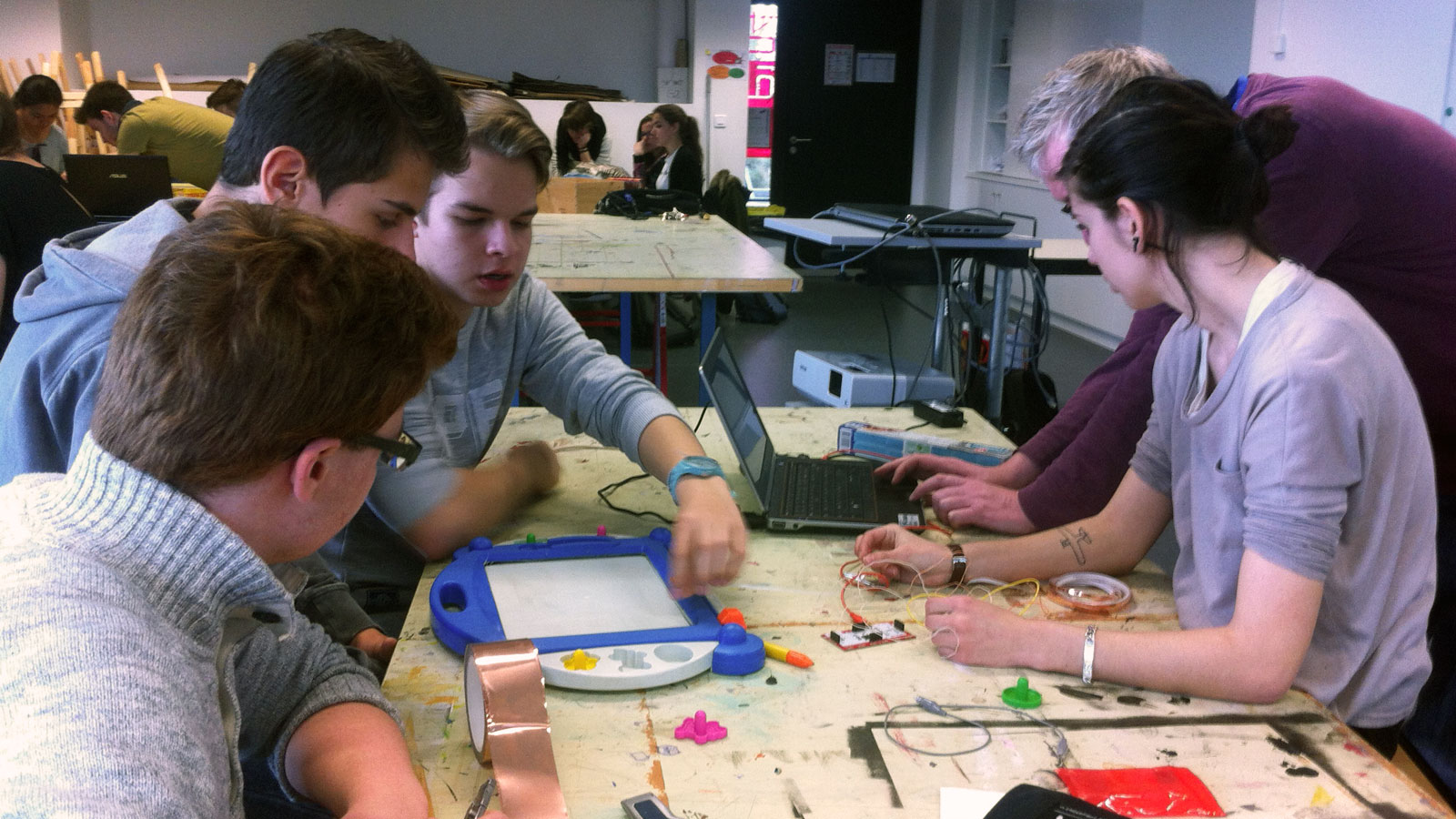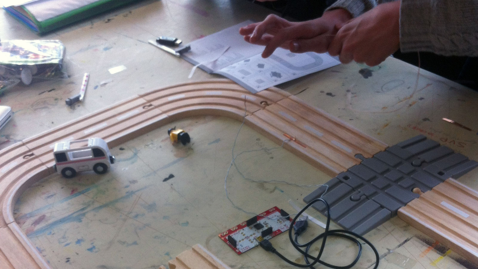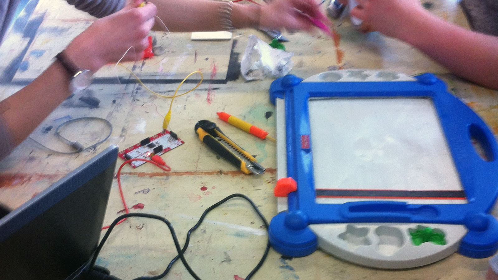 L’idée. Détourner des jouets (une ardoise magique, un Docteur Maboul, un petit train électrique, un jeu d’éveil sonore) et les connecter à un ordinateur en utilisant des cartes Makey Makey et des scripts Processing.