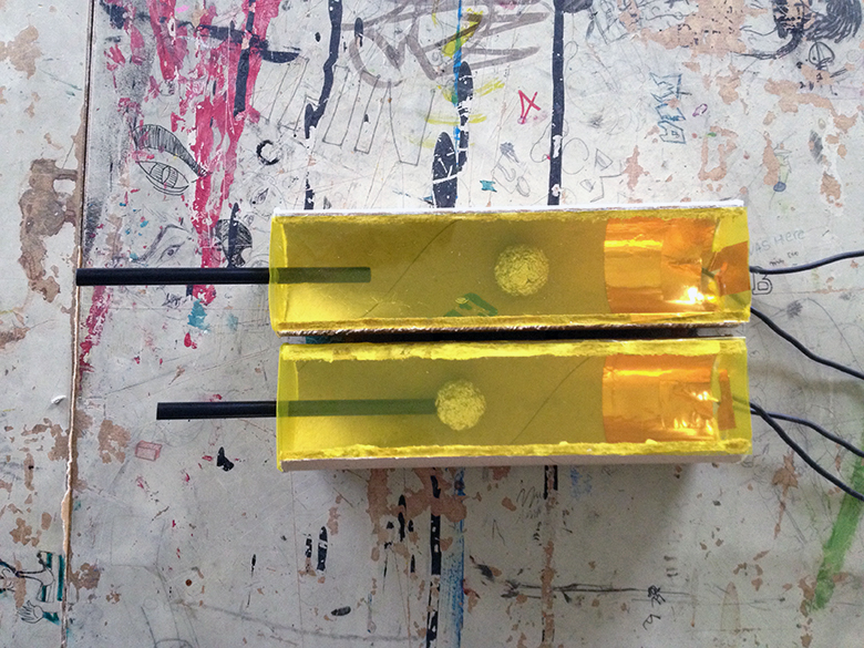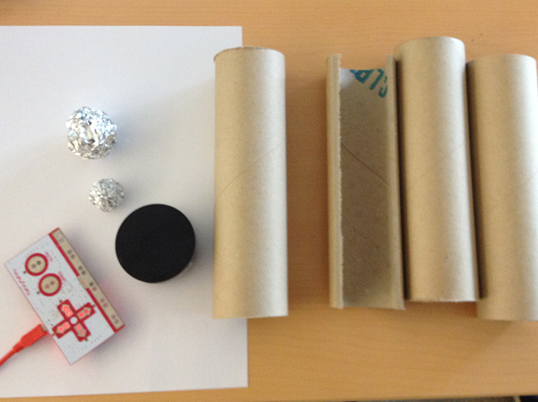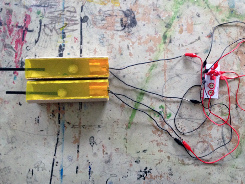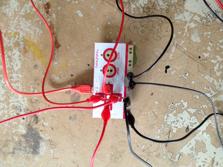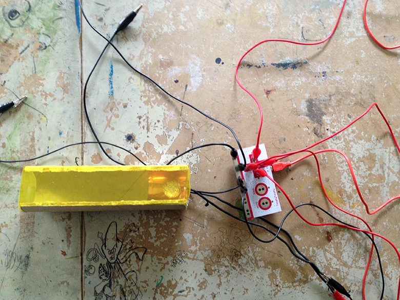 On met en place un jeu interactif. Le principe est simple: quatre joueurs se positionnent devant un tuyau. Ces derniers doivent souffler sur une sphère en aluminium afin de toucher l’extrémité du tuyau entouré d’un adhésif cuivré. Le contact est établi lorsque l’aluminium rentre en contact avec l’adhésif, ce dernier étant lui-même relié au makey makey par un câble. Le câble lui est branché au makey makey et à l’ordinateur (jeu).