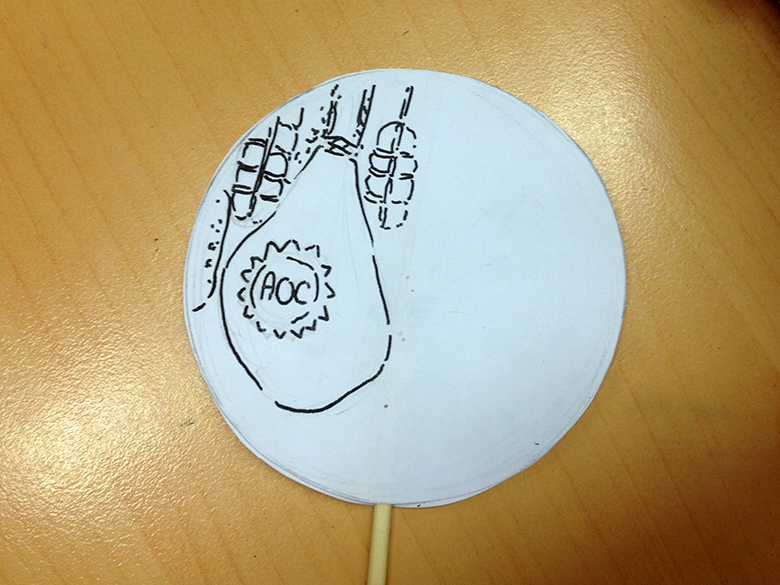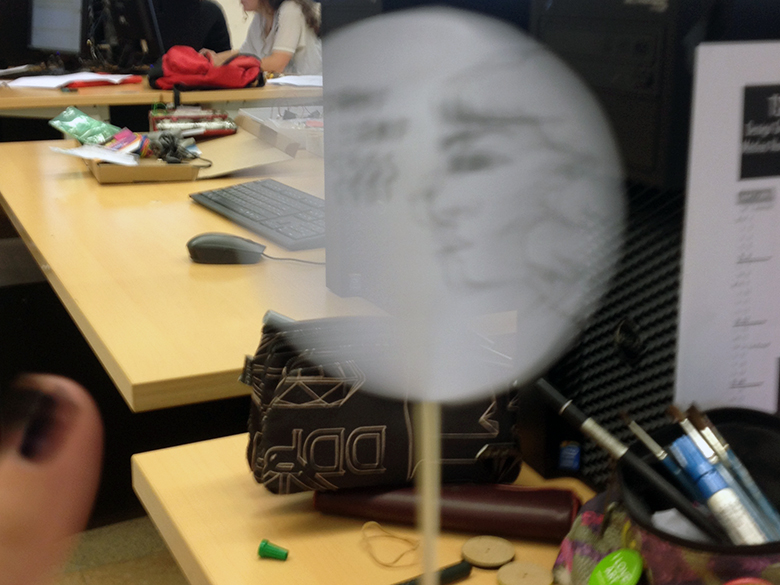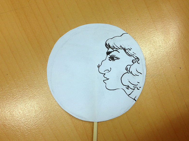 Le procédé animé qu’on utilise est le thaumatrope, inventé en Europe vers 1820. Le principe est simple: un disque pivote sur lui-même. Sur chaque face du disque est dessiné un élément.