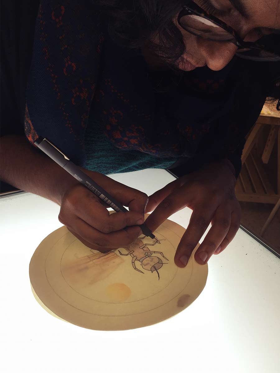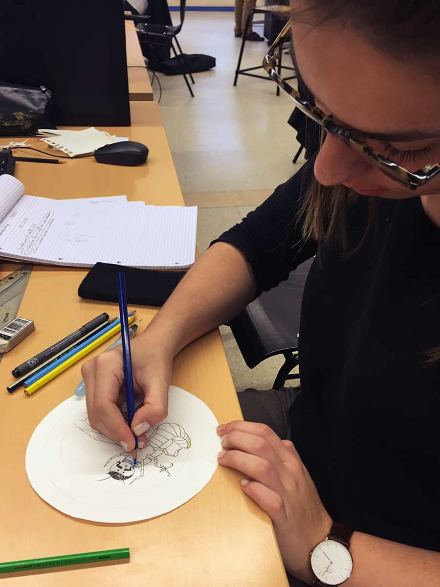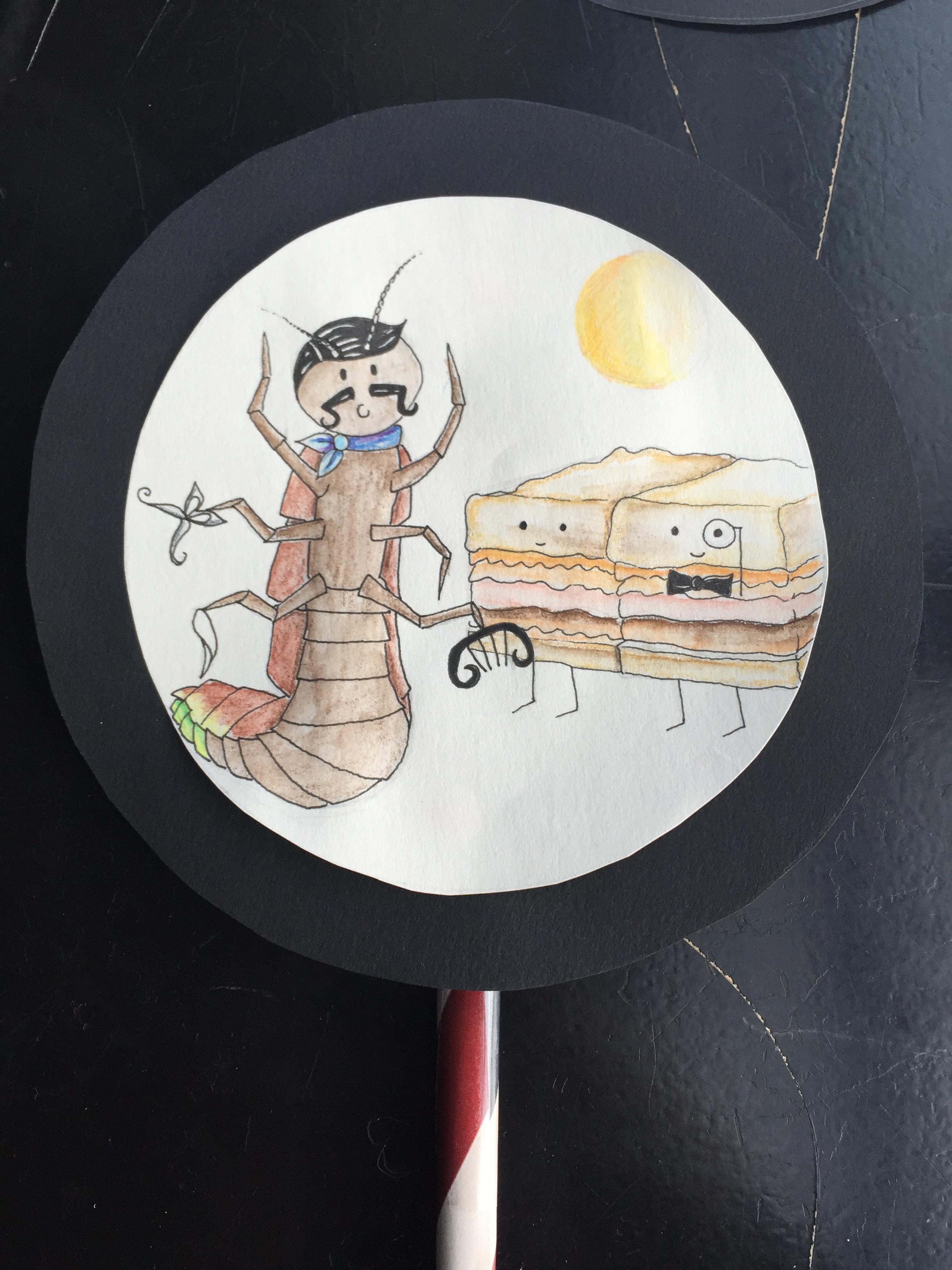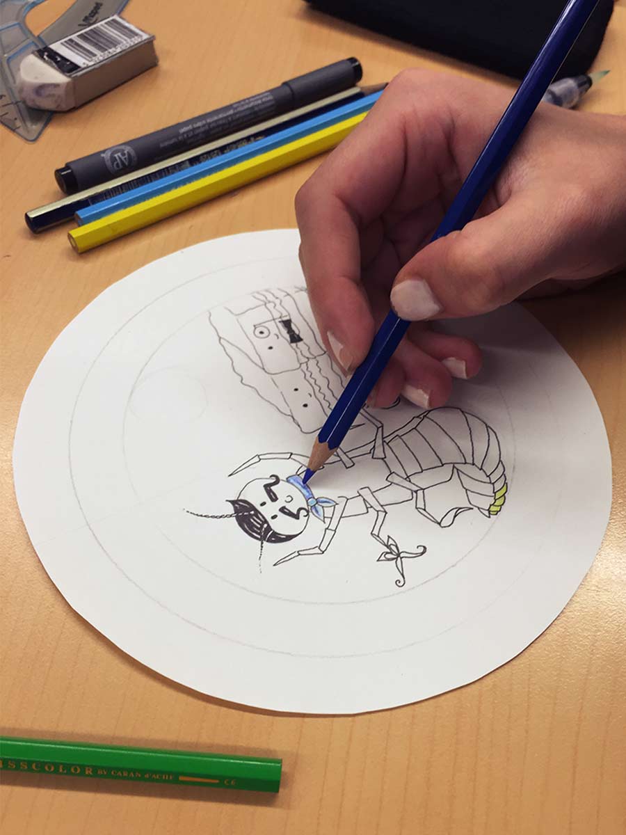 Si le thaumatrope fait parti à l’origine des procédés inventés au XIXe siècle avant l’invention du cinéma tel qu’on le connait aujourd’hui, il est de nos jours un jouet très apprécié des enfants. C’est pourquoi nous avons décidé d’en réaliser un verticale, dans lequel nous avons remplacé les ficelles sur le côté par un bâton à tenir dans la main. L’ensemble rappelle la forme de la sucette géante.