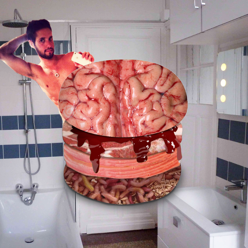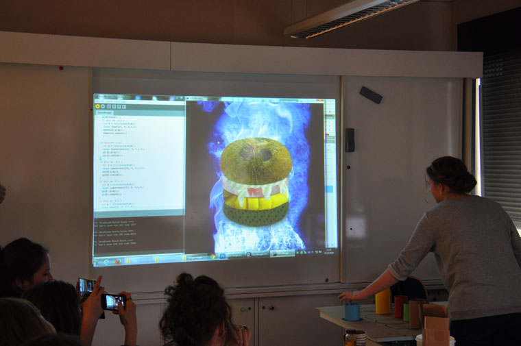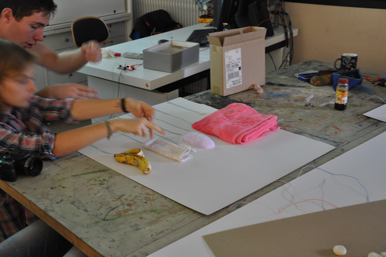 L’installation contient des produits en rapport avec les thèmes abordés dans les burgers. Elle est reliée à l’ordinateur avec le Makey Makey, chaque élément correspond à une action.
