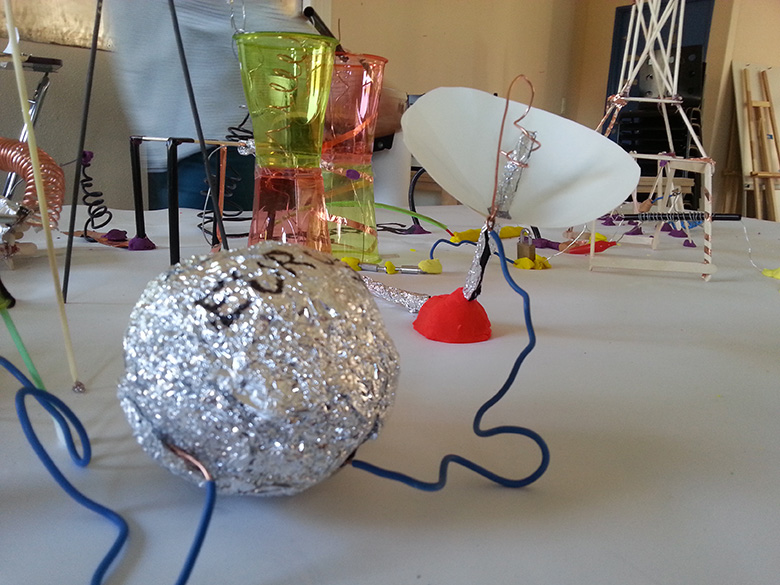 Afin de découvrir l’outil Makey Makey, nous avons procédé à une installation nécessitant quelque notions en bricolage et un peu de créativité. Le but de celle-ci étant d’expérimenter la conductivité de différentes matières et la relation entre le circuit électrique et un programme Processing qui dans le cas présent à permis de prendre des photos à chaque fois que le circuit était fermé. Par définition Processing est un logiciel simplifié pour programmateur débutant. Pour ce projet nous avons dû respecter certaines contraintes comme s’assurer que tout les éléments du circuit étaient bien conducteurs, travailler en groupe, varier les angles de circuit de 45 à 90 degrés, faire chevaucher les circuits pour ne pas juste tracé une ligne droite.