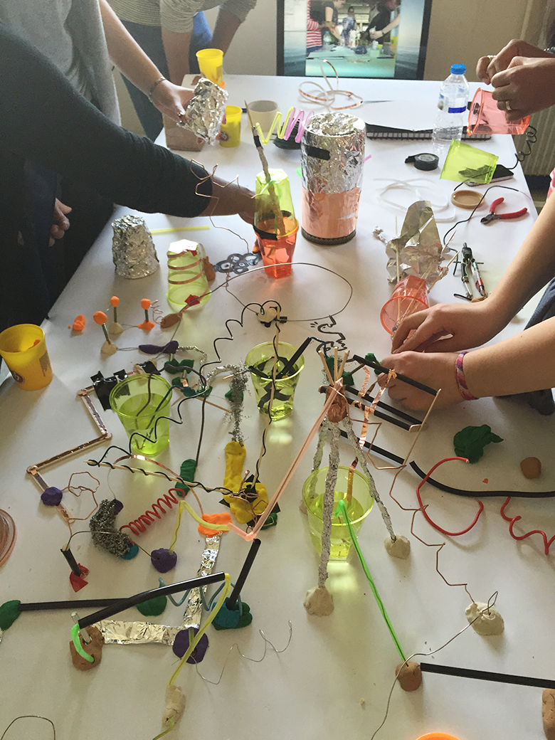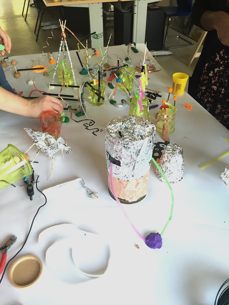 Chaque équipe devait construire un chemin reliant leur point de départ à leur point d’arrivée tout en expérimentant le plus de matériaux conducteurs différents. La conductivité ne devant pas être interrompue les équipes devaient faire preuve d’ingéniosité lors des croisements pour éviter de court-circuiter le circuit.