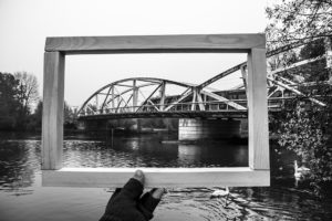 Ce jeudi nous avons fait notre première visite-atelier dans le Parc Naturel Urbain. Pour ce premier jet notre labo a débuté sa déambulation sur le « Parcours des Peintres », au niveau de la station Elmerforst. Très vite nous commençons par descendre sur les berges de l’Ill. J’y trouve une foison de points de vue. Hors du chemin principal, ils offrent d’autres points de vue que ceux existant. Les découvertes s’enchaînent et les photos aussi, chaque construction, chaque berge, chaque élément dans le paysage peut servir de point d’observation. À l’aide de cadres en bois j’ai cherché à focaliser mon regard sur des éléments distincts du paysage, pour le découper, morceaux par morceaux afin de comprendre comment il se construit, en quoi il peut être remarquable, et pourquoi à certains endroits les visiteurs du parc s’arrêtent pour admirer la vue.
