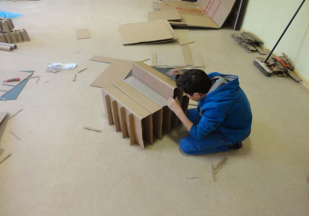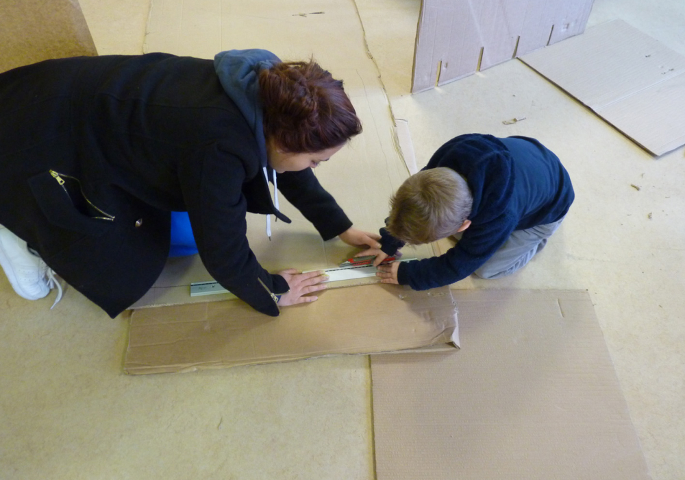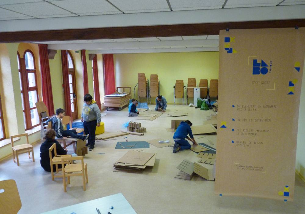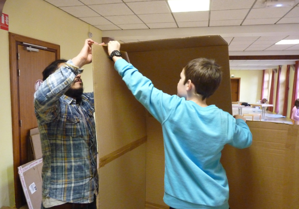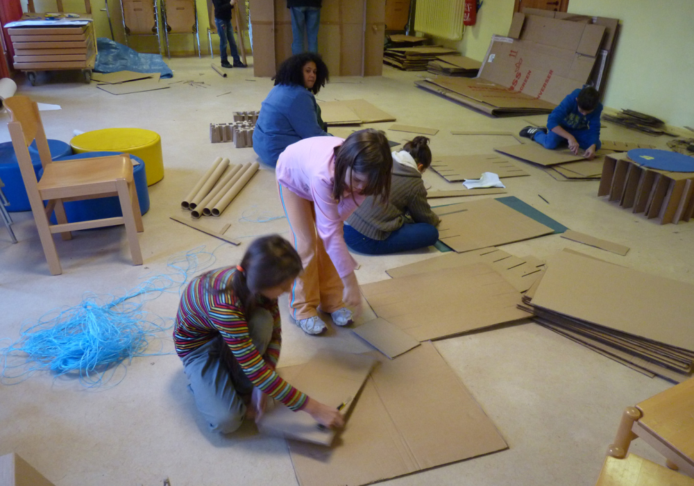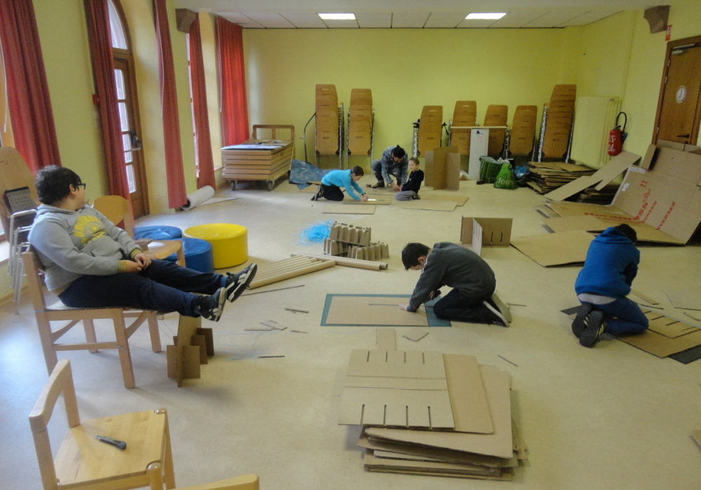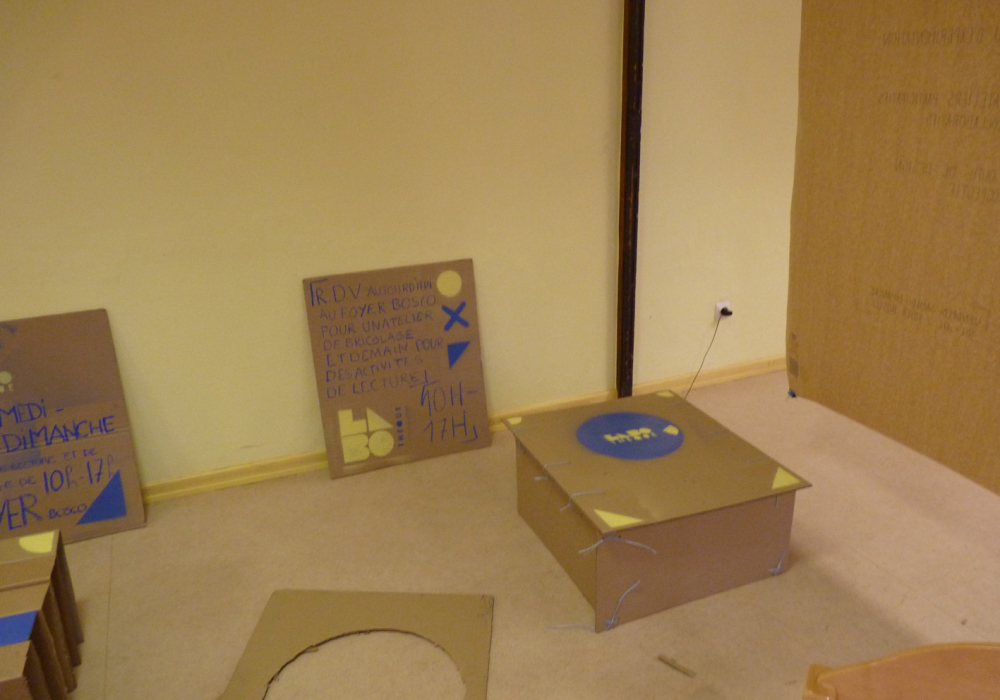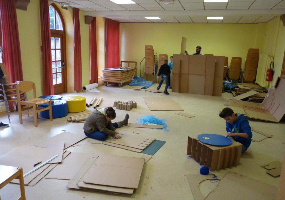 Nous sommes heureux de retrouver une partie des enfants de l’école et d’autres pour un atelier de co-construction de meubles en carton qui seront utilisés lors des ateliers du lendemain. Il faut qu’ils soient solide. Nous apprenons aux enfants des techniques d’emboîtement de cartons afin qu’ils puissent supporter des poids importants. Les enfants sont très impliqués dans l’atelier et sont très productifs. Certains créent leur propre chaise en rajoutant des extensions au mobilier existant. Les formes sont tracées, le carton est découpé, les morceaux sont assemblés, les meubles sont montés et bombés aux couleurs de la Labothèque. Un nouvel espace se dessine.