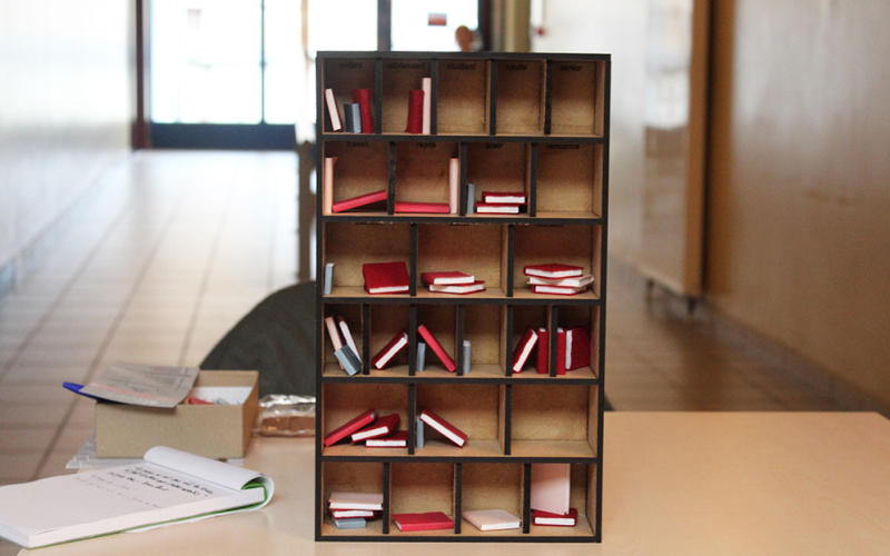 Un troisième objet, prénommé Bibliothèque Loufoque et considéré comme outils de projection, nous a permis de tester une nouvelle manière de représenter la bibliothèque. C’est donc muni d’un panneau “Bibliothèque” et d’un bac de livres que nous nous sommes postés aux abords d’une école primaire et d’une place publique afin d’observer les attitudes de chacun face à ce nouveau dispositif.