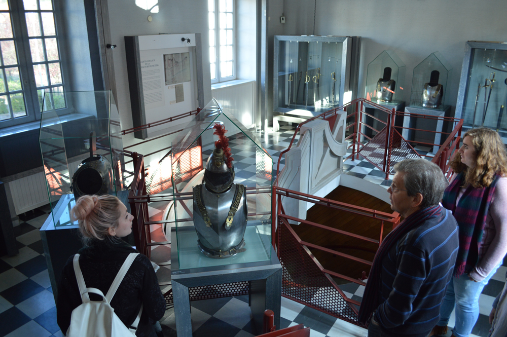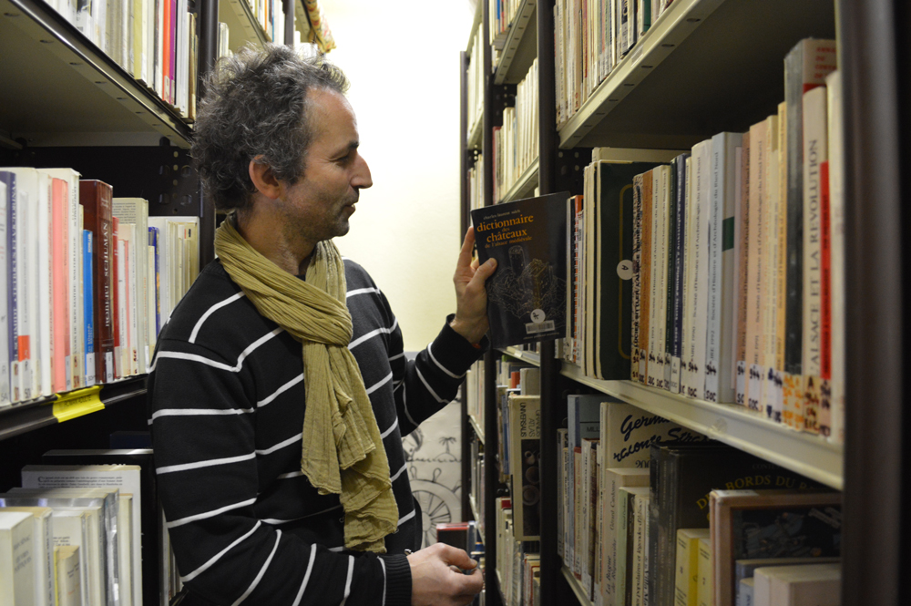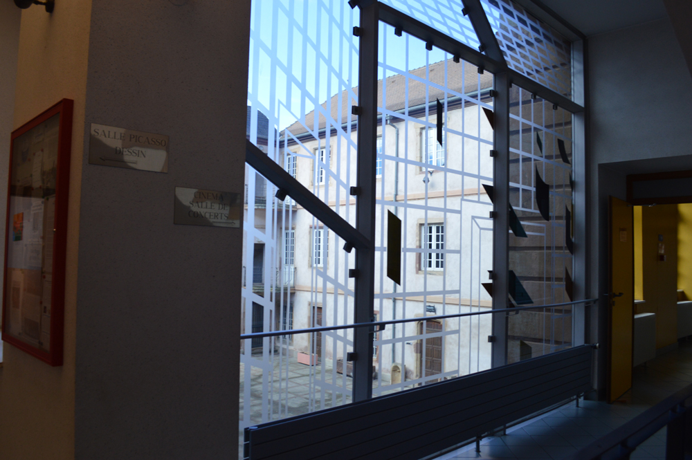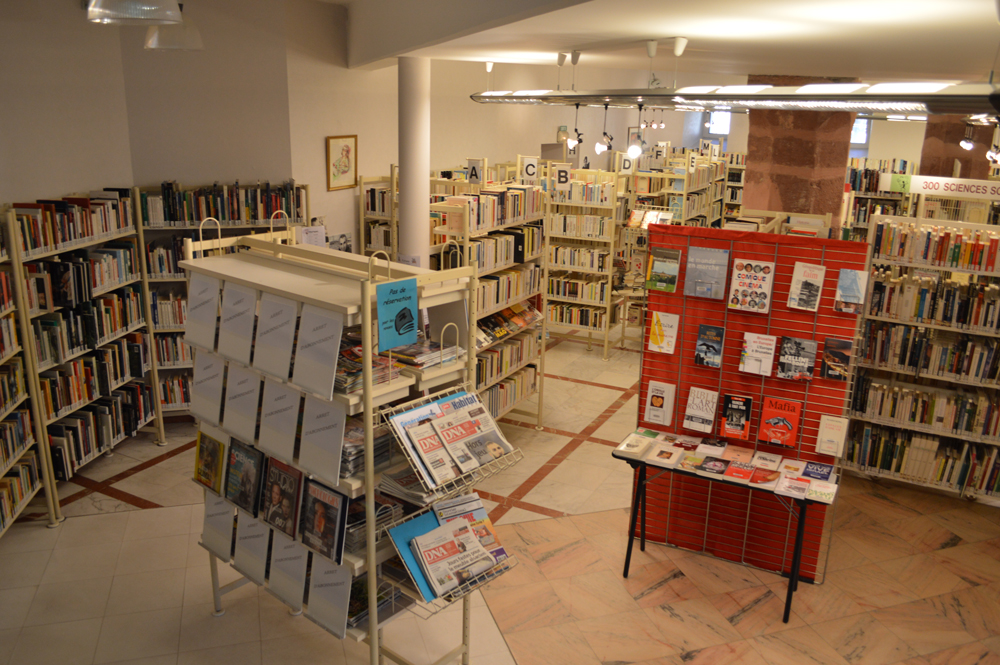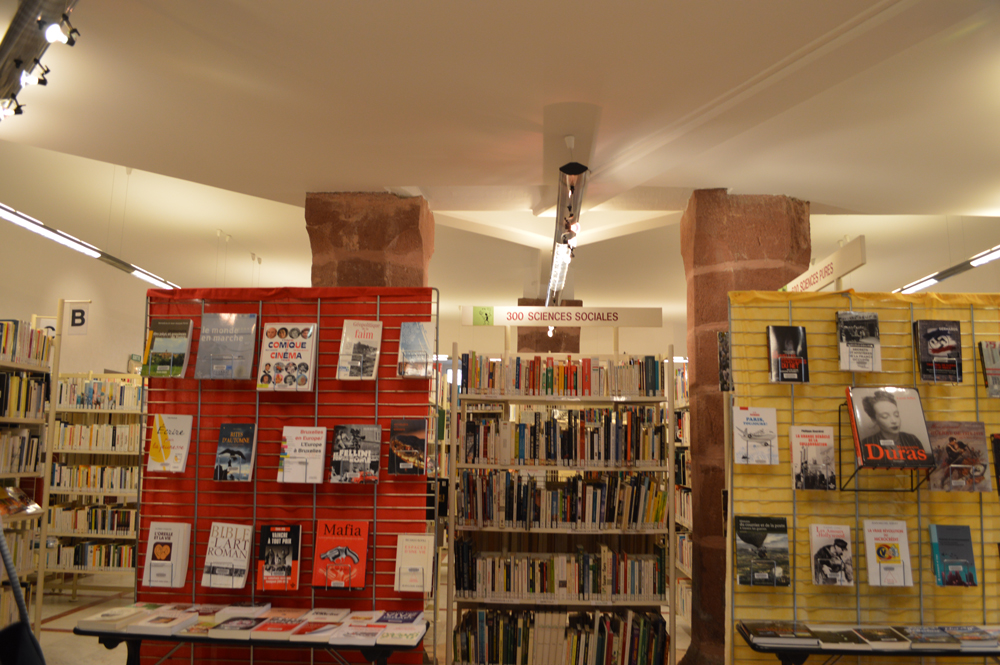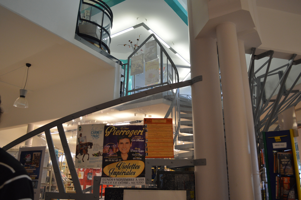 La partie centrale du château date du 14ème siècle. Il a été agrandi de deux ailes et embelli par les Rohan au 18ème siècle. Il servait à cette époque de pavillon de chasse aux Rohan. De la fin du 18ème siècle jusqu’aux années soixante, le château devient une manufacture d’armes. Le Poulp’ apprend que le site a été rénové en 1988 par l’architecte strasbourgeois Jean-Jacques Rizotti et est devenu un centre culturel d’environ 2000m2. Il contient dans l’aile gauche, un musée, dans l’aile droite, une école de musique et des espaces dédiés à différentes activités (danse, arts martiaux, association d’histoire etc..) et dans la partie centrale, une salle de spectacle de 220 places équipée pour le cinéma et le théâtre, et, donc, la médiathèque, qui s’étend sur 600m2, sur deux étages. Il y a 1500 abonnés actifs à la médiathèque, dont 60% qui ne viennent pas de la ville de Mutzig mais des alentours et qui sont souvent attirés au château grâce à l’école de musique. Le musée, n’est ouvert que quatre mois dans l’année. Le Poulp’ trouve que cela crée un déséquilibre entre des espaces presque vides et d’autres surpeuplés. La médiathèque est liée à celle de Molsheim, puisqu’à Mutzig, on peut trouver 43000 ouvrages “adulte” et “jeunesse”, dont 10% en archives, et 2800 DVD, tandis qu’à Molsheim on peut trouver les livres “adultes” et “jeunesse”, aussi, ainsi que les CD. Les deux médiathèques sont donc complémentaires. D’ailleurs, les personnes qui vont le plus la médiathèque sont les enfants et les adultes de plus de 50 ans, il y a que très peu de fréquentation chez les 18-35 ans.