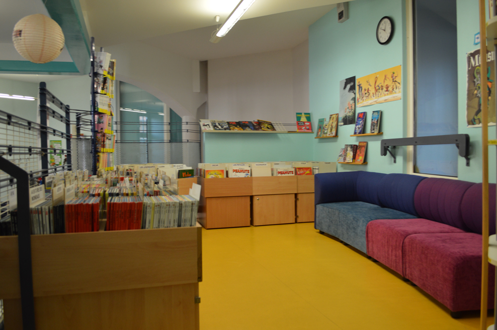Ce qui a interloqué le Poulp’, c’est qu’il existe aussi une forte opposition entre les deux étages de la médiathèque. Le premier étage est entièrement adapté aux enfants avec notamment une salle de lecture ce qui donne un sentiment chaleureux, d’abondance, tandis qu’en bas, l’atmosphère est plus froid, il y a même des espaces vides, pour cause de réductions budgétaires. Il y a tout de même un espace de repos et un de travail. Pour ce qui est de la communication au sein même de la bibliothèque, le Poulp’ ressent énormément de volonté de la part de l’équipe qui n’a peut-être pas toujours les outils adapté aux messages qu’ils souhaitent transmettre.