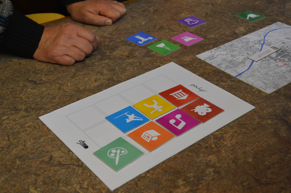 C’est Mr. Money, fréquentant Mutzig depuis plus de 40 ans et président du club photo, qui nous fait la visite et nous présente à des habitants et visiteurs de longue date. Il n’en faut pas plus au poulp’ pour dégainer d’un coup de tentacule un premier outil de contact : “-Vous connaissez bien Mutzig? Alors tentez placer le Château des Rohan sur notre carte!”. La moitié des interlocuteurs connaissent parfaitement la ville, comme Gérard, 64ans; il réussit aussi le test du second outil : deviner combien d’activités, et lesquelles, sont possibles au château, en choisissant des pictogrammes dans une banque et en les plaçant sur un plateau. Mais ce n’est pas le cas de l’autre moitié des interviewés, comme cette dame faisant pourtant régulièrement les 60km qui séparent son domicile de Mutzig. Elle a bien entendu parler d’un château, mais ne l’a jamais visité; “c’est sûrement un musée non ? Je suis allée plusieurs fois devant lors des Sans-Culottes!”. Alors, point de rassemblement d’événements, tout comme le jour d’Halloween, mais pas suffisamment attrayant pour draguer ces visiteurs dans son antre ?