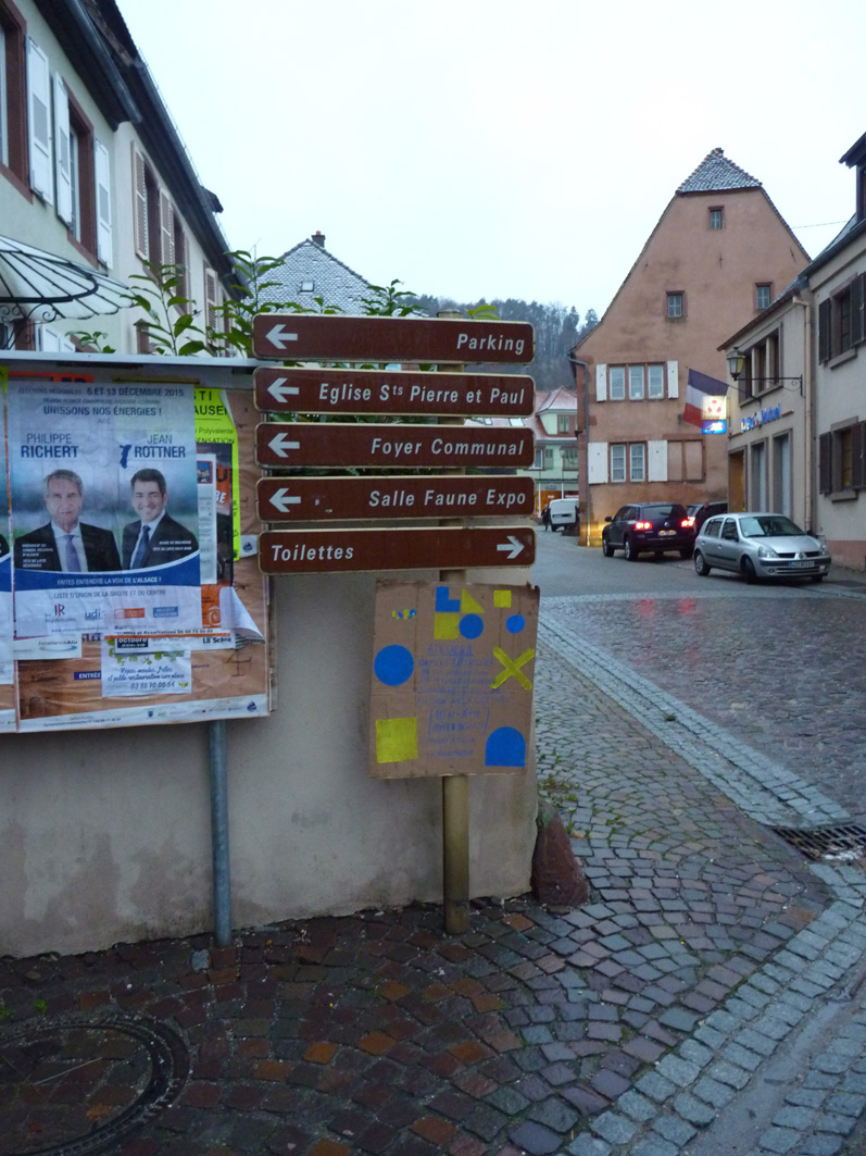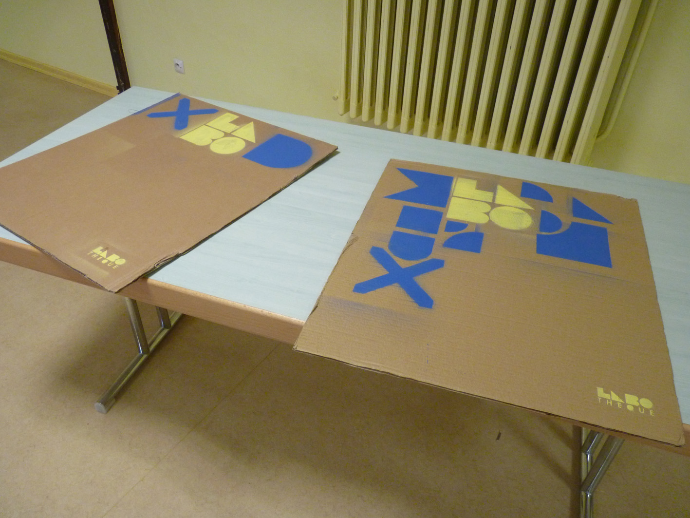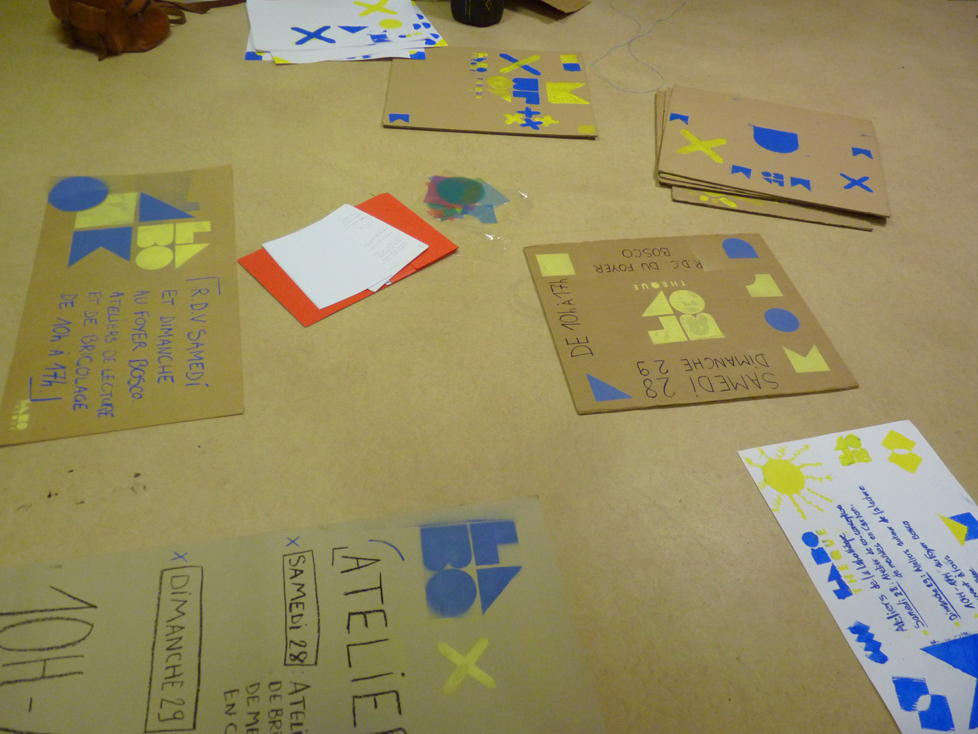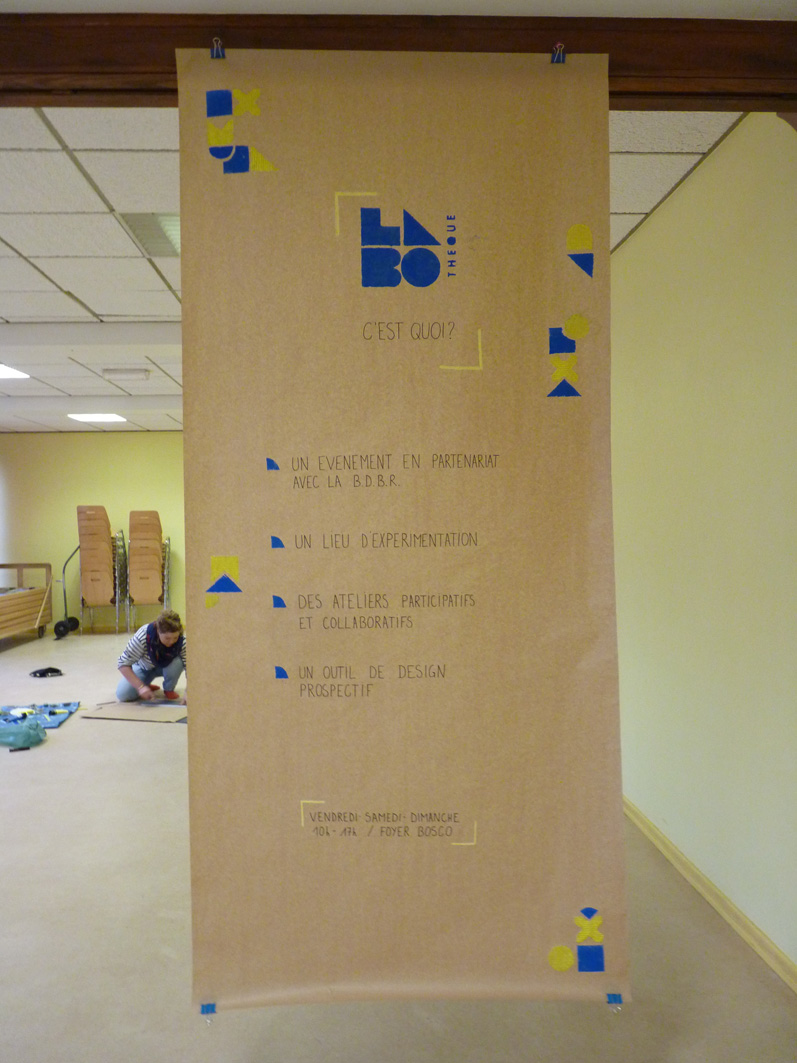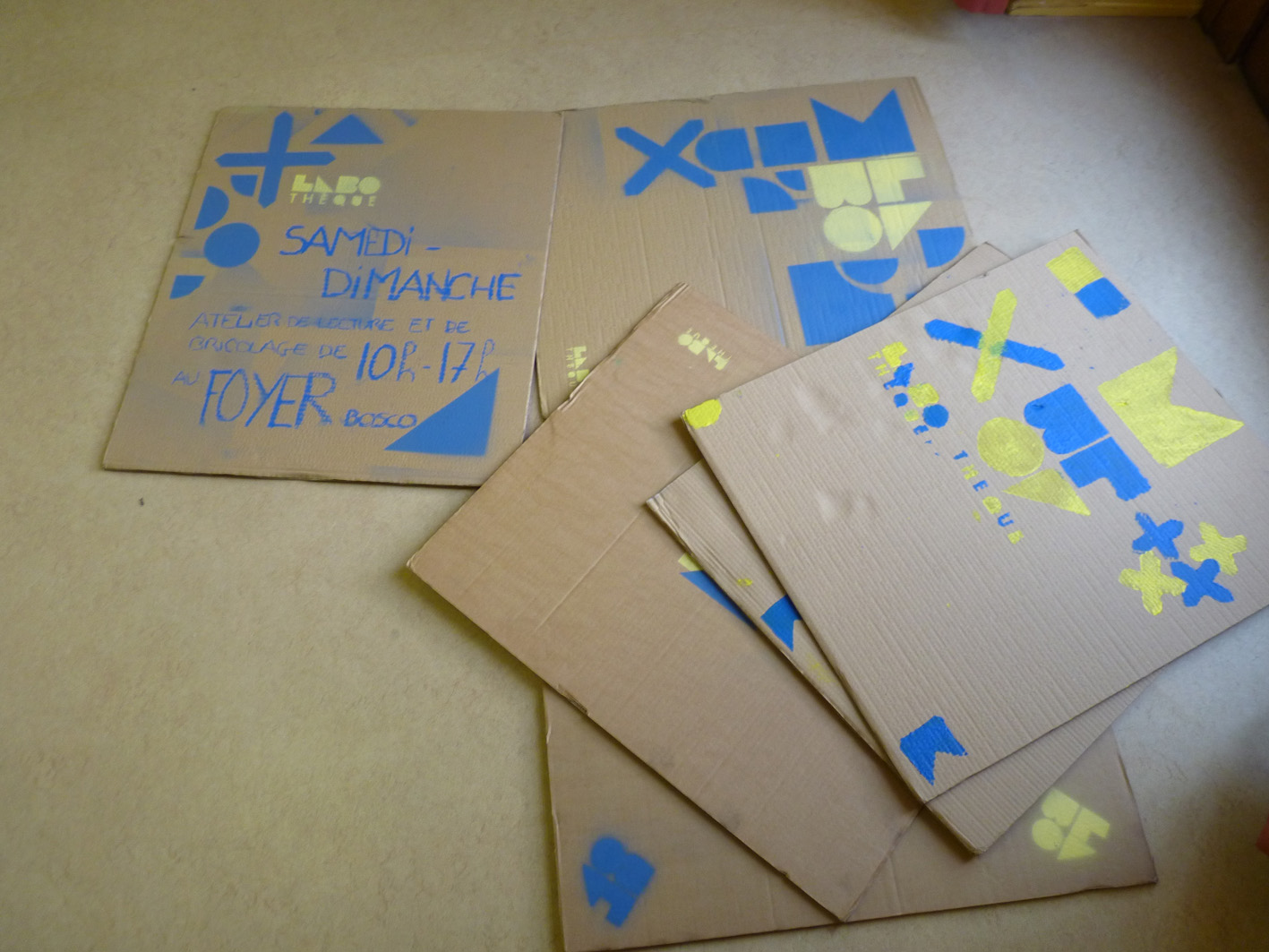 Premier jour de la Labothèque! Aujourd’hui c’est la co-réalisation de la communication avec les enfants de l’école de Neuwiller! Du bleu, du jaune et c’est parti! Les enfants réalisent avec nous des affiches sur du carton que nous affichons directement dans la rue. On réalise aussi des flèches pour la signalétique et les éléments de l’identité sont déclinés sur le sol à l’aide de pochoirs.