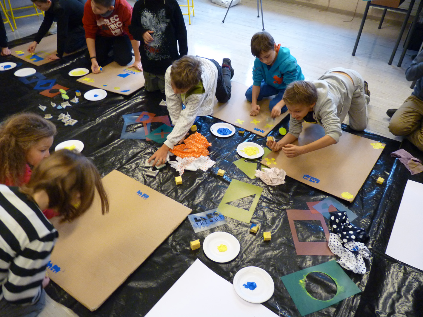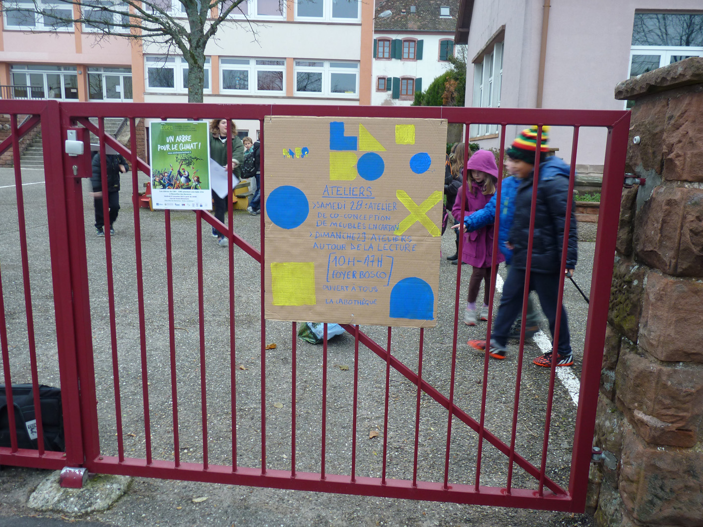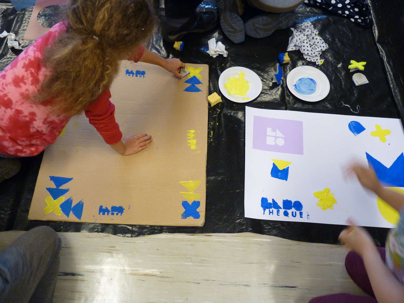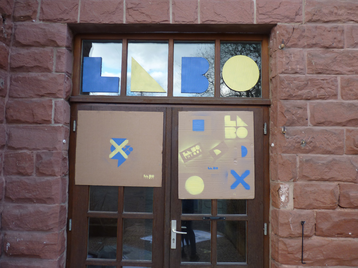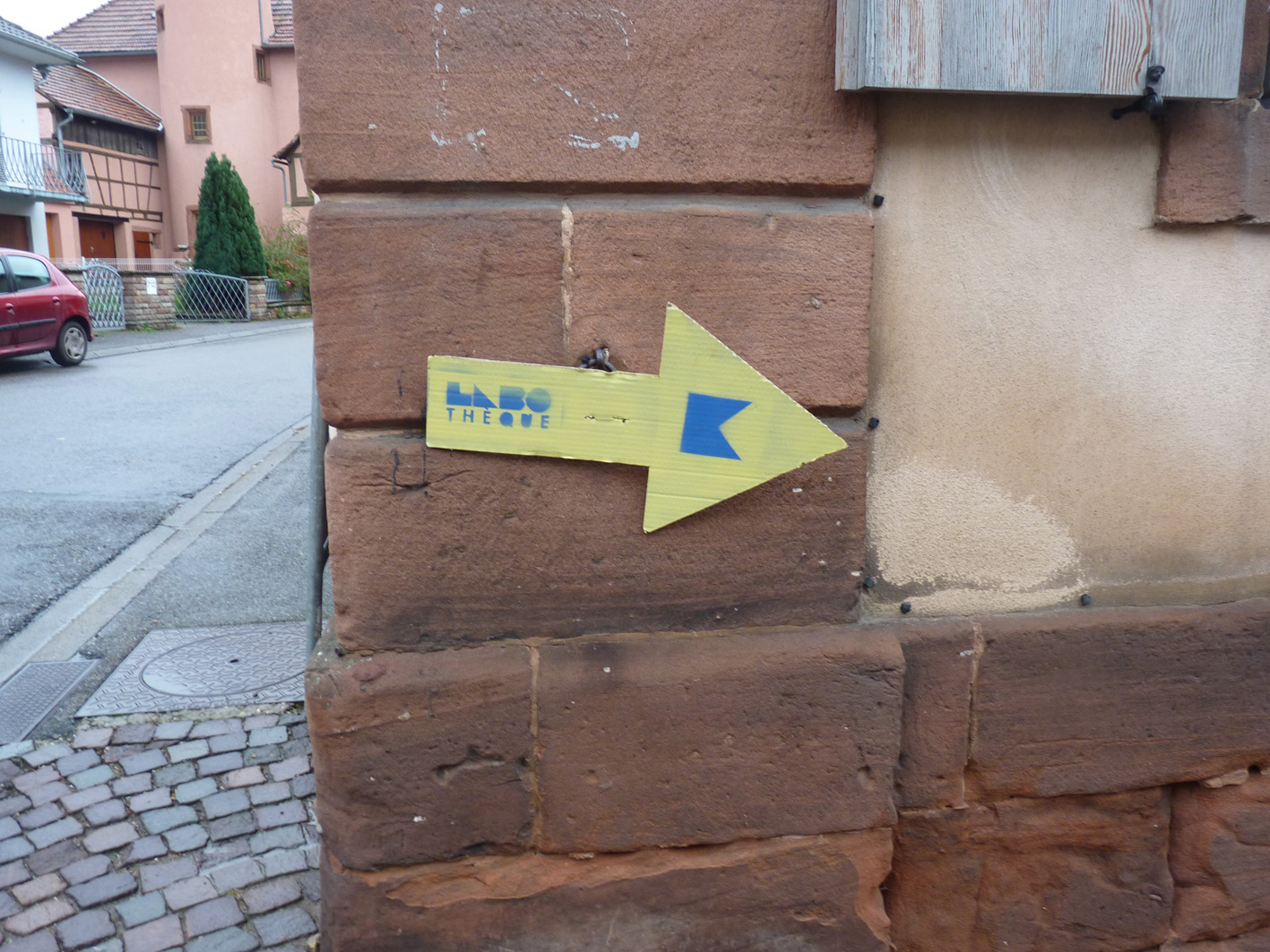 Premier jour de la Labothèque! Aujourd’hui c’est la co-réalisation de la communication avec les enfants de l’école de Neuwiller! Du bleu, du jaune et c’est parti! Les enfants réalisent avec nous des affiches sur du carton que nous affichons directement dans la rue. On réalise aussi des flèches pour la signalétique et les éléments de l’identité sont déclinés sur le sol à l’aide de pochoirs.