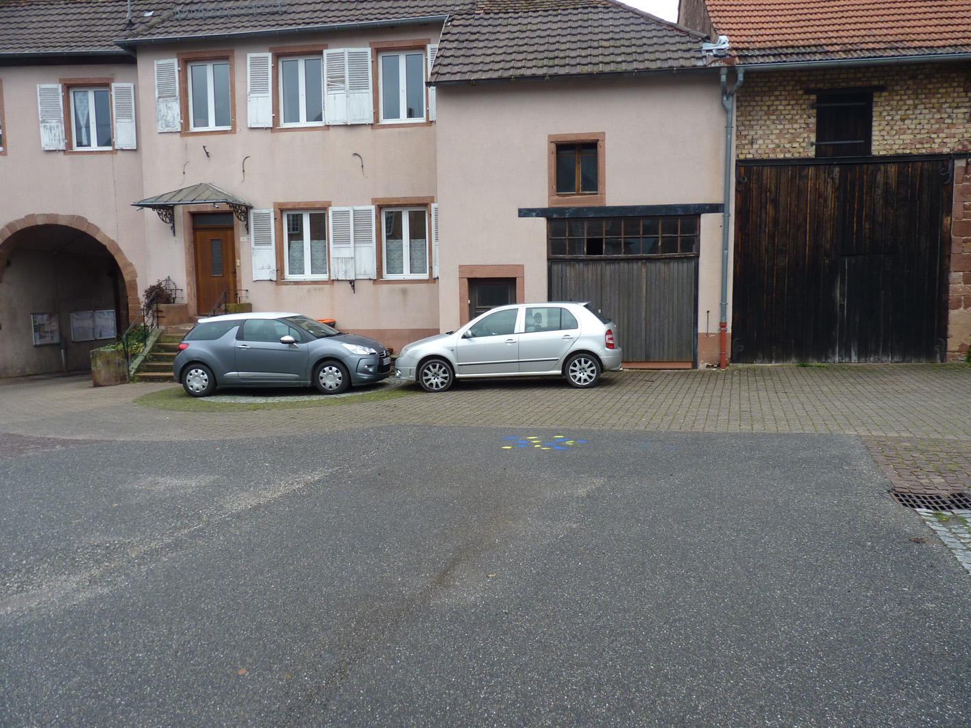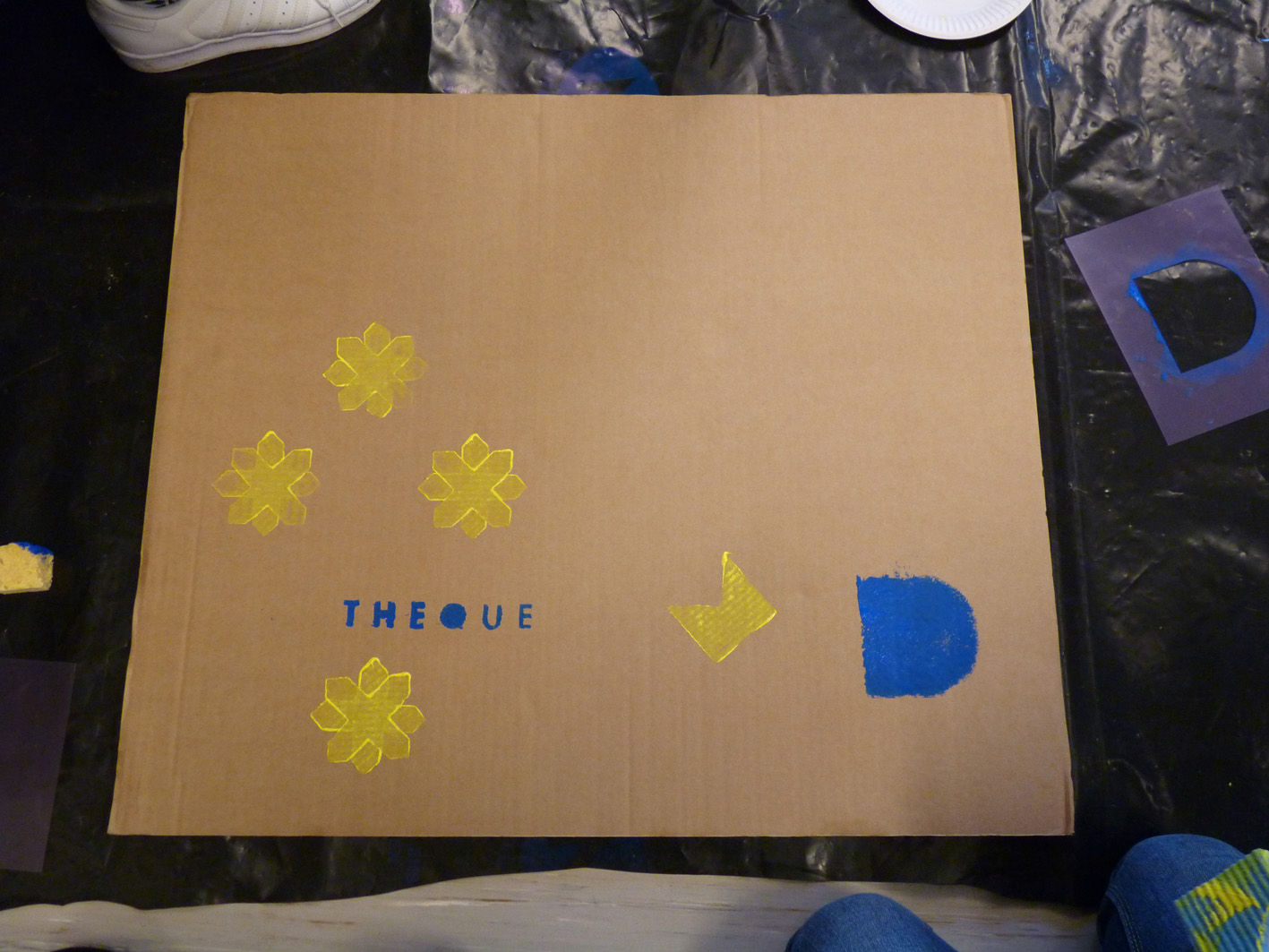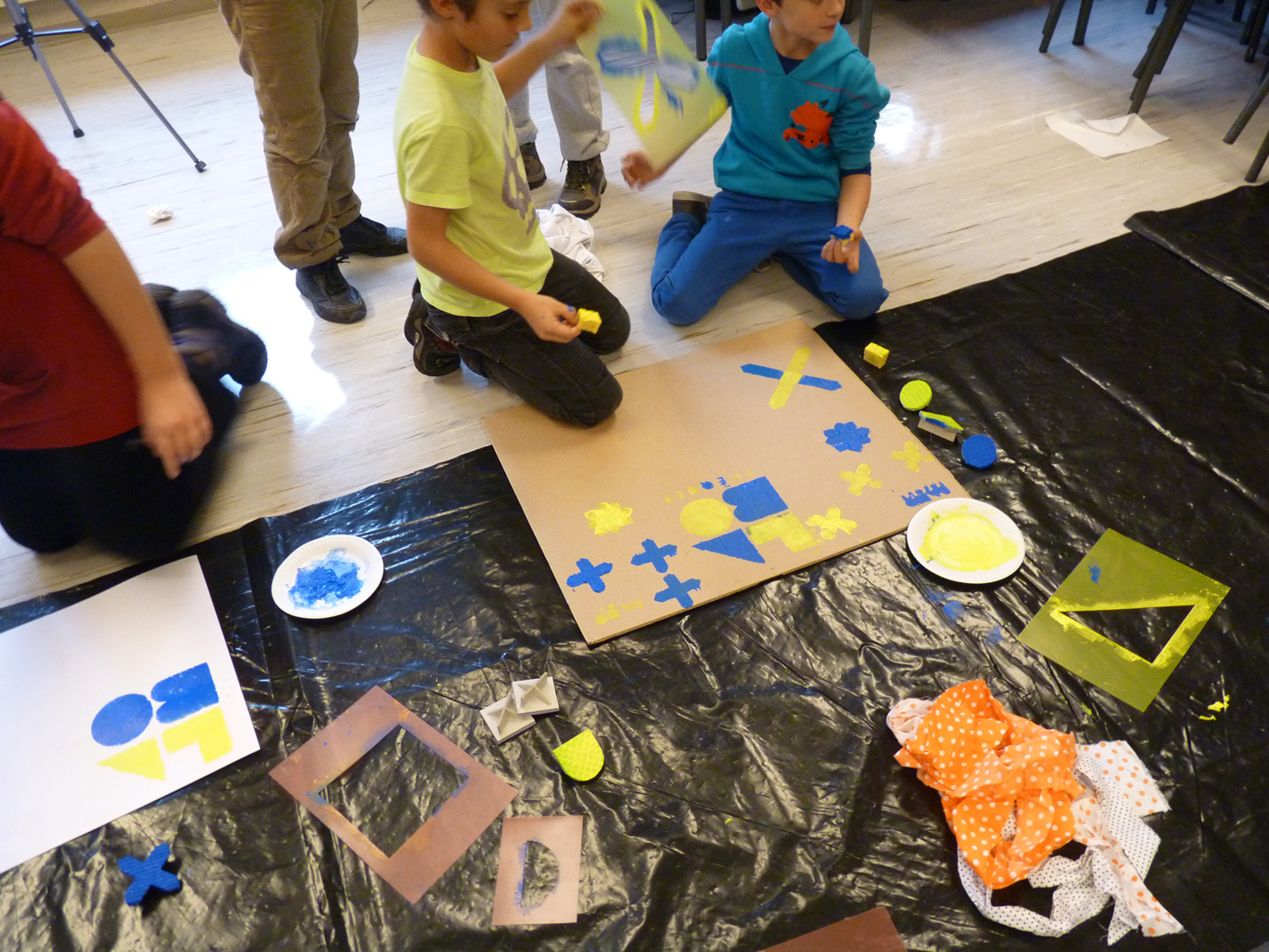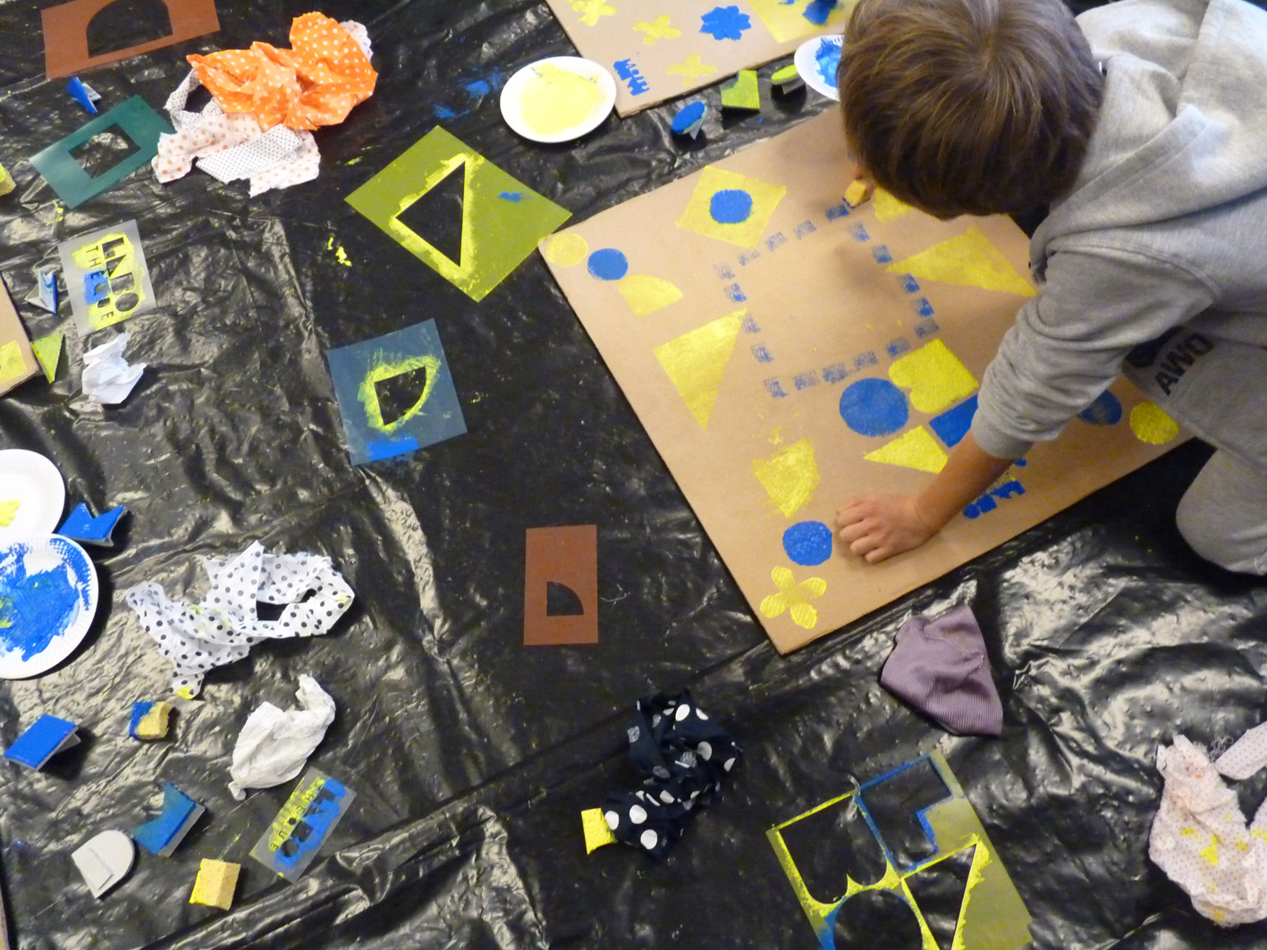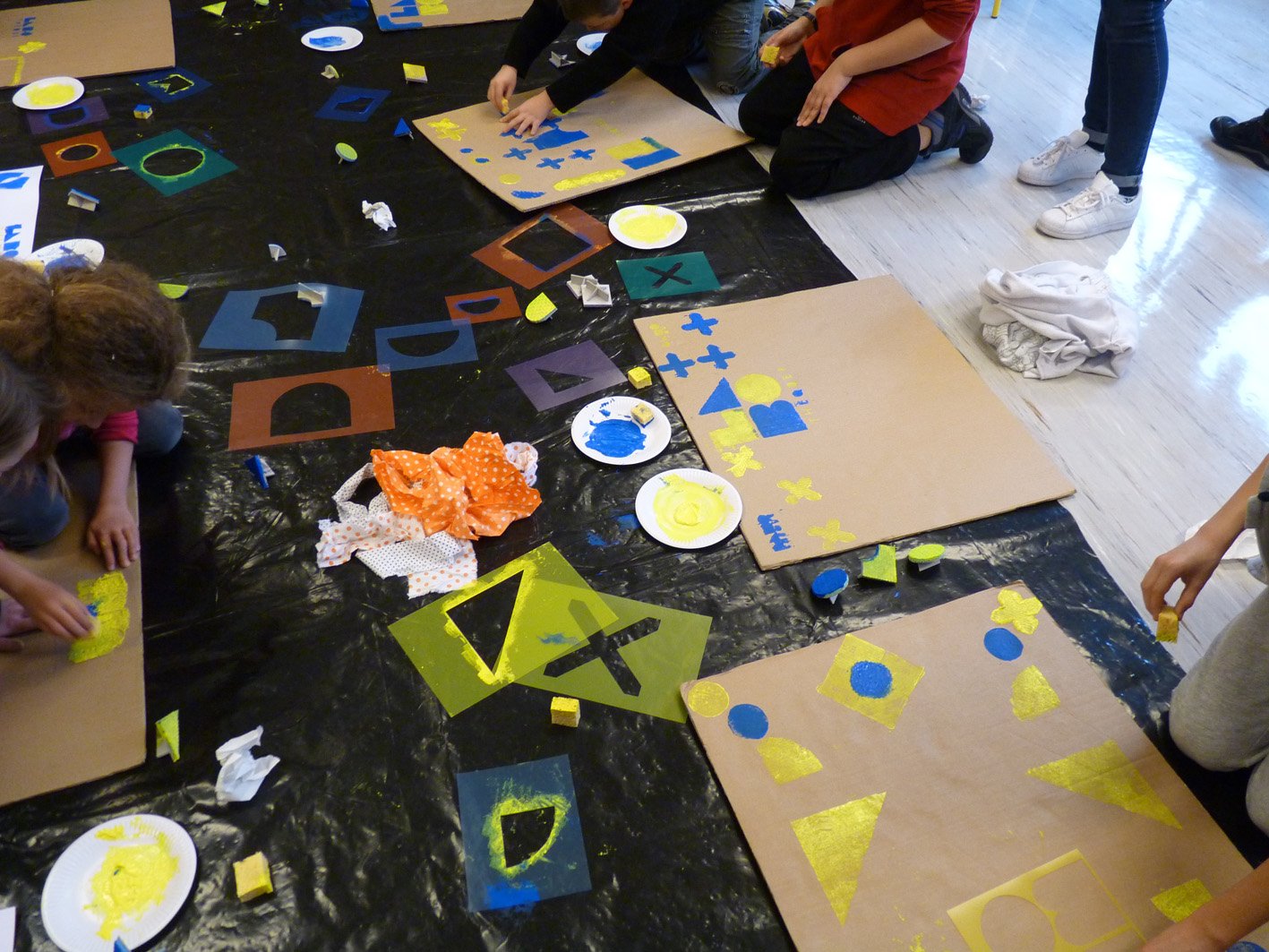 Premier jour de la Labothèque! Aujourd’hui c’est la co-réalisation de la communication avec les enfants de l’école de Neuwiller! Du bleu, du jaune et c’est parti! Les enfants réalisent avec nous des affiches sur du carton que nous affichons directement dans la rue. On réalise aussi des flèches pour la signalétique et les éléments de l’identité sont déclinés sur le sol à l’aide de pochoirs.