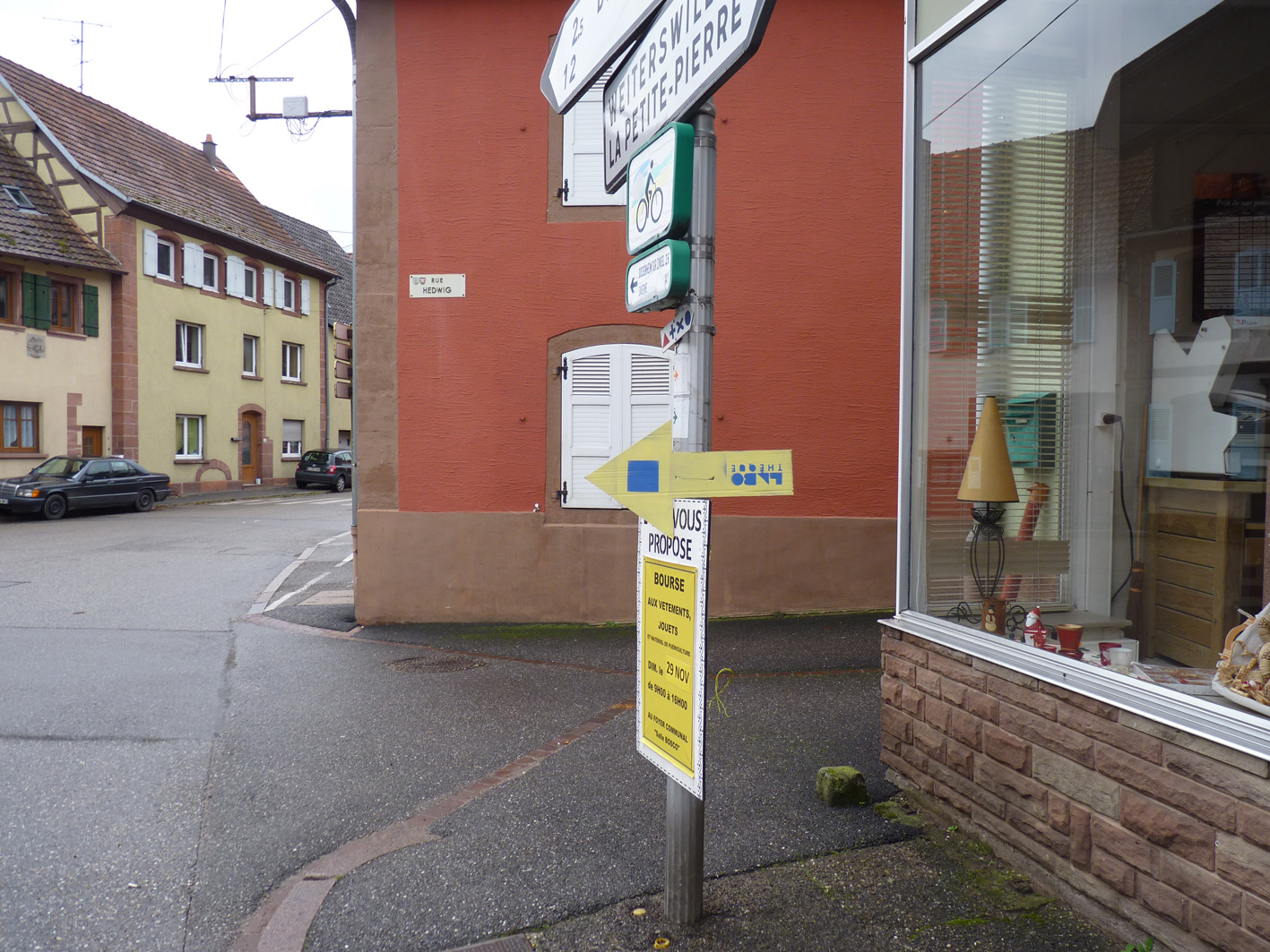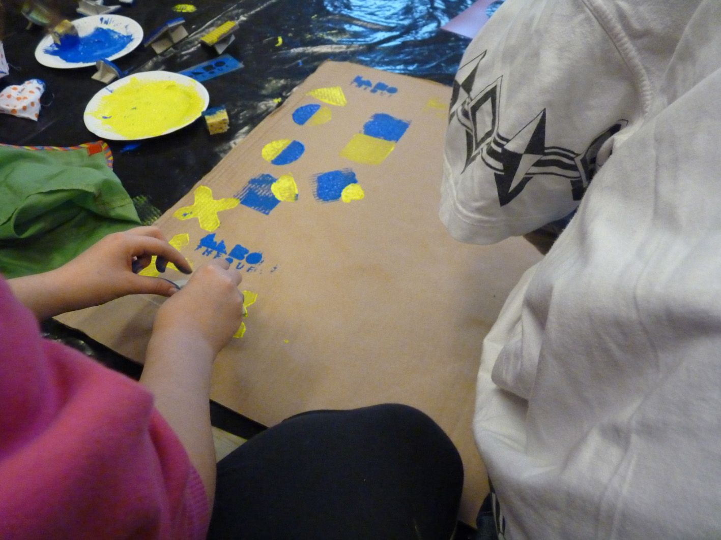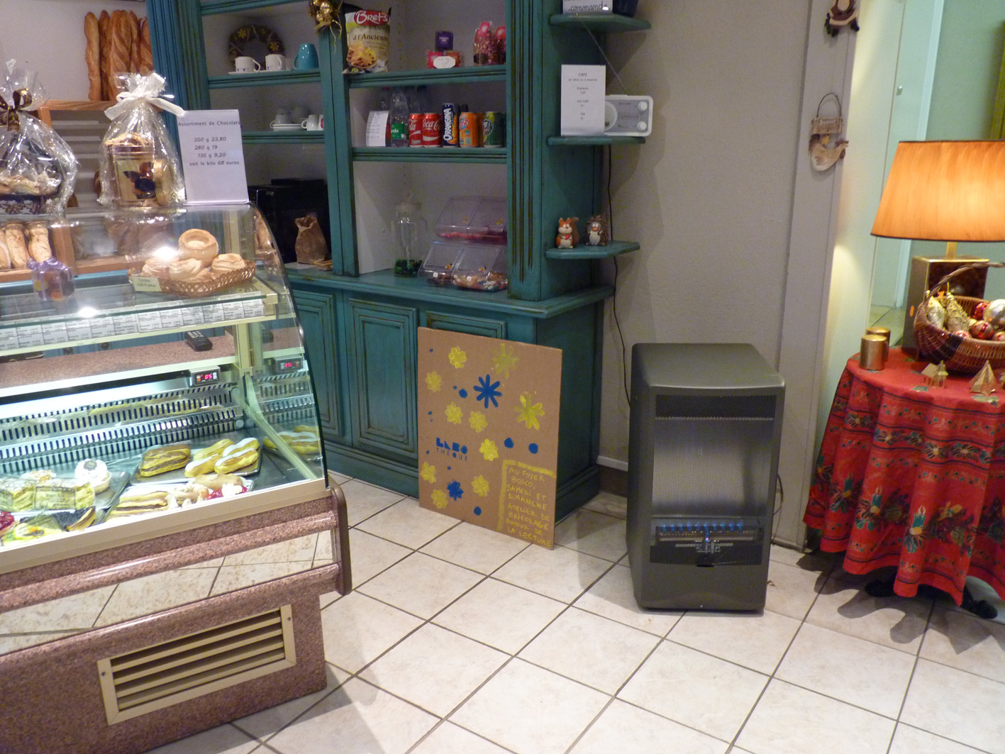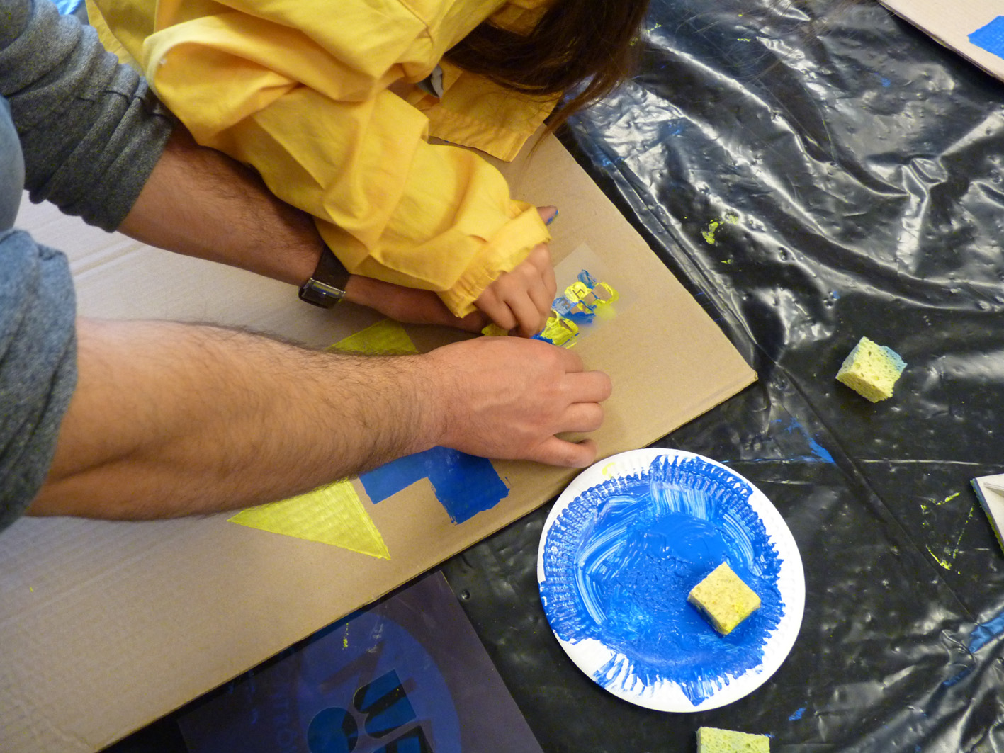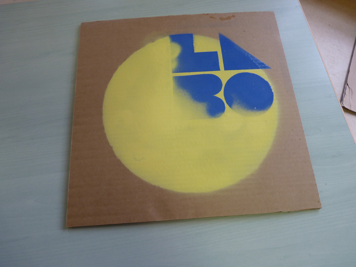 Premier jour de la Labothèque! Aujourd’hui c’est la co-réalisation de la communication avec les enfants de l’école de Neuwiller! Du bleu, du jaune et c’est parti! Les enfants réalisent avec nous des affiches sur du carton que nous affichons directement dans la rue. On réalise aussi des flèches pour la signalétique et les éléments de l’identité sont déclinés sur le sol à l’aide de pochoirs.