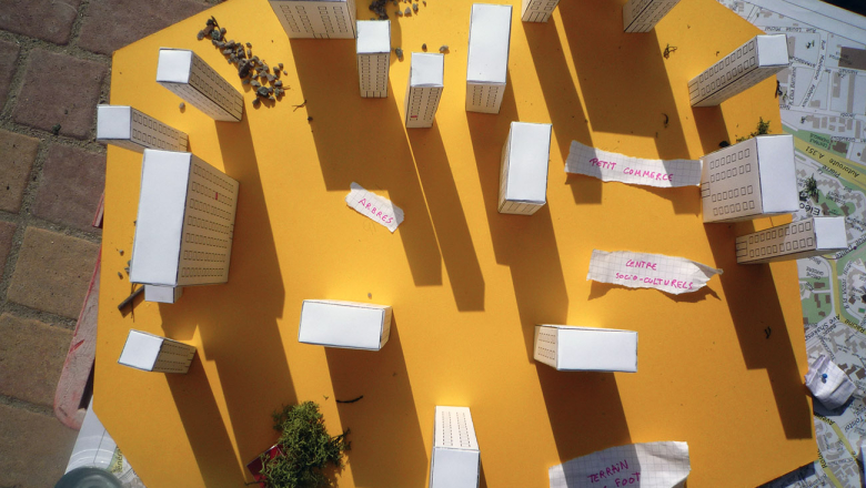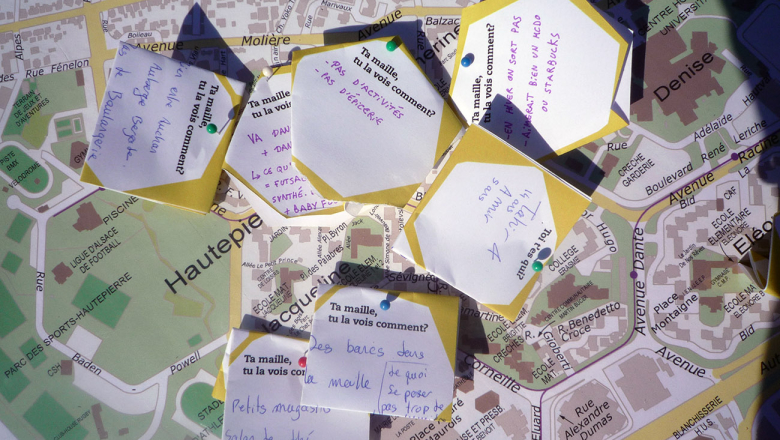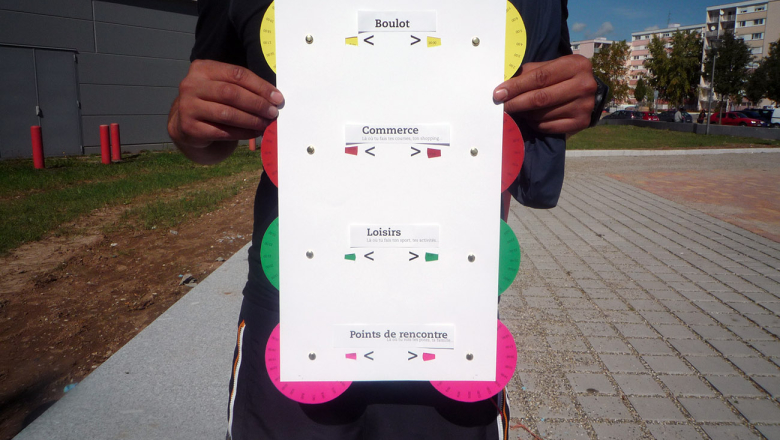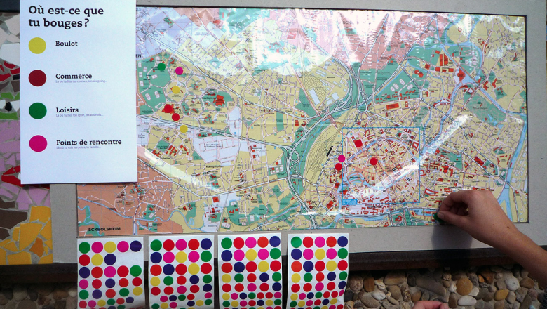 OUh-Ah-OUh Nous voilà sur le terrain pour collecter les informations de vie des habitants de Hautepierre ! Armés de cartes (l’une de Strasbourg Nord-Ouest, l’autre de toutes les mailles de Hautepierre), d’une maquette simplifiée de maille avec des objets à placer dedans (végétation, bâtiments de couleur selon la fonction voulue), et d’un outil-horloge, nous nous installons près de la mairie de quartier.