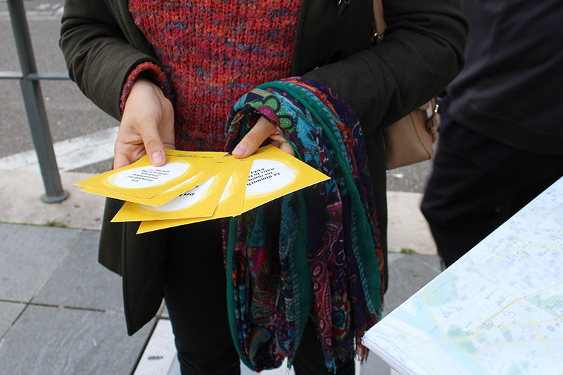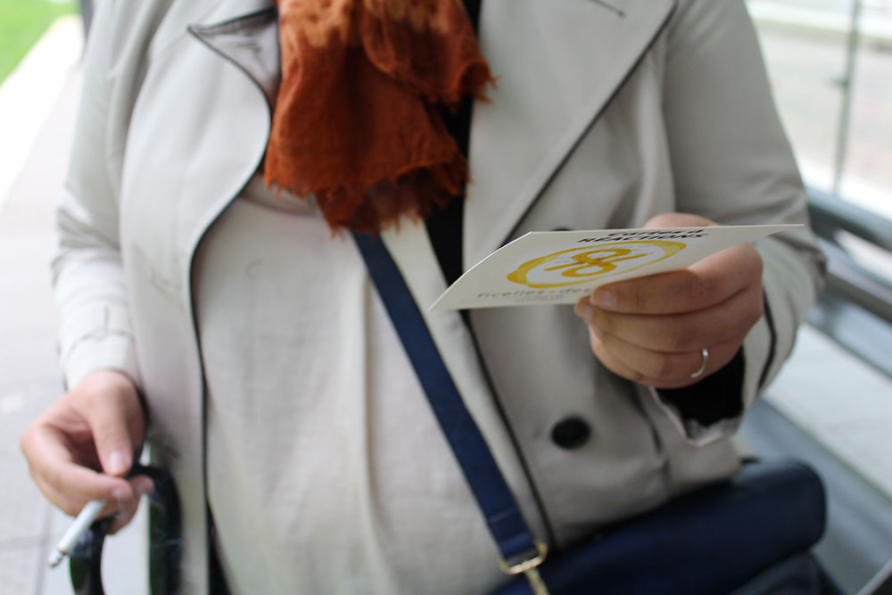 Equipés de nos outils brise-glace, nous sommes allés confronter notre projet à la vision des usagers. Dans notre plus beau costume, à savoir un séduisant panneau fait pour aguicher le public, nous avons arpenté les abords des rames à la recherche de passants avec qui échanger.