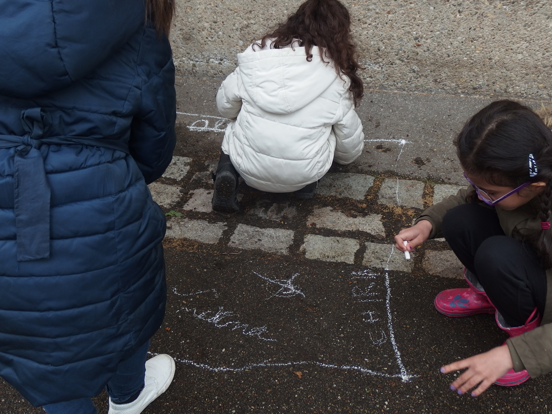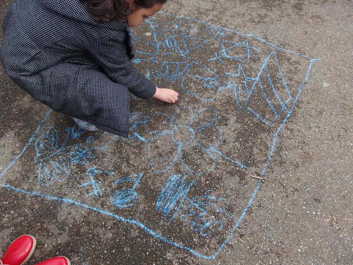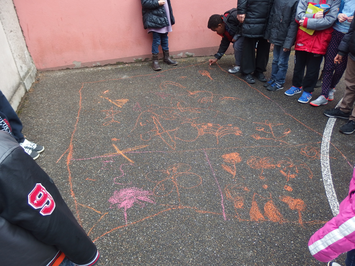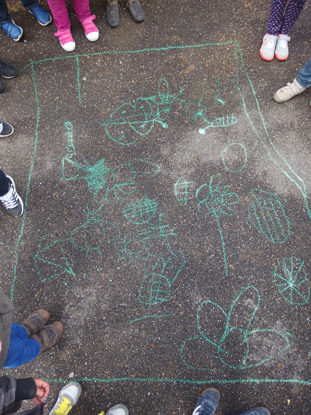 En dessinant son emplacement à la craie dans la cour. Les élèves dessinent aussi les futurs légumes, insectes, et plantes qu’ils veulent voir pousser.