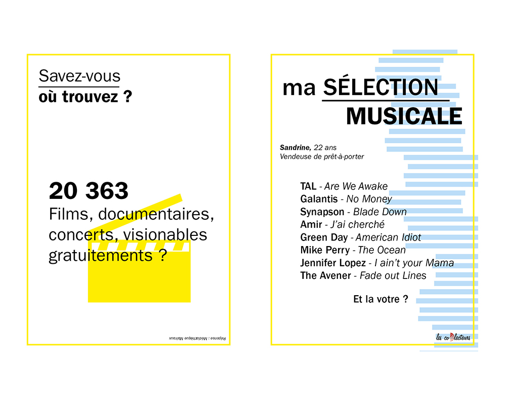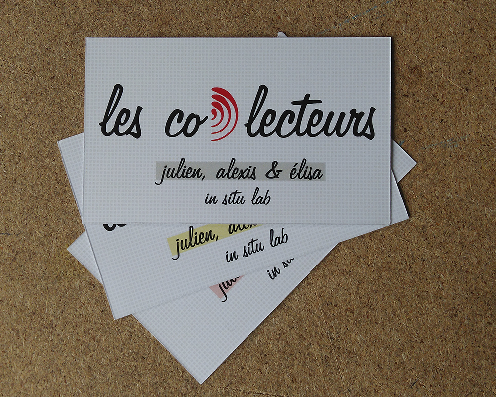 Notre thème : “Comment permettre aux habitants de participer à la vie de la collection ?”, tend donc à traiter du son. Cependant, nous devons comme l’exprime l’interrogation, s’intéresser à la notion de collection, la définir, et la mettre en valeur. Après une première approche nous avons compris la question comme un désir de faire participer une population qui n’a pas toujours les clés pour intervenir dans la vie de la collection.Ainsi nous dirigeons notre identité graphique vers l’idée de pratiquer une action précise de manière collective, par des termes tels que “les collecteurs” “les lecteurs” “les Co-lecteurs” tout en reprenant l’idée de faire écho. Par le jeu de mot mais aussi par l’élément graphique rouge. La notion d’écho semble être importante. En effet, après une brève étude de la médiathèque Malraux, certains éléments semblent défaillants pour ce qui est de la communication. La population n’est pas réellement informée sur la collection, pourtant très complète, de la médiathèque. Mais cette interactivité se représente aussi aujourd’hui par l’accès rapide aux informations, par la technologie. Ainsi cet élément rouge représente aussi indirectement la signalétique du wifi, de l’accès facile aux informations. L’identité se dévoile finalement sous le nom de Les co/lecteurs, en référence aux éléments évoqués précédemment.