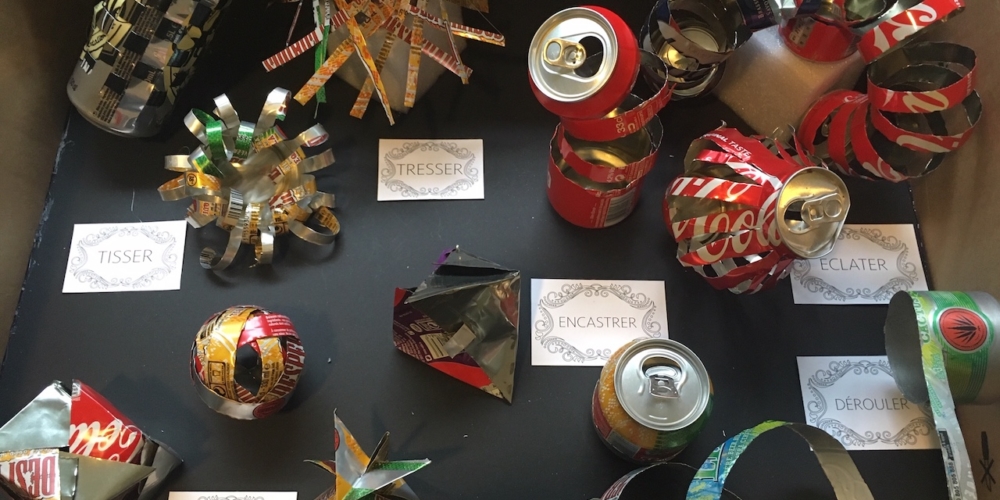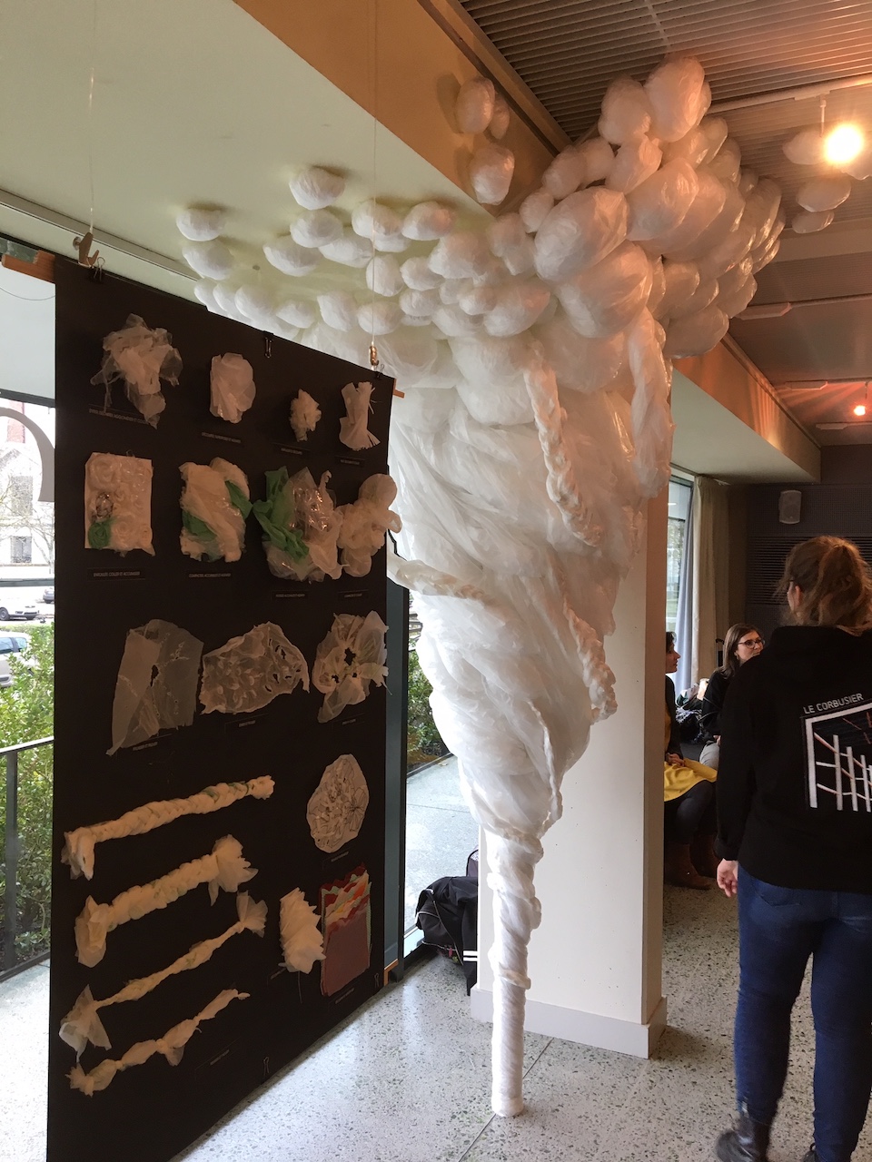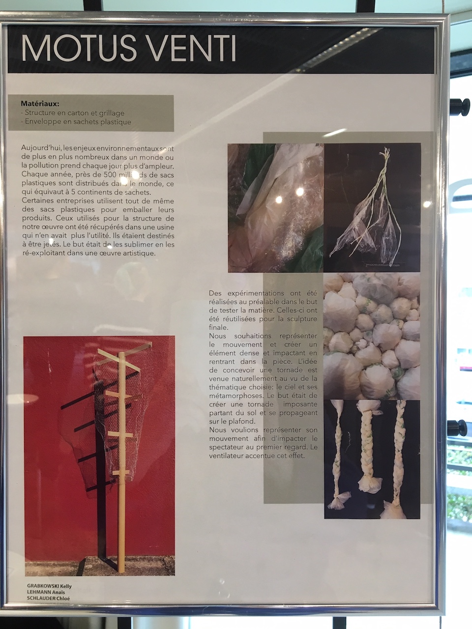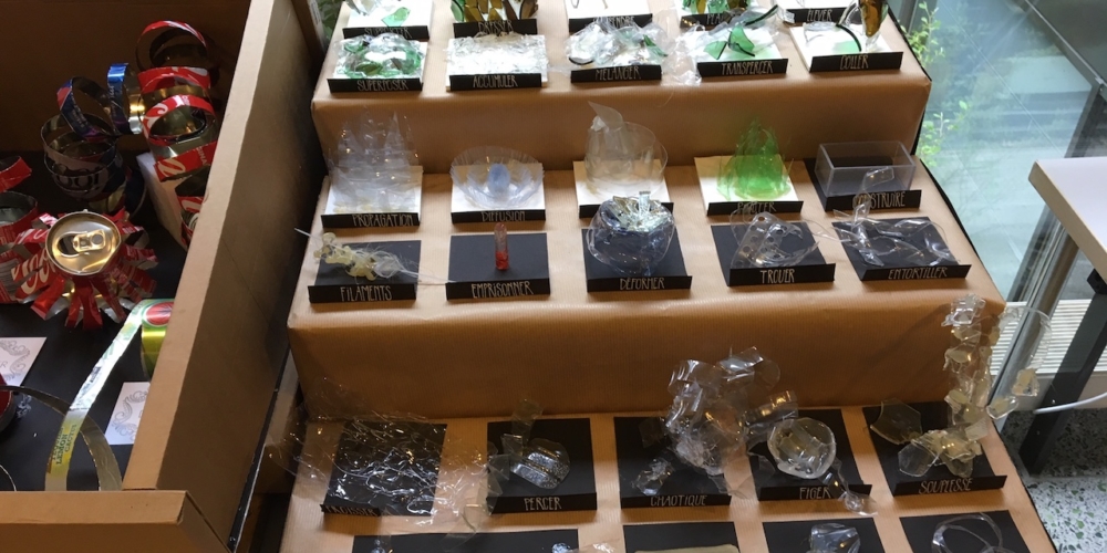 Quelques contraintes ont été proposées aux TS2DP, notamment le fait de prendre comme point de départ un des 4 éléments : eau, air, terre ou feu. Ils devaient également s’approprier une famille de matériaux de rebut : plastique, papier et carton, verre, métal.