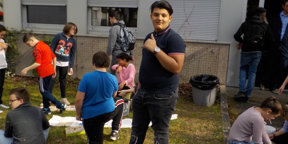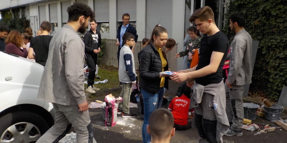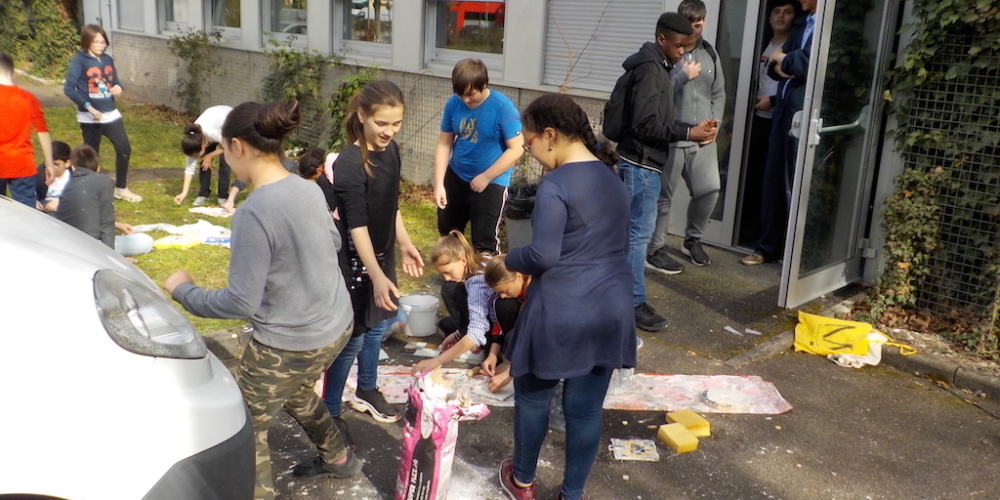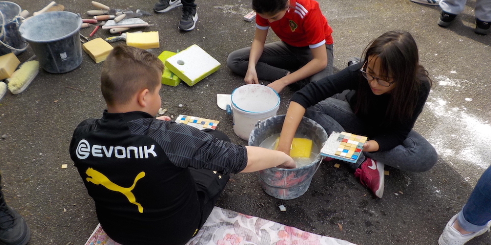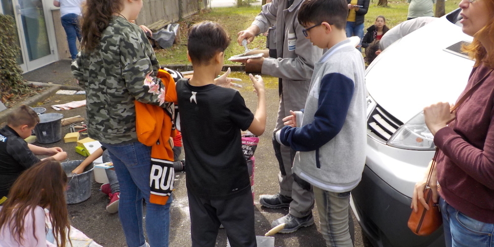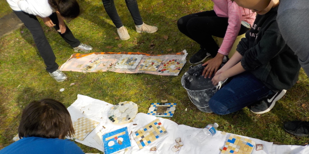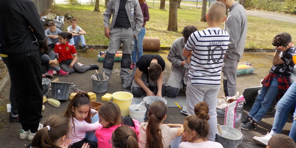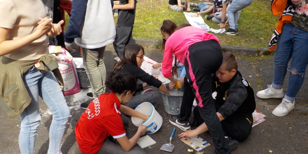 L’outillage et l’appui technique des élèves du lycée ont été d’une grande aide pour bien mener l’action, et ont permis la rencontre des plus jeunes avec des lycéens investis dans leur futur métier de carreleurs-mosaïstes.