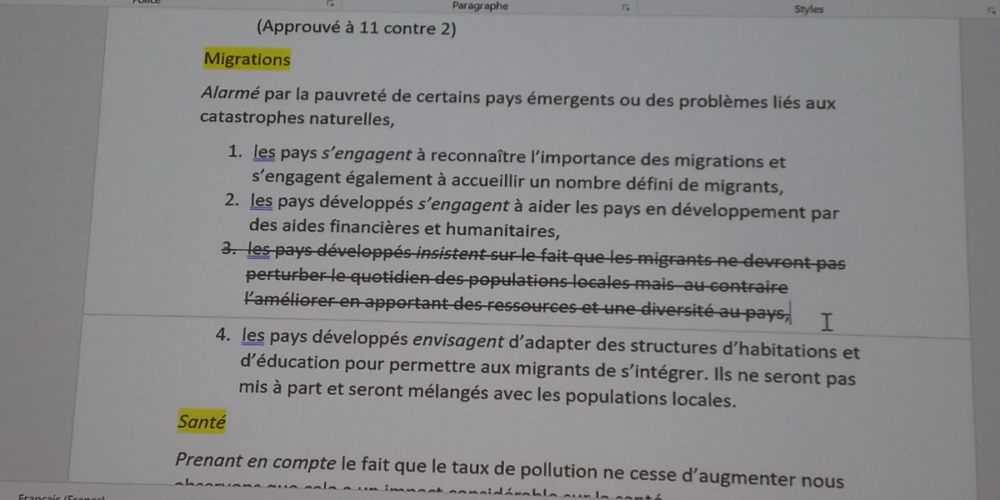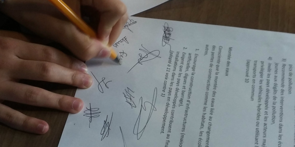 Initié par le Planétarium & Jardin des Sciences de l’université de Strasbourg, ce projet a réuni nos élèves de 2GT2, 2GT3 et 2GT4 et une classe du lycée Jean Monnet de Strasbourg. Durant tout le troisième trimestre, les élèves ont pris la peau des différents acteurs d’une négociation climatique : les ambassadeurs des pays représentés dans la commission, les lobbies et ONG défendant leurs intérêts, les membres organisateurs de la COP ainsi que le groupe médias. Ils ont complété des fiches de synthèse avec les données climatiques sur chaque Etat, avant de réfléchir à des propositions qui ont été discuté lors de la simulation.