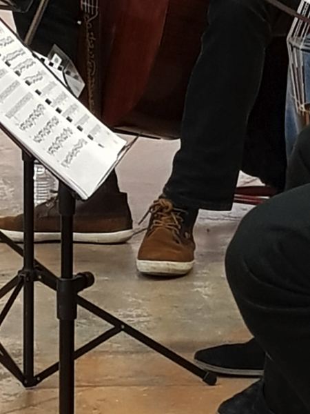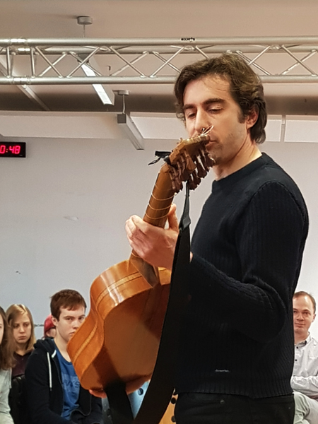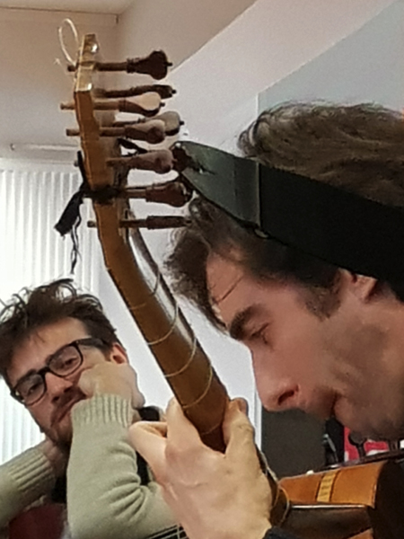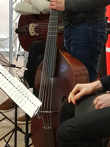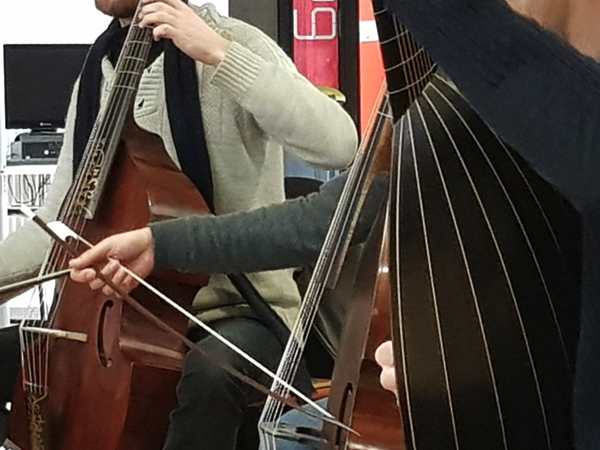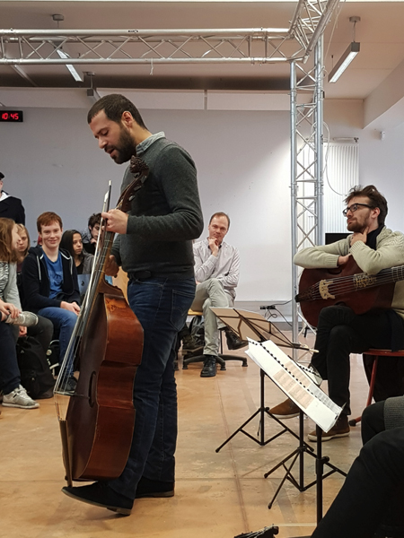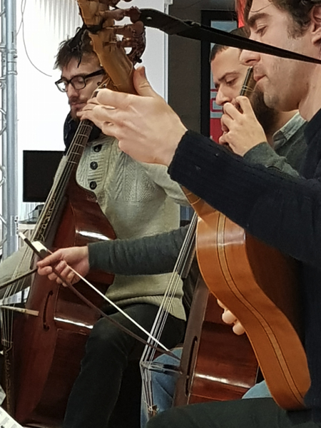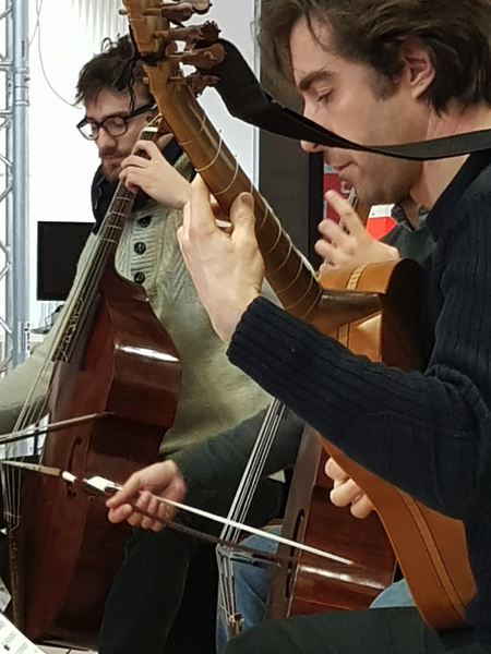 Cette année, c’est l’ensemble l’Achéron qui s’est rendu dans nos murs : François Joubert-Caillet et Robin Pharo aux violes de gambe ainsi que Miguel Henry au théorbe et à la guitare baroque. La musique de Marin Marais et Robert de Visée a ainsi résonnée au grand atelier : musique très sobre et intime, composées et jouées, par Marais et de Visée, pour reposer le roi Louis XIV après ses longues journées. Cette musique évite donc les excentricités et se concentre sur le beau son grave et charnu de la viole ainsi que sur le rythme qui est tantôt lancinant tantôt très marqué par la danse (dans sa jeunesse Louis XIV était un excellent danseur). Ce sont ainsi succédées le « grand ballet » la « la fête champêtre », la « chaconne des Arlequins », les « couplets de folie » etc.