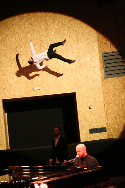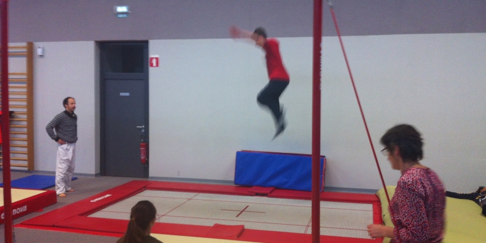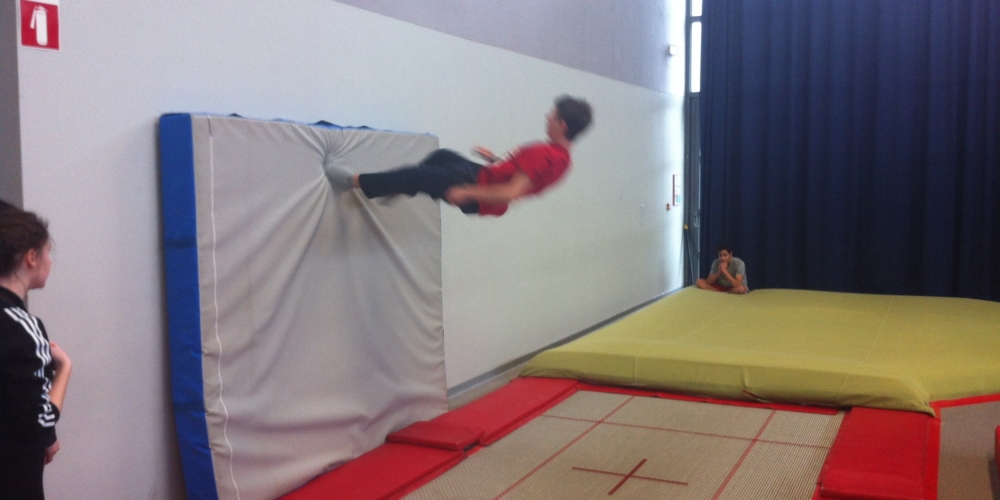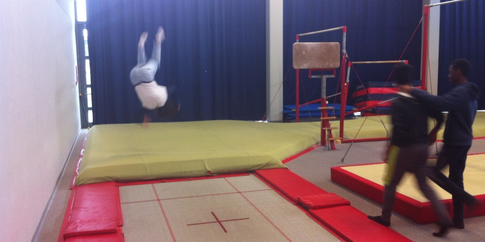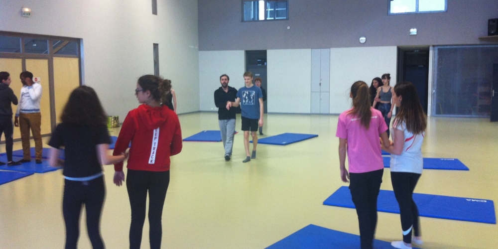Le projet a été mené en plusieurs étapes. Tout d’abord, les deux classes ont été conviées au spectacle « Piano sur le fil » au Maillon. Aux sons orientaux de la musique « live » de Bachar Bar Khalifé, cirque, acrobaties et danse étaient au programme. Dès le lendemain, quelques artistes de la compagnie sont venus au gymnase du lycée pour rencontrer nos lycéens et les initier à quelques techniques artistiques dans la magnifique salle de gymnastique mise à notre disposition par le service des sports de la ville d’Illkirch. Trampoline, acrobaties, exercices de relaxation et expression corporelle étaient au programme de la matinée. D’abord intimidés de voir de près les artistes qui les avaient fait vibrer et qu’ils avaient applaudi la veille, mais rapidement mis en confiance par ces derniers, nos lycéens ont vite osé quelques figures acrobatiques spectaculaires avant de discuter avec les intervenants. De nombreuses questions relatives à la « vie d’artiste » ont été posées : formation, conception des numéros de cirque, préparation des tournées, vie de famille…