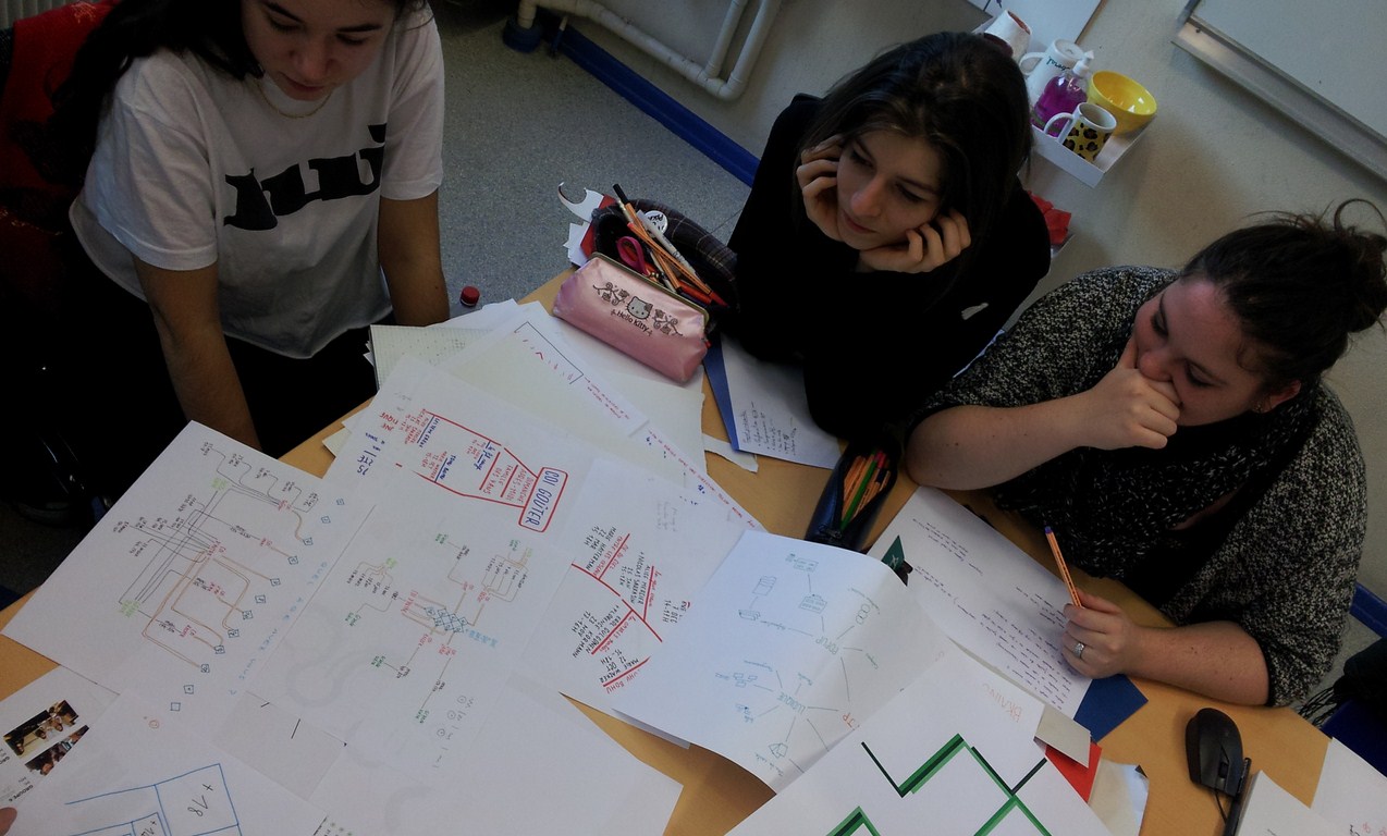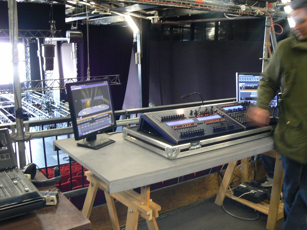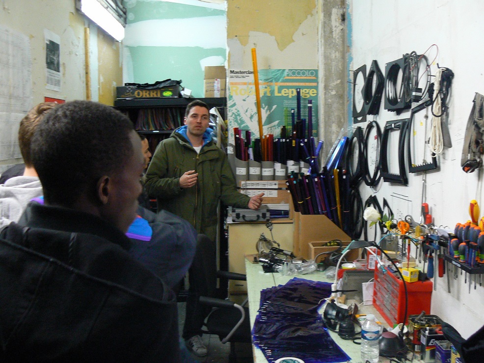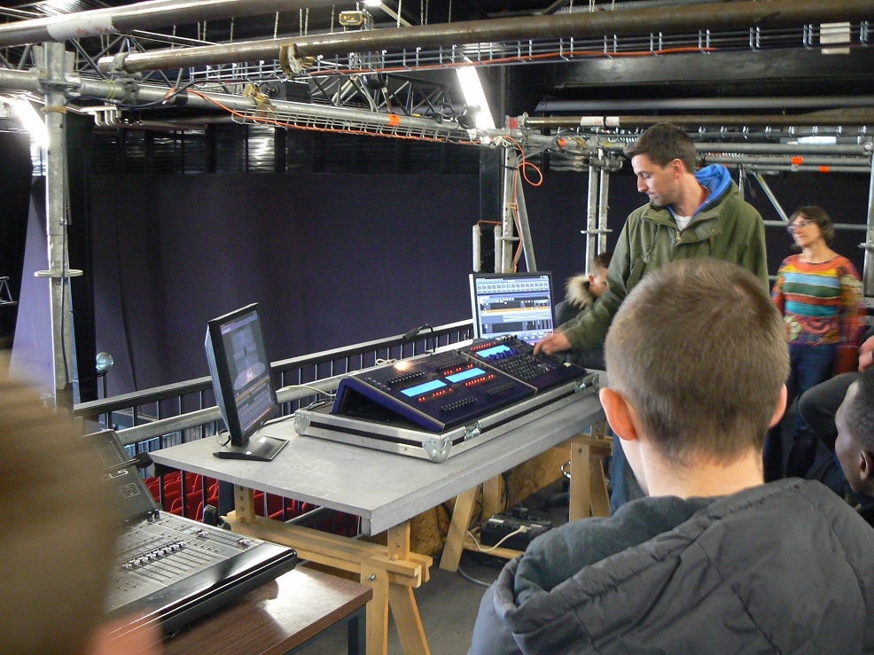 Ils ont d’abord été accueillis par Madame Cogny qui coordonne ce projet avec nous depuis plusieurs années. Puis ils ont participé à des ateliers. Au cours de l’après-midi, avec Antonio, directeur technique du Maillon, ils ont approfondi leurs connaissances techniques à partir du plan de scène du spectacle « Daral Shaga » vu au mois de décembre et que le théâtre du Maillon avait transmis pour une étude préalable en classe. A partir de ce document, ils ont pu se rendre compte concrètement de ce qu’il était possible de faire ou non au théâtre du Maillon pour accueillir le spectacle : critères de faisabilité (dimensions de la scène, hauteur, ouvertures…), matériel nécessaire (disponible au théâtre ou apporté par la compagnie), conditions de travail des artistes et techniciens de la compagnie, coordination entre ces derniers et ceux du théâtre du Maillon… Avec Manu, un de ces techniciens, ils ont visité le théâtre et ses locaux techniques. Ils se sont familiarisés avec les termes de langage utilisés, avec le matériel (câbles, lampes, spots…) qu’ils ont pu manipuler et utiliser. Ils ont également vu comment la salle était préparée avant un spectacle, comment et où s’accrochaient les appareils électriques… La visite s’est achevée par une démonstration dans la régie « son et lumière ».