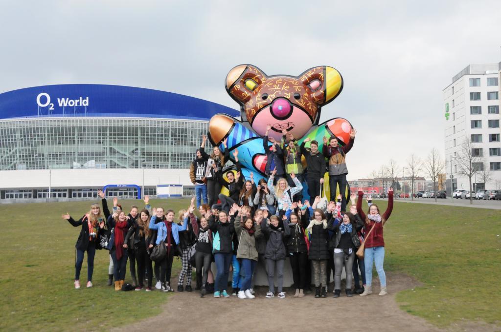 Berlin fut la destination suivante du programme, le groupe de 40 personnes s’y est rendu en train le lendemain. Dès l’arrivée dans la capitale, les élèves ont savouré une partie de l’East-Side-Gallery, célèbre morceau du mur de Berlin de 1,3 km de long situé près du centre de la ville, qui sert de support pour une exposition d’œuvres de street art. Puis le groupe s’est rendu à pied et sous la pluie depuis l’Alexander Platz avec le Fernsehturm à la Porte de Brandebourg en longeant l’avenue Unter den Linden et en passant par la Museuminsel (l’Ile aux Musées), le Berliner Dom (cathédrale de Berlin) pour gagner enfin le Reichstag.