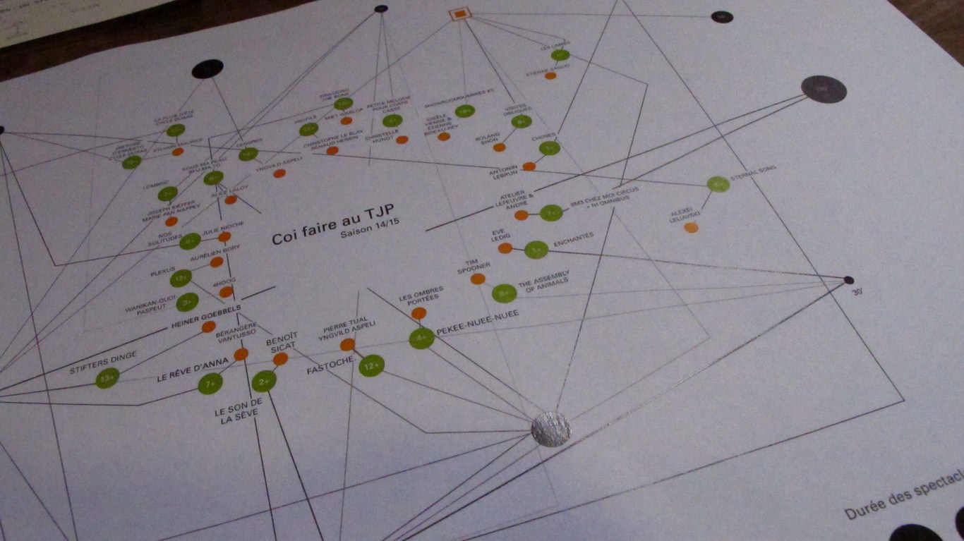 En résidence au TJP le week-end du 5 et 6 juin, les étudiants de première année du BTSDesign G raphique option MN (médias numériques) et MI (médias imprimés) exposeront le fruit de leurs recherches exploratoires concernant un travail de cartographie permettant une meilleure lisibilité de l’offre culturelle proposée par le TJP.