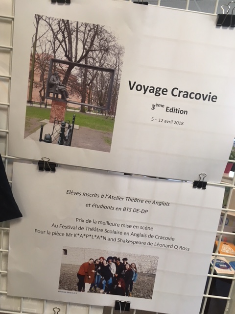 Cette année c’était la troisième participation d’élèves du Lycée le Corbusier au « English Theatre School Festival » de Cracovie. Cette fois encore la prestation de nos élèves de 1ères S et L inscrits à l’atelier théâtre a été récompensée par un prix, celui de la meilleure mise en scène.